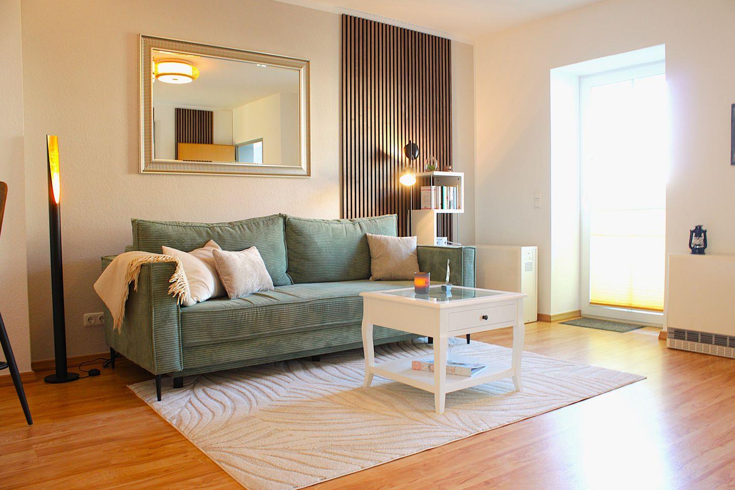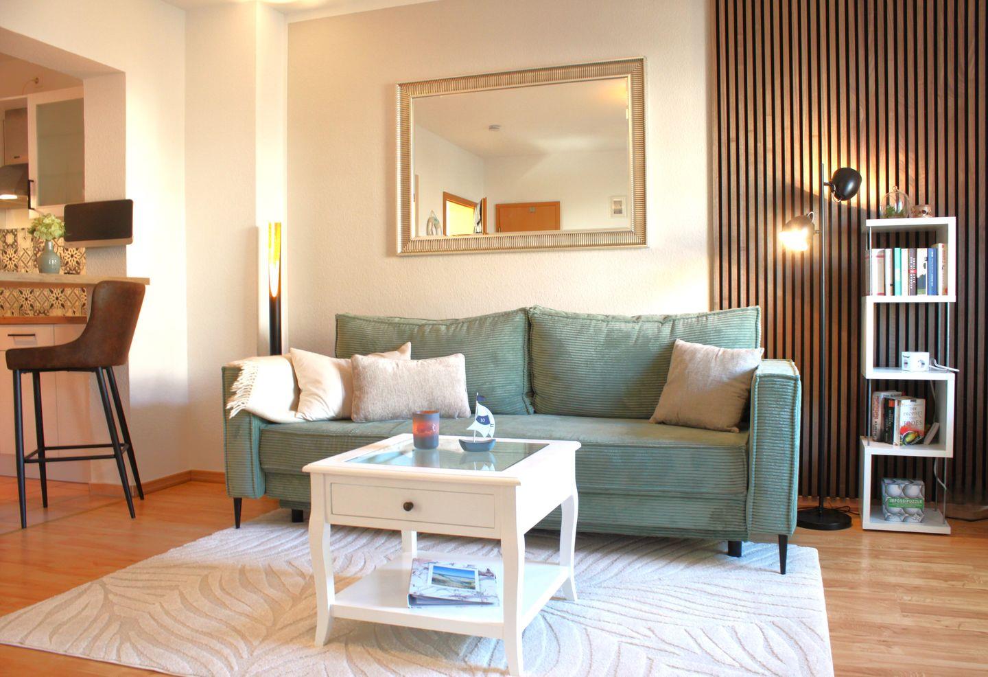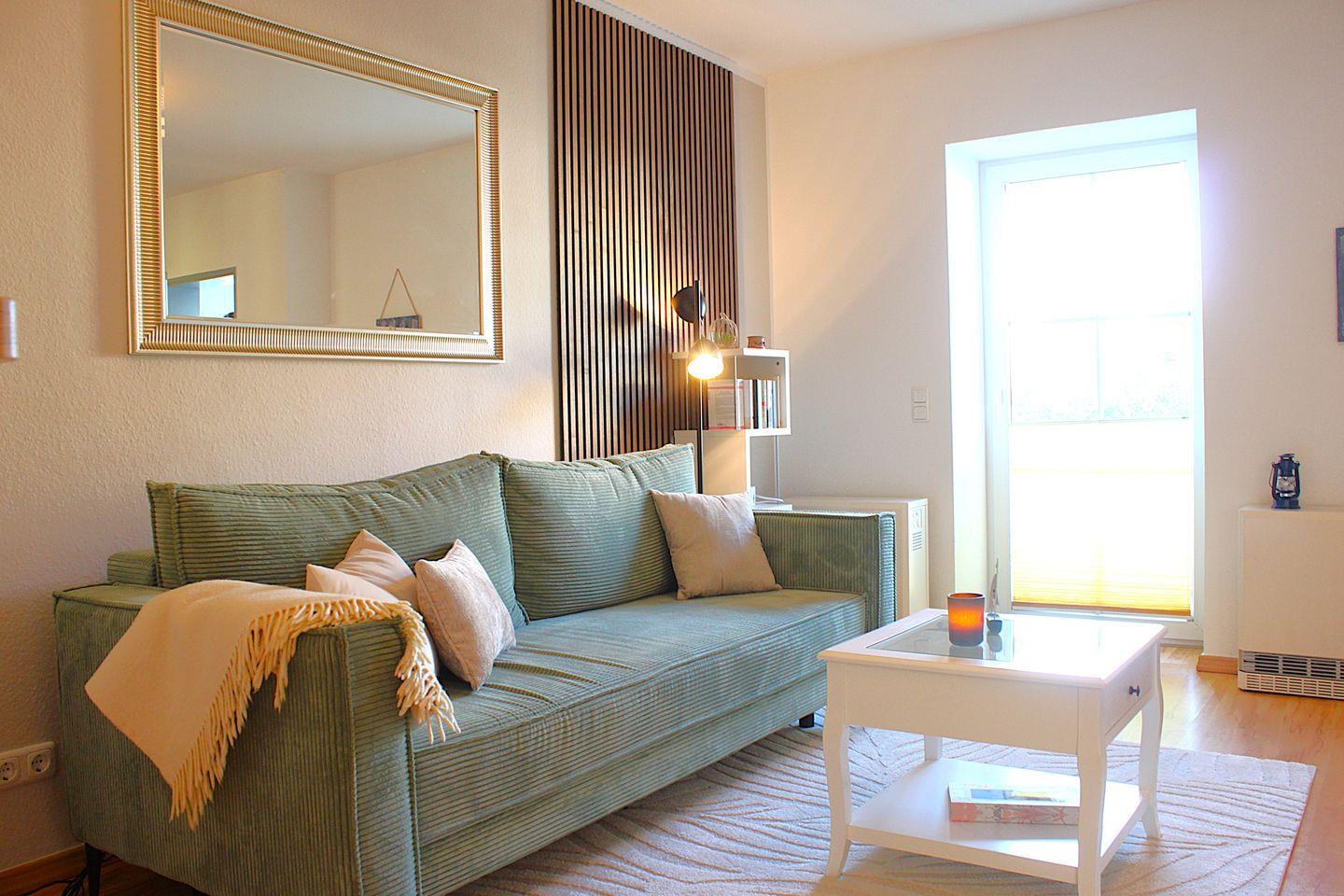 Moderne Ferienwohnung Flaschenpost auf Poel, nur 100 m vom Strand mit Balkon und teilweisem Meerblick.
