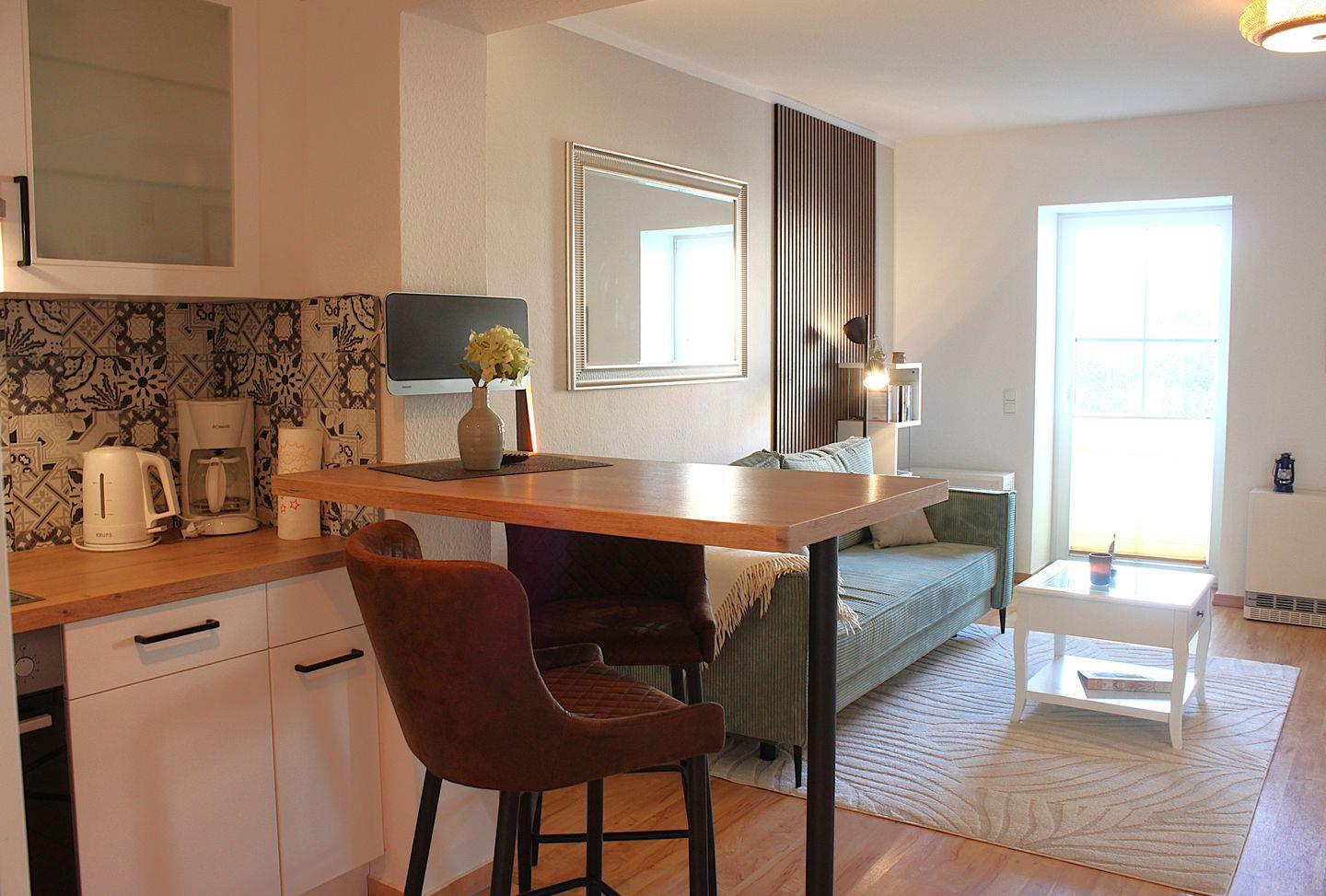 Ein kombinierter, heller Wohn- und Essbereich ist mit einem Sofa, TV-Gerät und WLAN ausgestattet und lädt zu gemütlichen Stunden ein. Außerdem befindet sich hier der Zugang zum möblierten Balkon, auf dem Sie schöne Urlaubsstunden mit teilweisem Meerblick verbringen können. Die Küche ist ebenfalls in den offen gestalteten Raum integriert und bietet neben einem modernen Gesamtbild viele technische Geräte und Ausstattungen, die eine optimale Selbstversorgung ermöglichen.
