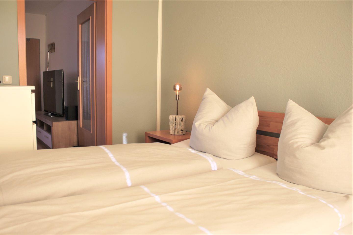 Das separate Schlafzimmer verfügt über ein komfortables Doppelbett, eine Kommode für Ihre Kleidung und den Zugang zum zweiten möblierten Balkon. Im Badezimmer mit Fenster steht eine Dusche, ein WC, Waschbecken und Föhn für Sie bereit.