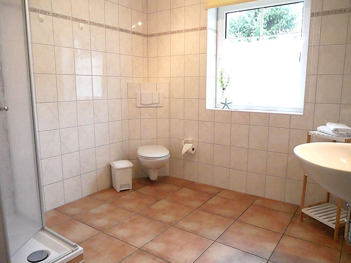Das große Badezimmer bietet Ihnen eine Dusche mit tiefem Einstieg, Waschtisch, WC und Föhn.