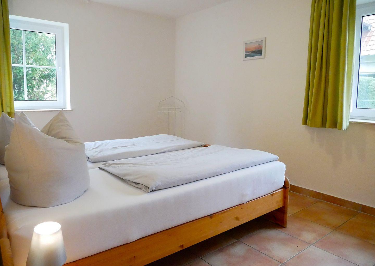 Das Schlafzimmer ist mit einem Doppelbett (180x200cm/getrennte Matratzen) und einem Kleiderschrank möbliert.