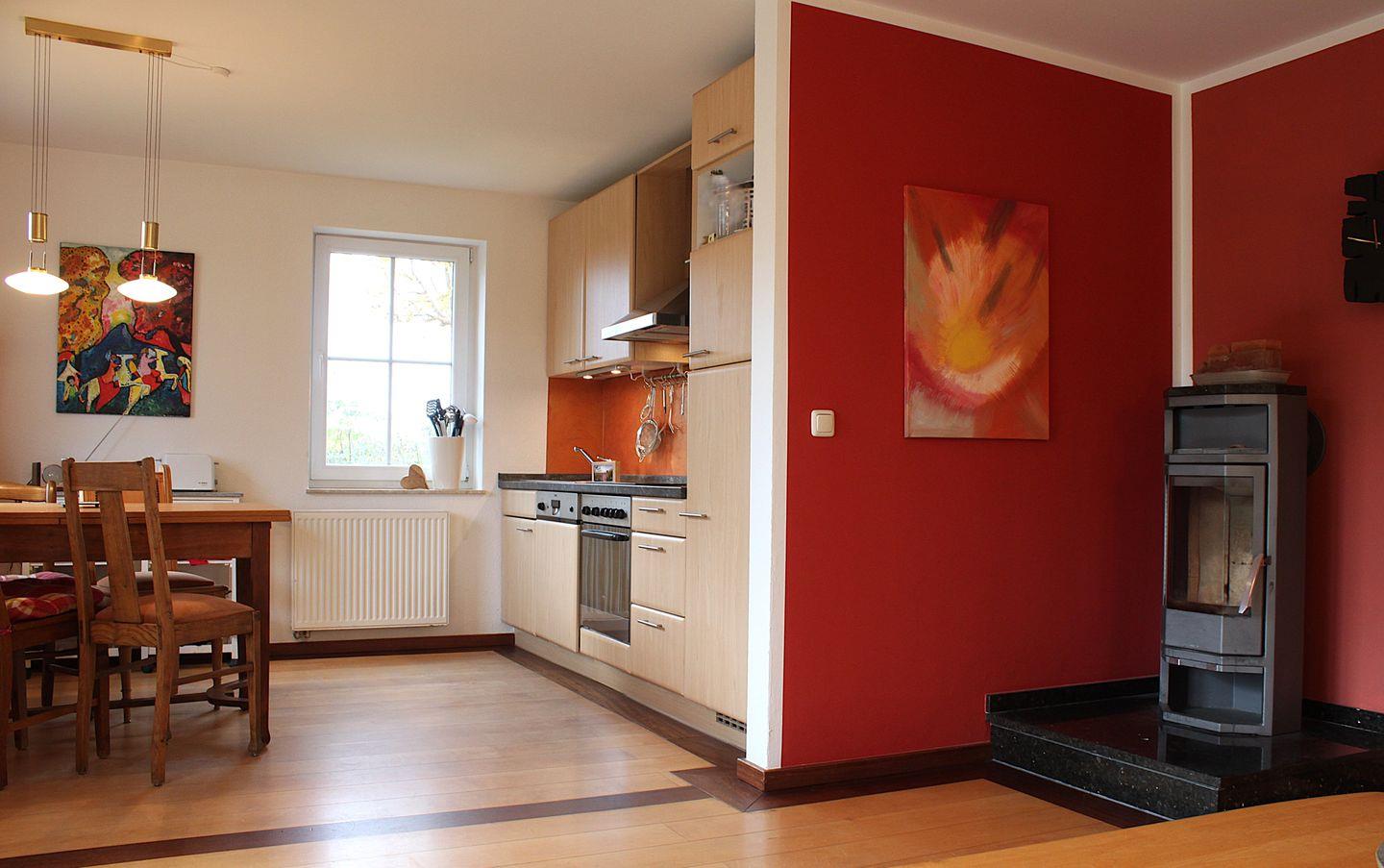 Ein offen gestalteter Wohn- und Essbereich mit integrierter Küche lädt zu geselligen Kochabenden mit der ganzen Familie ein. Sie verfügen über eine gemütliche Sofaecke mit TV-Gerät, DVD-Player, Wlan und Kamin, einen großzügigen Esstisch und Zugang zur möblierten Terrasse mit Blick auf die umliegende Natur.