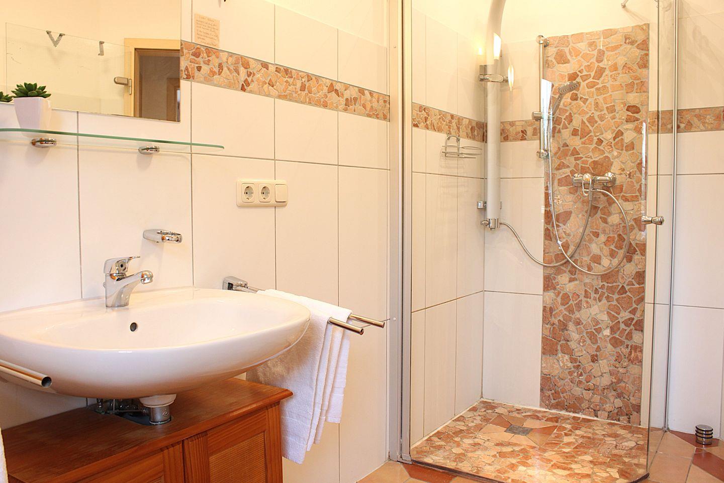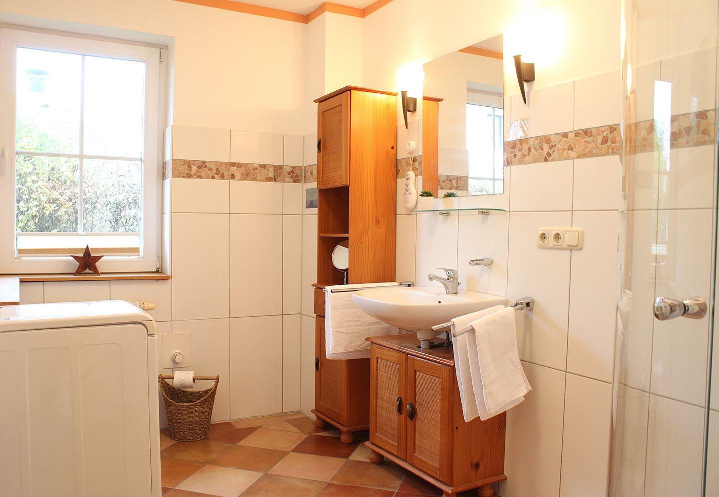 Das Badezimmer ist mit einer ebenerdigen Dusche, Waschtisch, WC und einer Waschmaschine ausgestattet und bietet gute Voraussetzungen für einen angenehmen Start in den Tag.