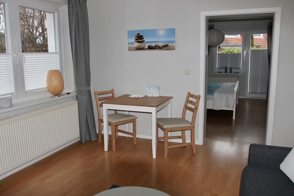 Die Wohnung liegt im EG mit Terrasse und separatem Kfz.-Stellplatz Sie hat getrennte Wohn- und Schlafzimmer, eine voll eingerichtete Küche mit Fenster und ein Bad mit Duschbadewanne und Außenfenster. Neues Inventar!! Genießen Sie eine absolut ruhige Schlaflage und einen kostenlosen WLAN-Anschluß, Kabelfernsehen mit neuestem Gerät, Terrassenmöbel sind vorhanden . Zusätzliche Gartenbenutzung mit Grill inklusive! Bei Bedarf besteht die Möglichkeit eine dritte Person aufzunehmen. Dieses bedarf jedoch einer besonderen Absprache. Sehr geeignet für Golfer und Fahrradfahrer (Fahrradkeller vorhanden).