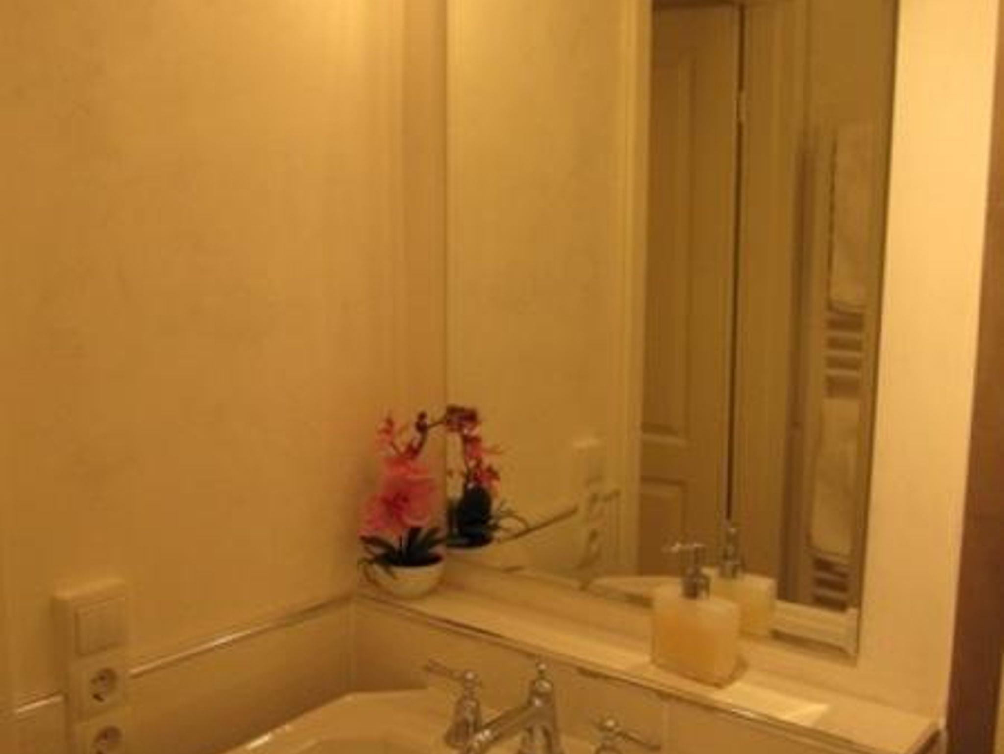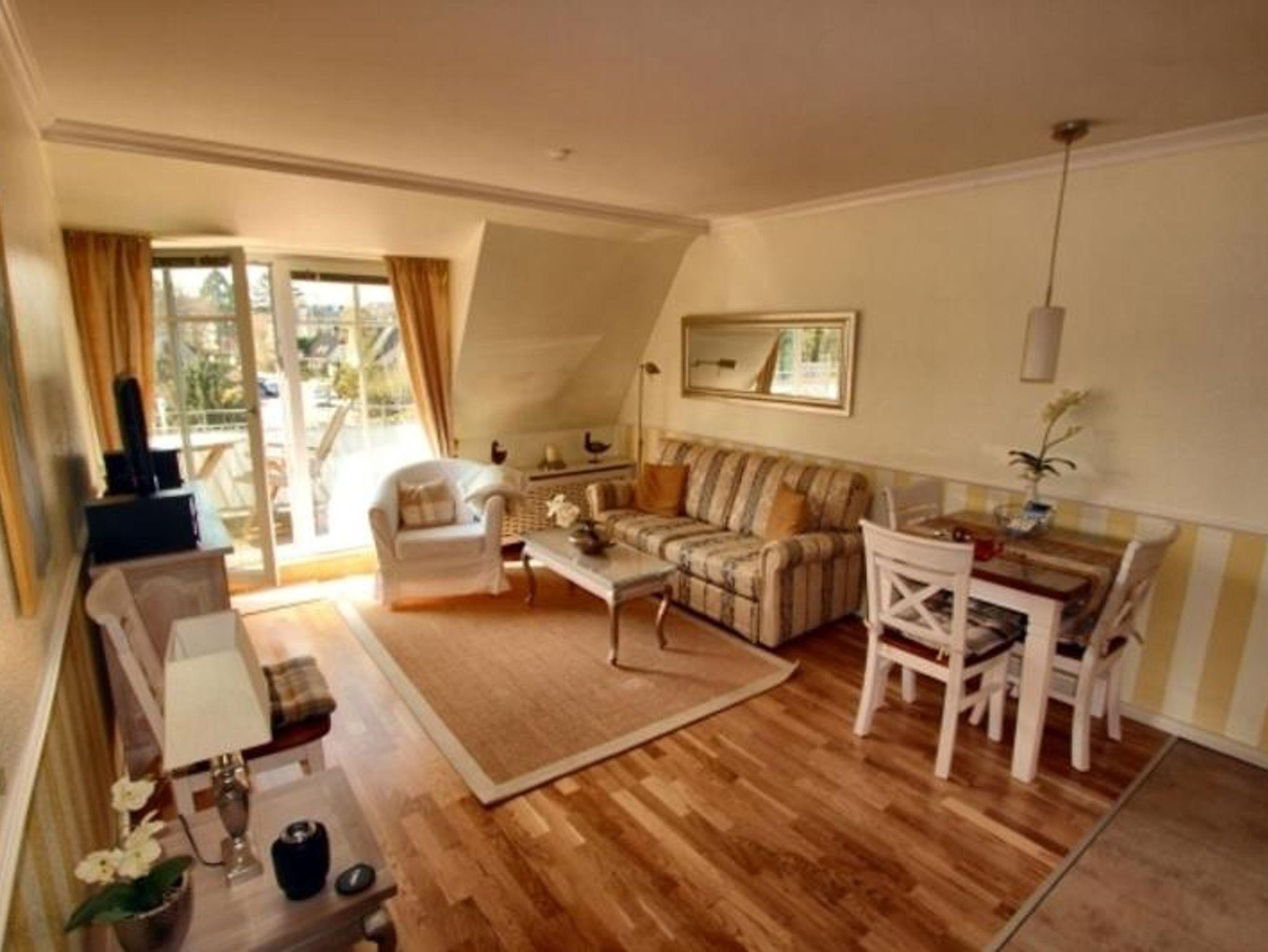 Wohnzimmer mit Zugang zum großen Südbalkon, Flachbildfernseher mit DVD und Steroanlage. Separates Schlafzimmer. Alle Räume sind mit edlem Eichenparkett belegt. Elegantes, hochwertig ausgestattetes Duschbad.