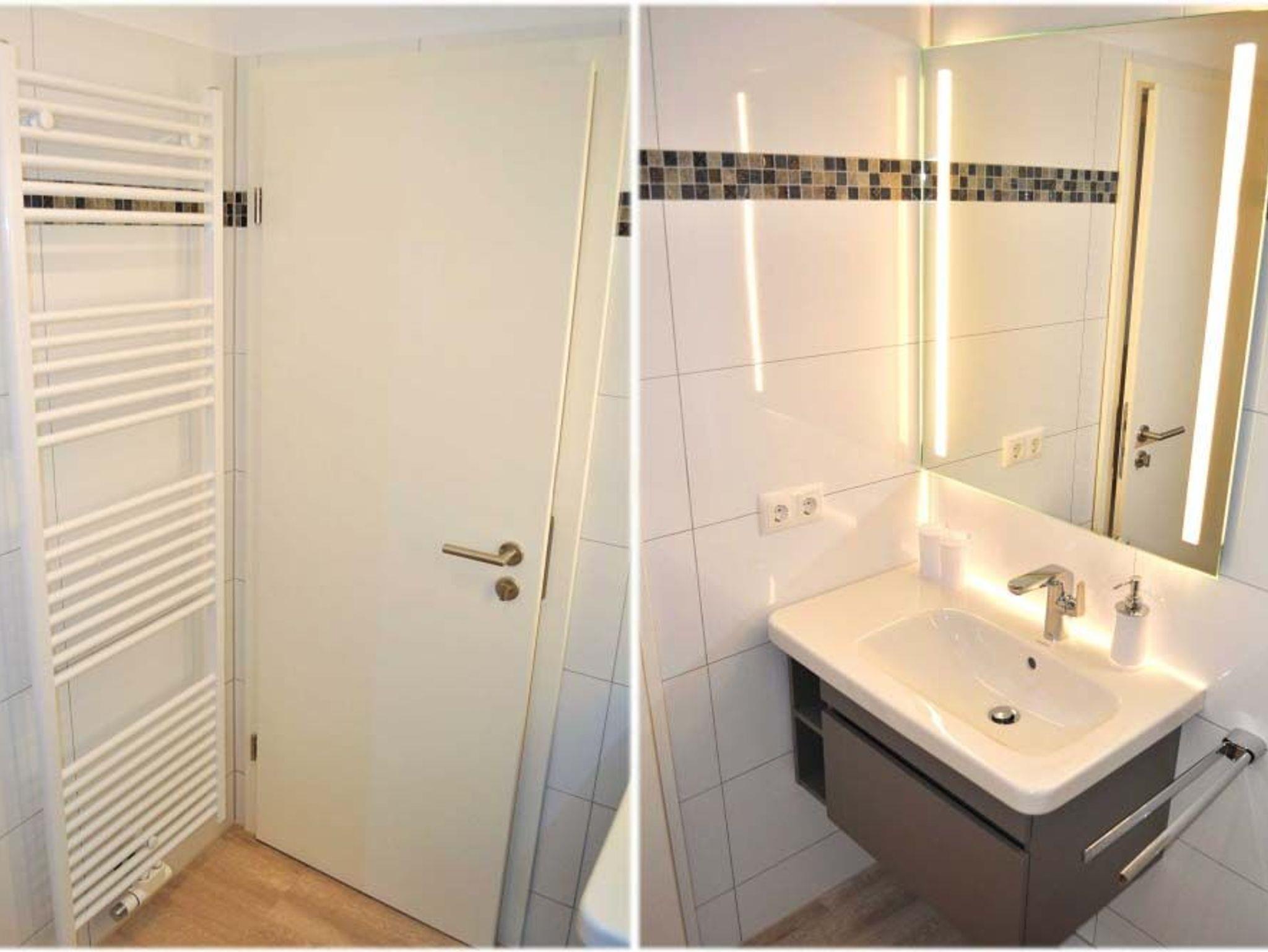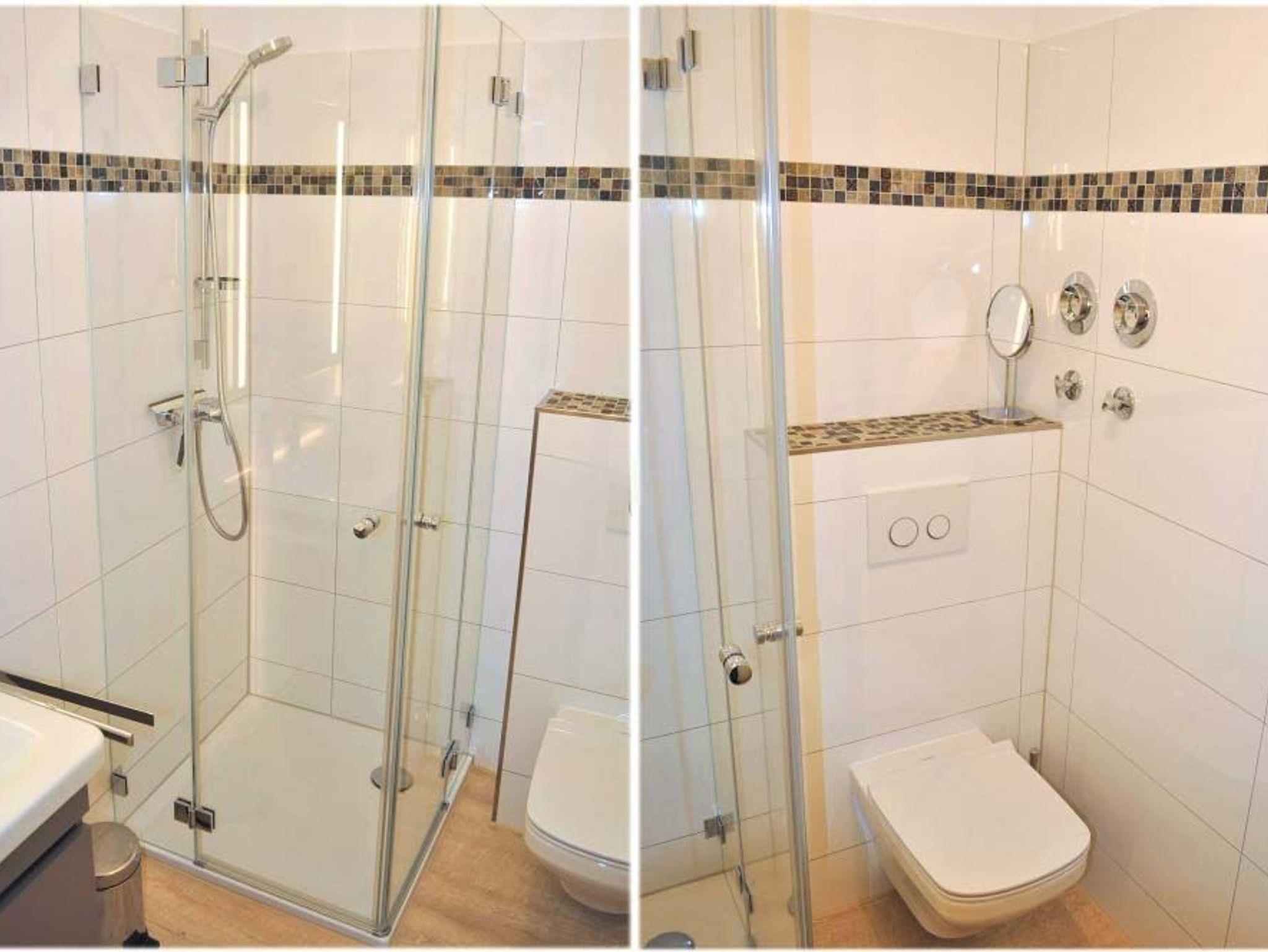 Bad 1: Dusche, Duschkabine, Fön, Kosmetikspiegel, Spiegel, Unterschrank, Waschtisch, WC