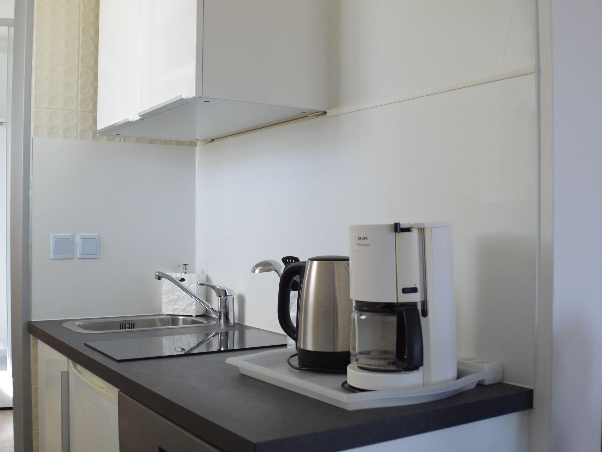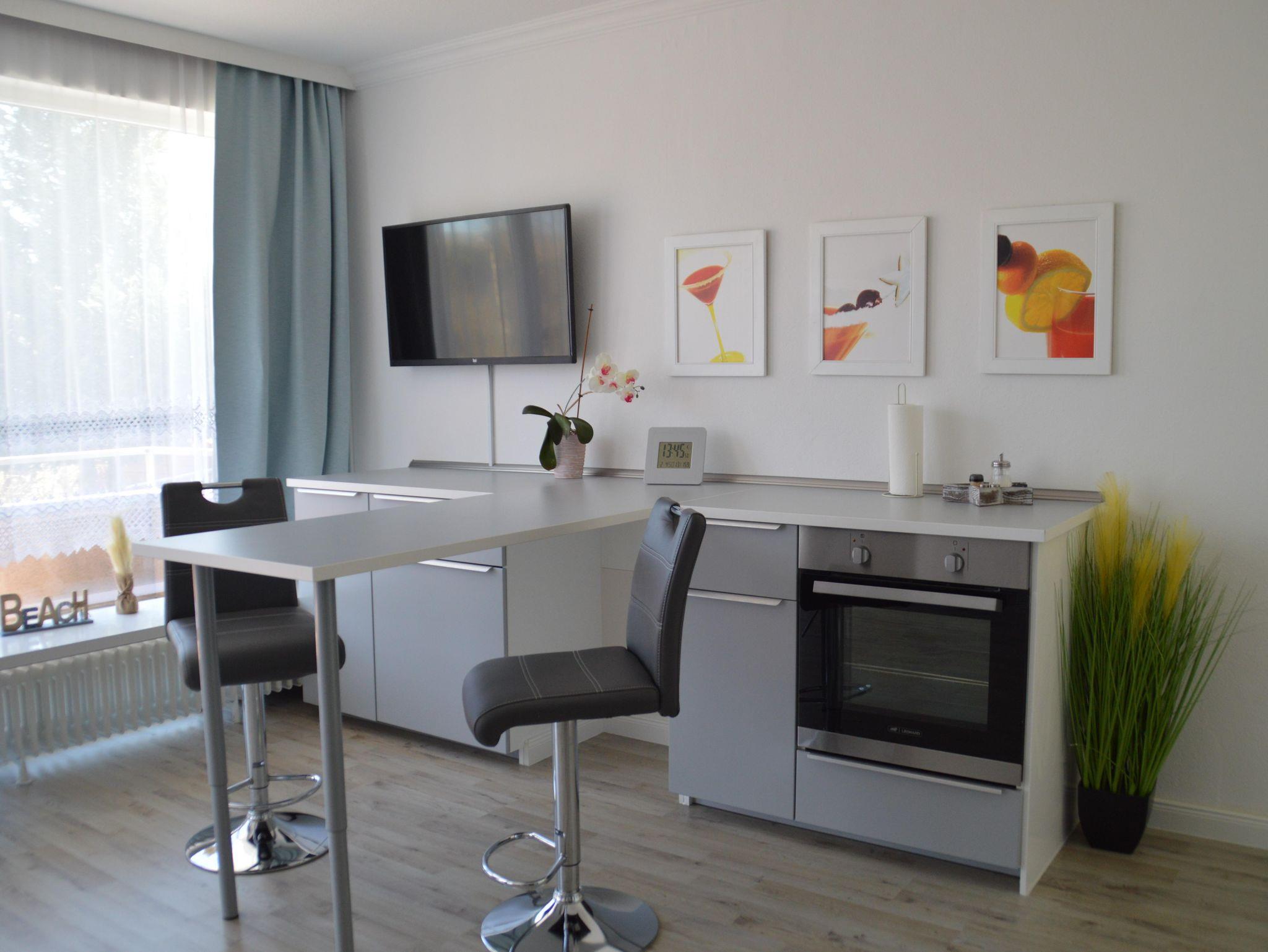 Die 35m² beherbergen ein gemütliches Bad mit Dusche und WC, eine kleine Kochnische und einen Schlaf- und Wohnraum mit Fehnseher.