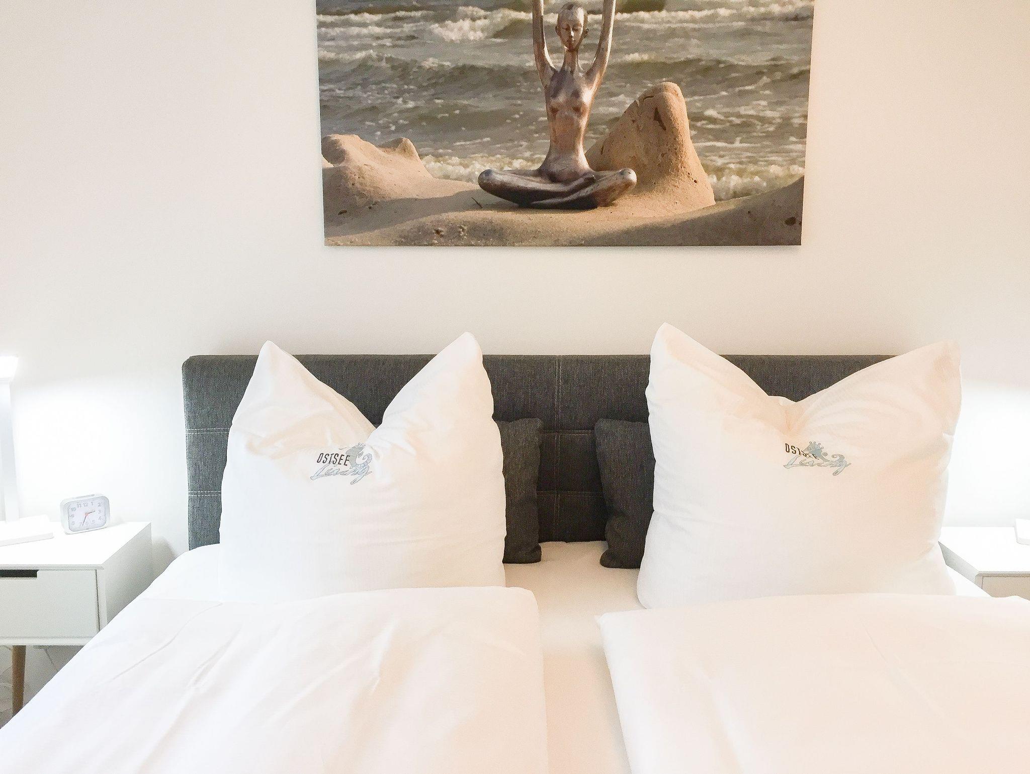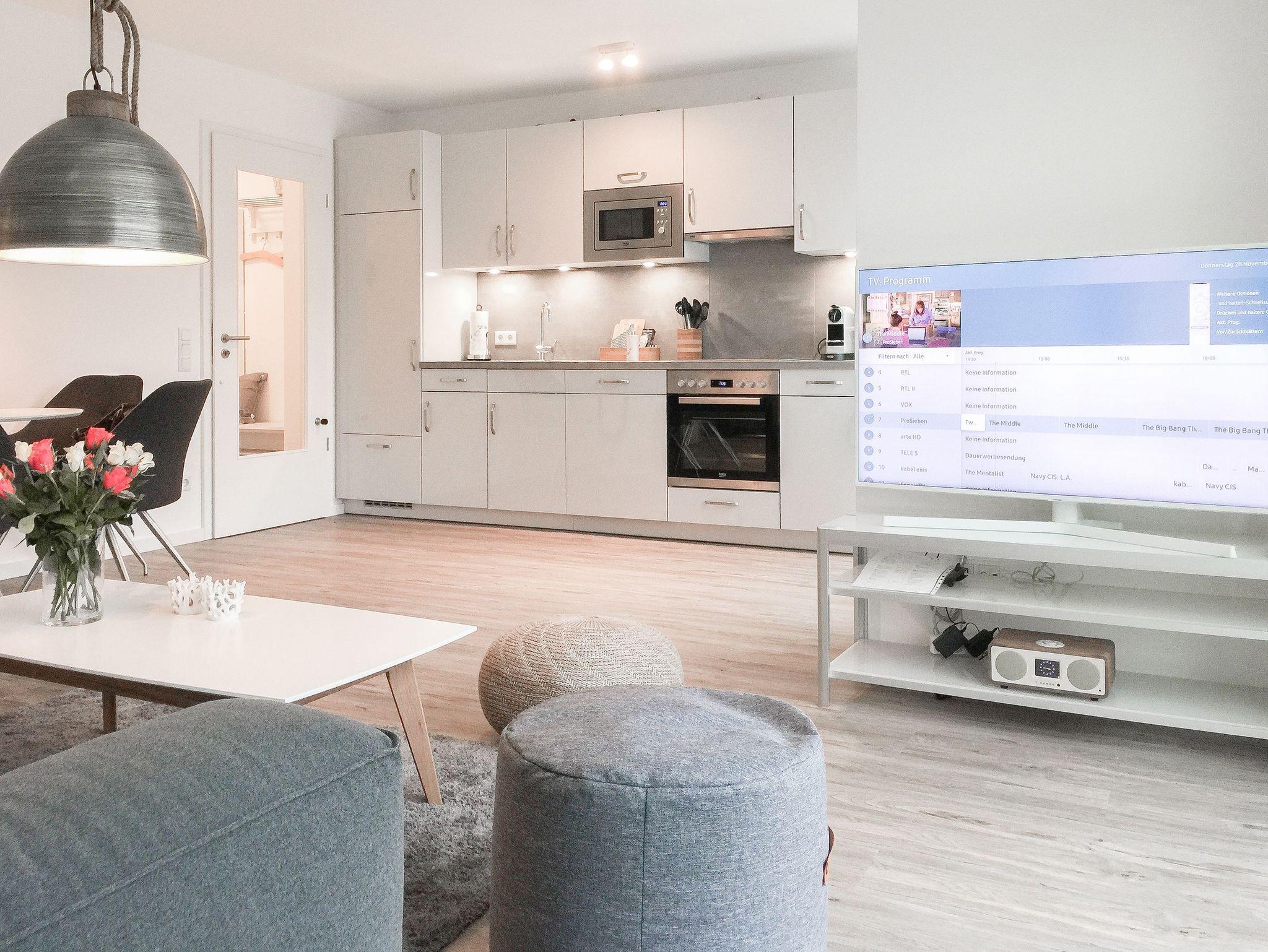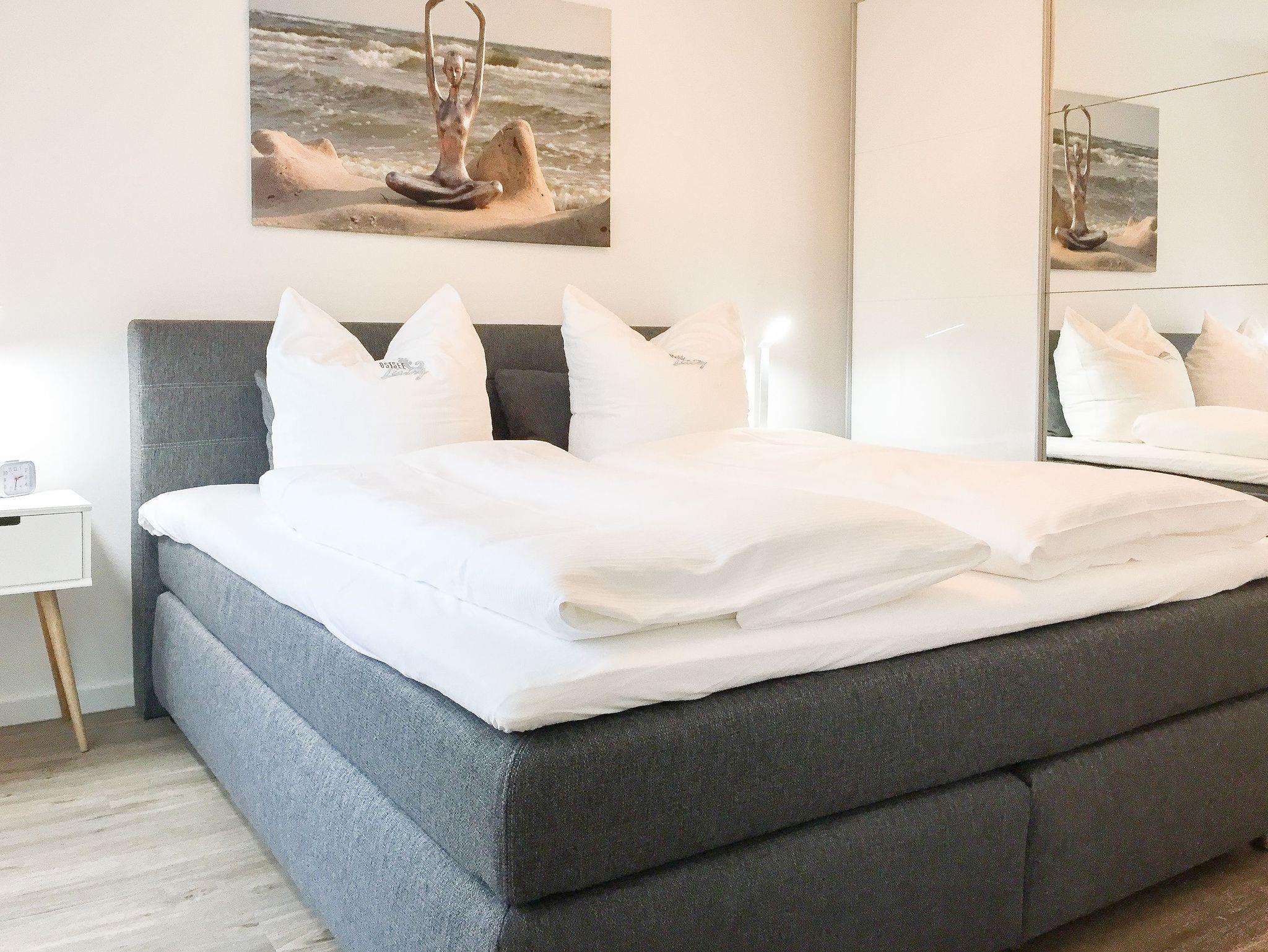 Die ca. 60 qm großzügig geschnittene Wohnung mit 3 Räumen, bietet genügend Platz für 4 Personen und befindet sich im Erdgeschoss einer Neubau-Wohnanlage. Die moderne Einbauküche ist direkt mit dem gemütlichen Wohn-Essbereich verbunden. Schöne Designböden sowie liebevolle, maritime Dekorationselemente sorgen für Behaglichkeit und spiegeln die Nähe zum Meer wieder.[nbsp] Alle bodentiefen Fenster sind mit elektrischen Außenjalousien ausgestattet und sorgen am Tag für lichtdurchflutete Räume. Zwei Schlafzimmer, eingerichtet mit einem Boxspringbett (180x200) und einem Doppelbett (140x200), lassen Sie nach einem ereignisreichen Urlaubstag[nbsp] perfekt zur Ruhe kommen. Das Bad bietet eine ebenso moderne Ausstattung wie die anderen Bereiche der Wohnung. Selbstverständlich gehören die kostenlose WLAN Nutzung, Radio und ein großer Flat Screen-TV zum Entertainment-Paket. Auf der dazugehörigen, möblierten Terrasse mit elektrischer Markise können Sie die Sonnentage an der frischen Luft genießen, entspannen oder einfach Ihre Seele baumeln lassen.