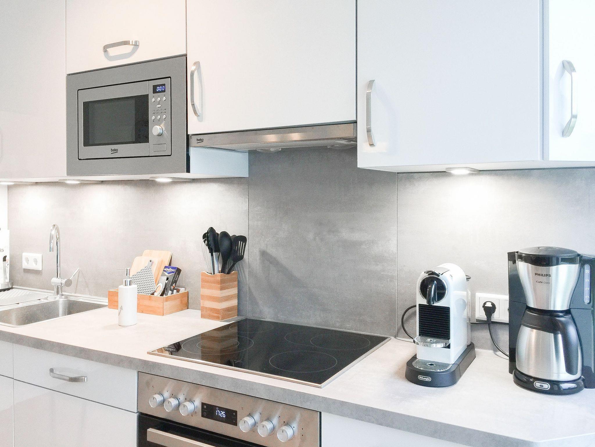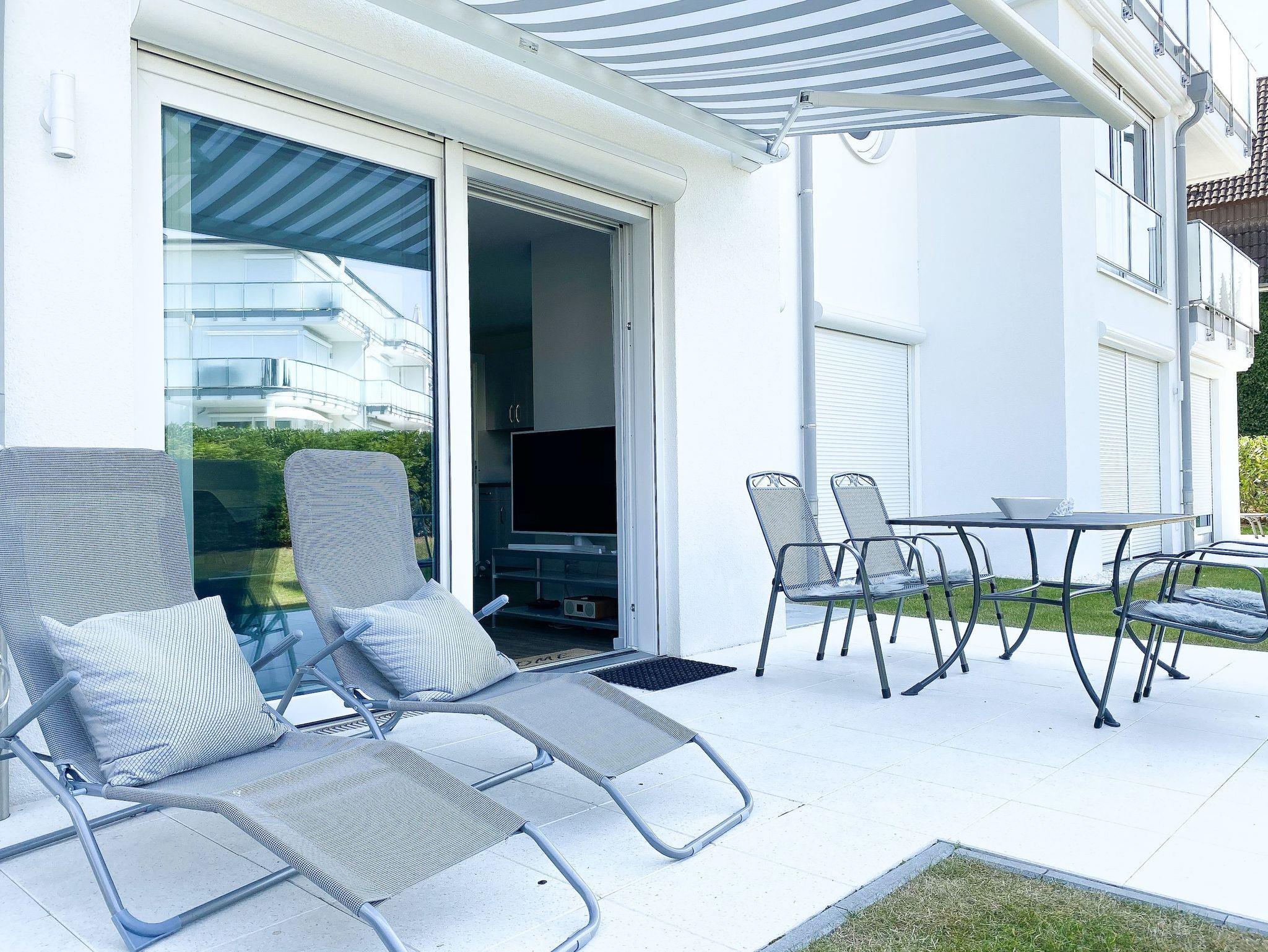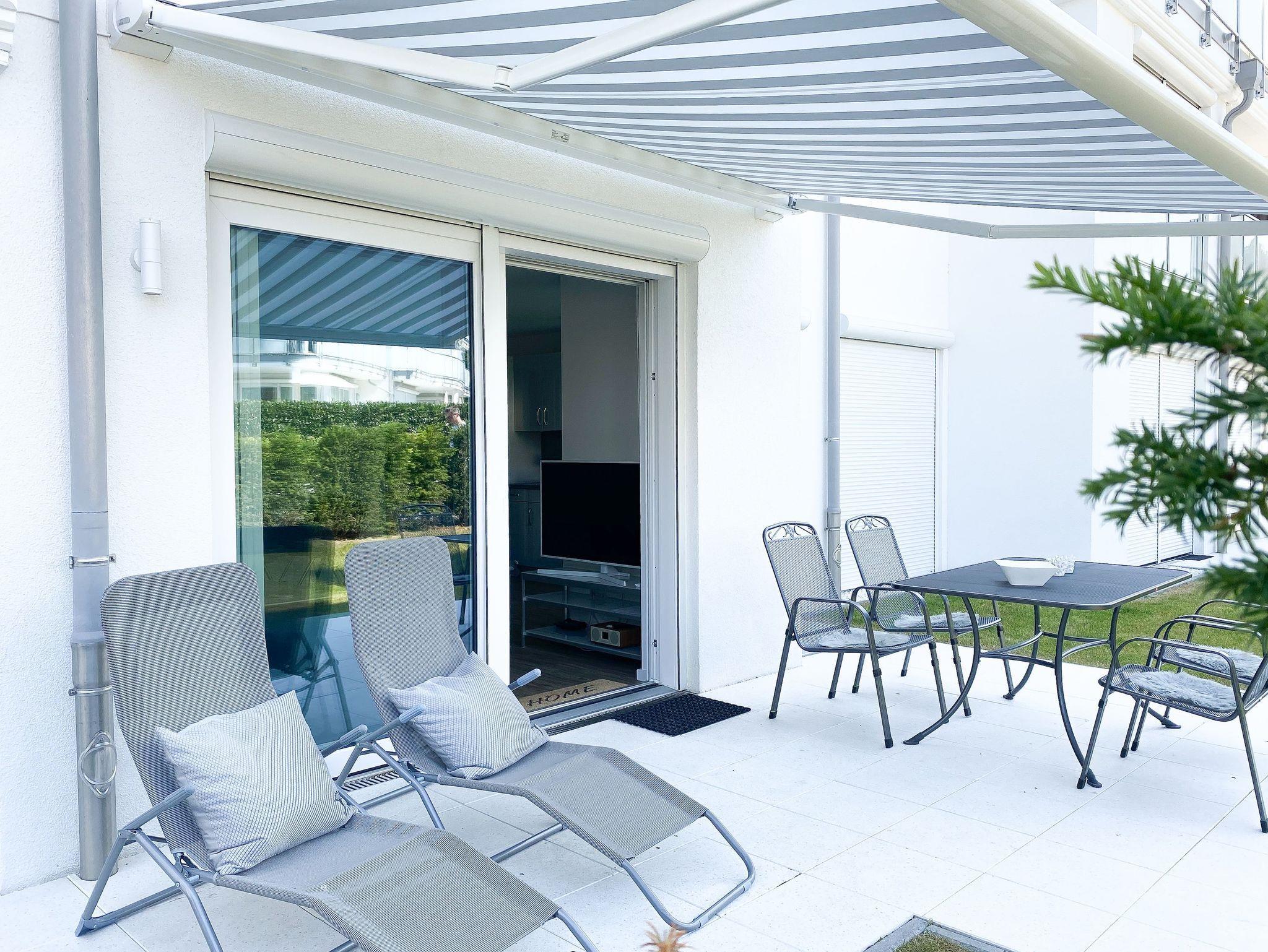 Die ca. 60 qm großzügig geschnittene Wohnung mit 3 Räumen, bietet genügend Platz für 4 Personen und befindet sich im Erdgeschoss einer Neubau-Wohnanlage. Die moderne Einbauküche ist direkt mit dem gemütlichen Wohn-Essbereich verbunden. Schöne Designböden sowie liebevolle, maritime Dekorationselemente sorgen für Behaglichkeit und spiegeln die Nähe zum Meer wieder.[nbsp] Alle bodentiefen Fenster sind mit elektrischen Außenjalousien ausgestattet und sorgen am Tag für lichtdurchflutete Räume. Zwei Schlafzimmer, eingerichtet mit einem Boxspringbett (180x200) und einem Doppelbett (140x200), lassen Sie nach einem ereignisreichen Urlaubstag[nbsp] perfekt zur Ruhe kommen. Das Bad bietet eine ebenso moderne Ausstattung wie die anderen Bereiche der Wohnung. Selbstverständlich gehören die kostenlose WLAN Nutzung, Radio und ein großer Flat Screen-TV zum Entertainment-Paket. Auf der dazugehörigen, möblierten Terrasse mit elektrischer Markise können Sie die Sonnentage an der frischen Luft genießen, entspannen oder einfach Ihre Seele baumeln lassen.