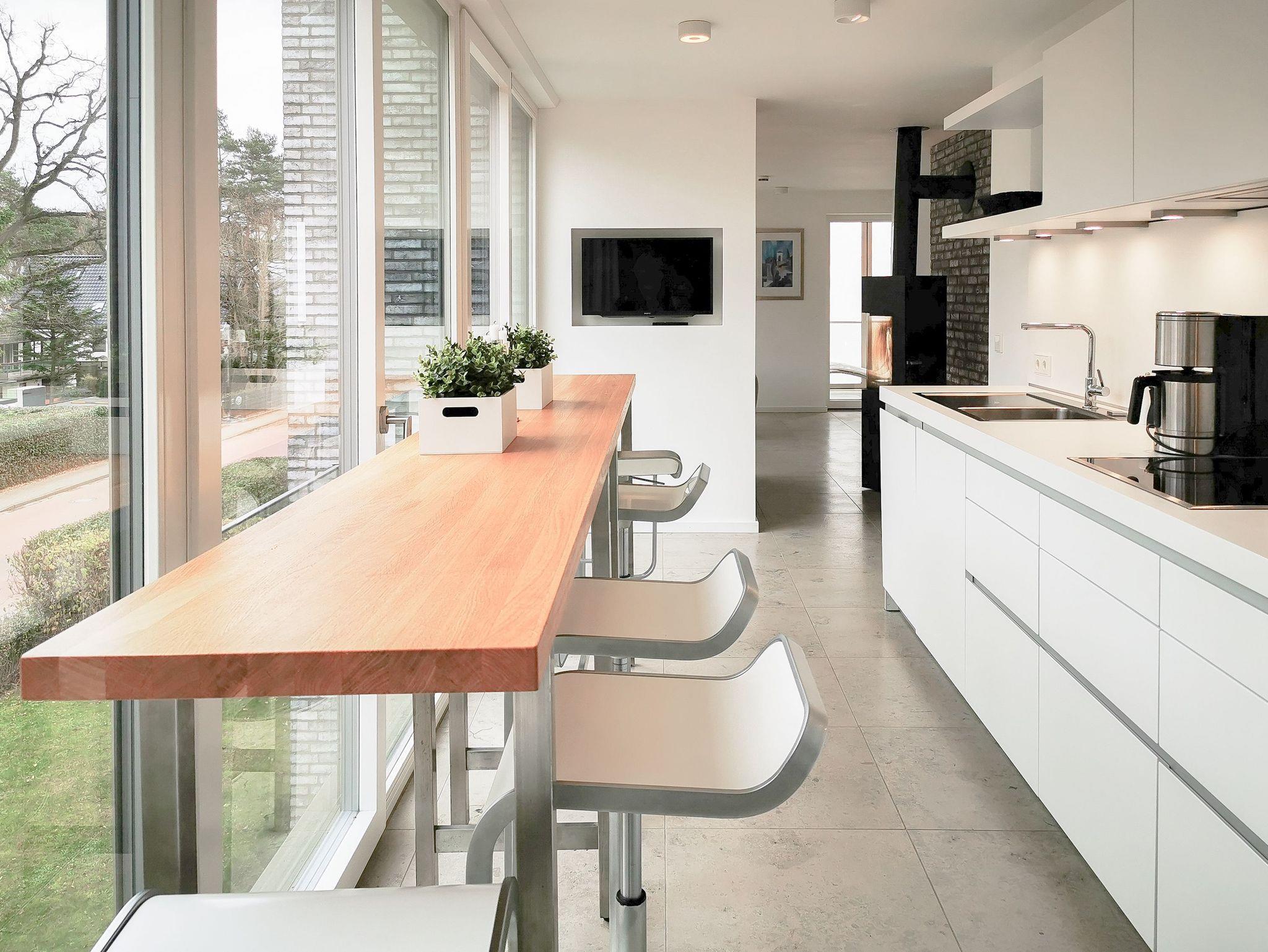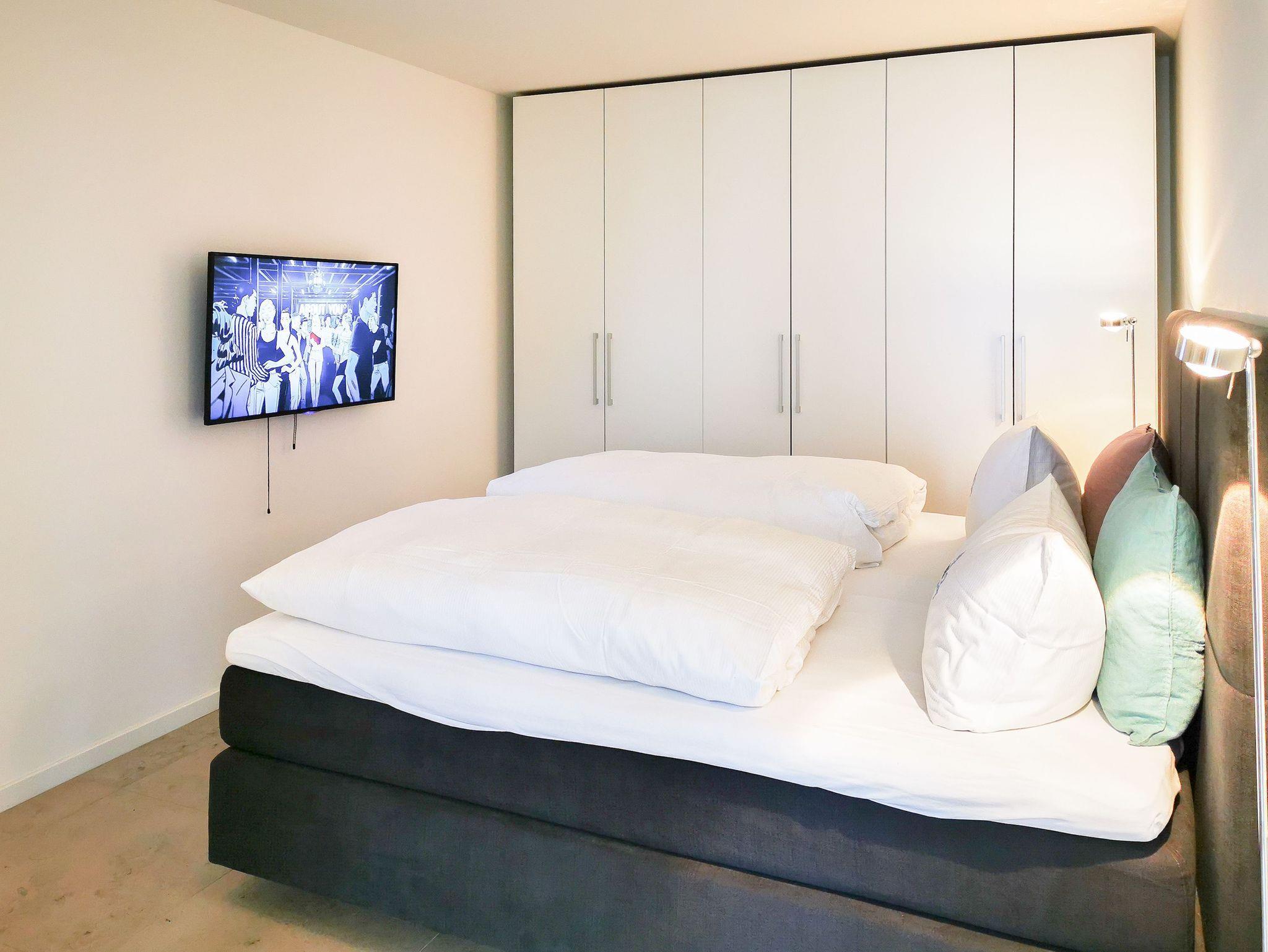 Das großzügige, lichtdurchflutete Wohnzimmer bietet einen herrlichen Ausblick, teilweise bis auf die Ostsee. Hier können Sie schöne Stunden mit Ihrer Familie verbringen und[nbsp] ein Kamin sorgt für behagliche Stunden am warmen Feuer. Die sehr hochwertige und offen gestaltete bulthaup Markenküche fügt sich harmonisch in das Gesamtbild der Wohnung ein und bietet ebenfalls einen schönen Ostseeblick. Sie ist mit einem Esstresen und Barhockern ausgestattet, an dem 6 Personen bequem Platz finden. Das Master Schlafzimmer, eingerichtet mit einem Boxspringbett (180x200), TV und Verdunkelungsvorhängen, lässt Sie nach einem schönen Urlaubstag perfekt zur Ruhe kommen. Ein großer Kleiderschrank hält genügend Möglichkeiten für Sie bereit, Ihre Urlaubsgarderobe unterzubringen. Von hier haben Sie direkten Zugang zu einem Badezimmer der Extraklasse. Die Natursteinfliesen und die helle Ausstattung des Bades sorgen für eine ausgesprochene Wohlfühlatmosphäre. Für absolute Entspannung sorgt die integrierte Sauna, die Sie natürlich kostenfrei nutzen können. Zwei weitere Schlafzimmer sind mit je einem kleinen Kleiderschrank, Verdunkelungsvorhängen und einem Boxspringbett eingerichtet.[nbsp] Selbstverständlich gehören drei TV und WLAN zum Entertainment-Paket.