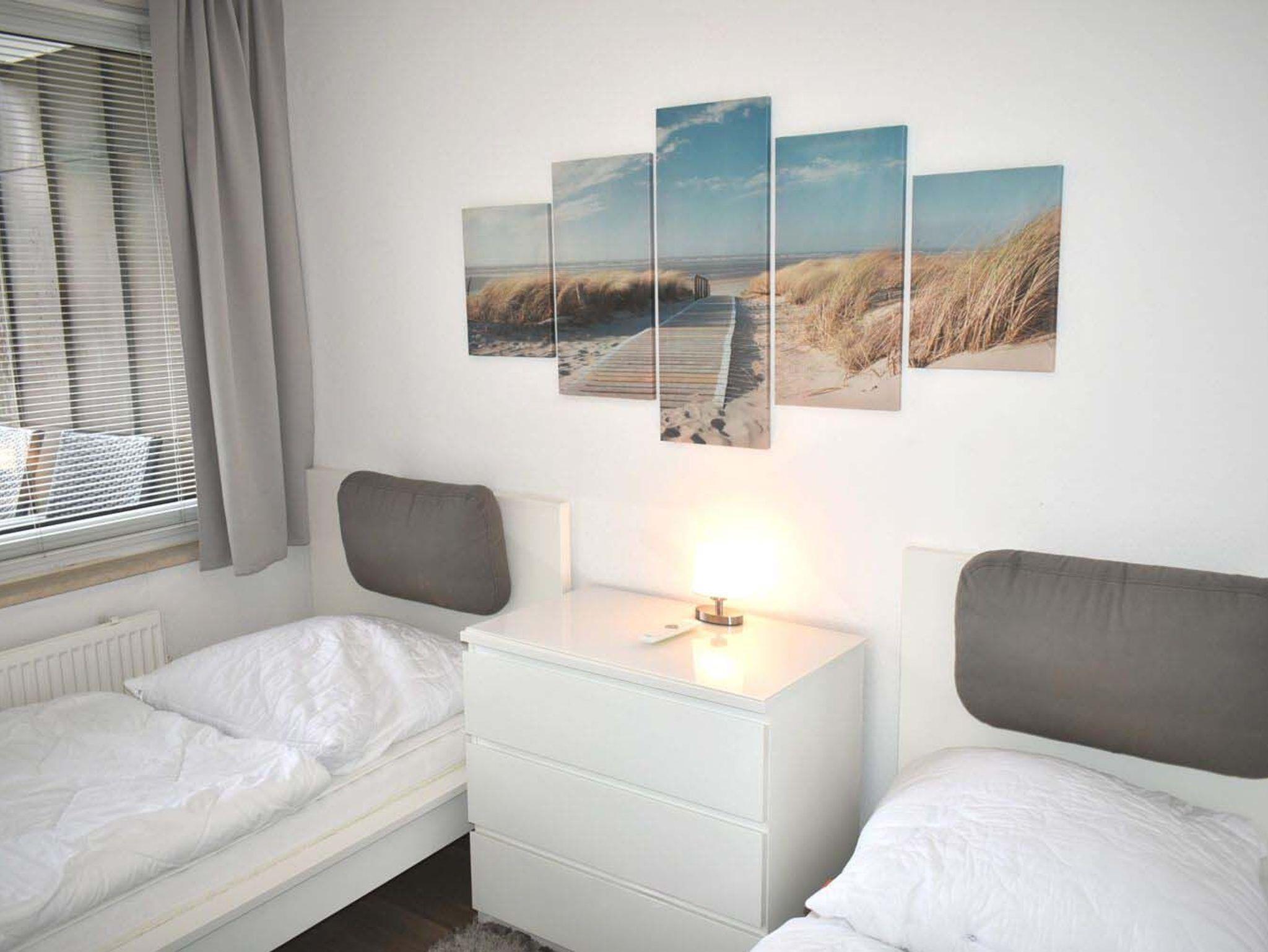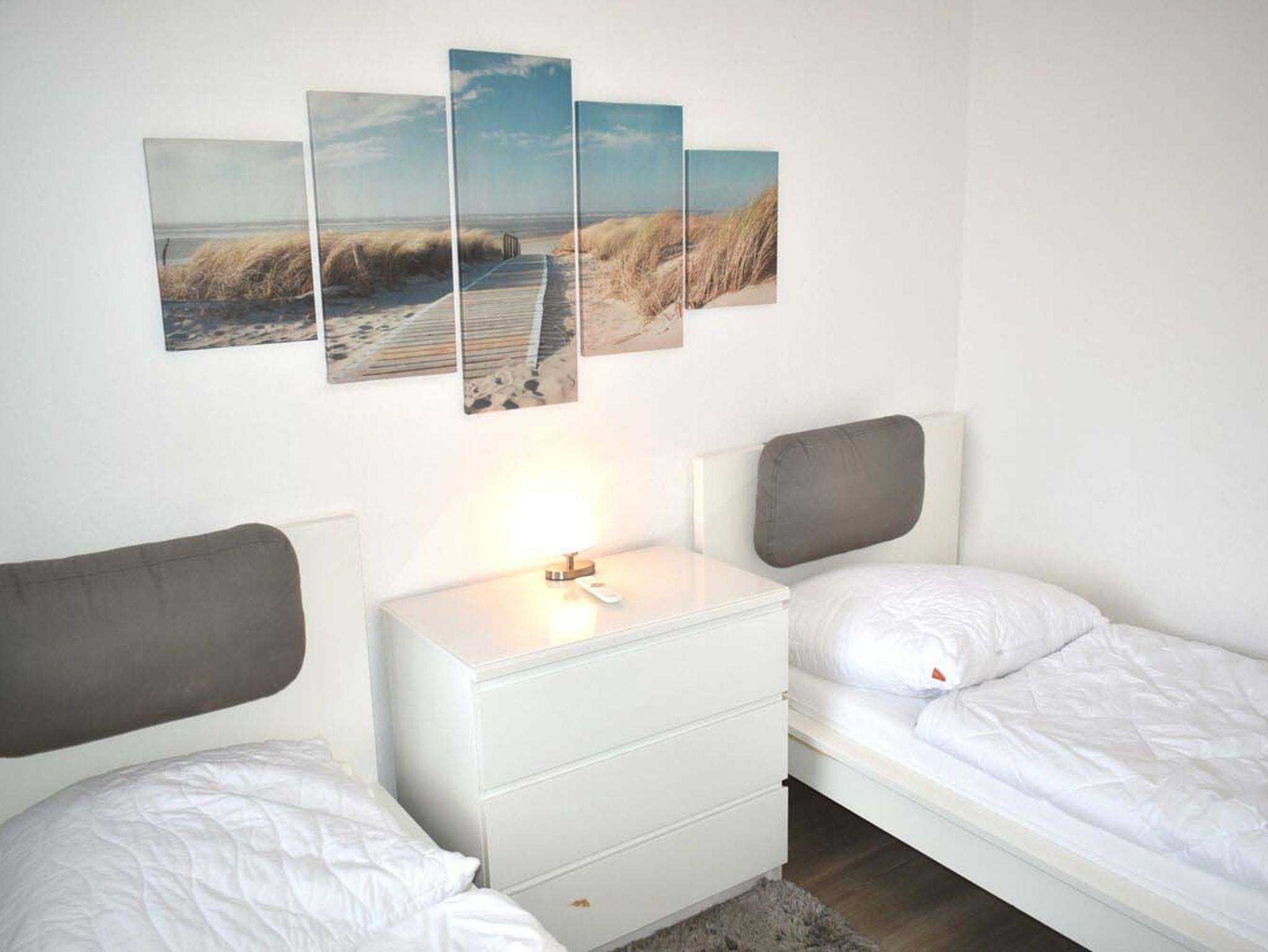 Schlafzimmer 1: 2 Einzelbetten, Kommode, Nachttischlampe, Stuhl, Tischlampe, wandhängender Sat-TV Flachbildschirm, Wecker
