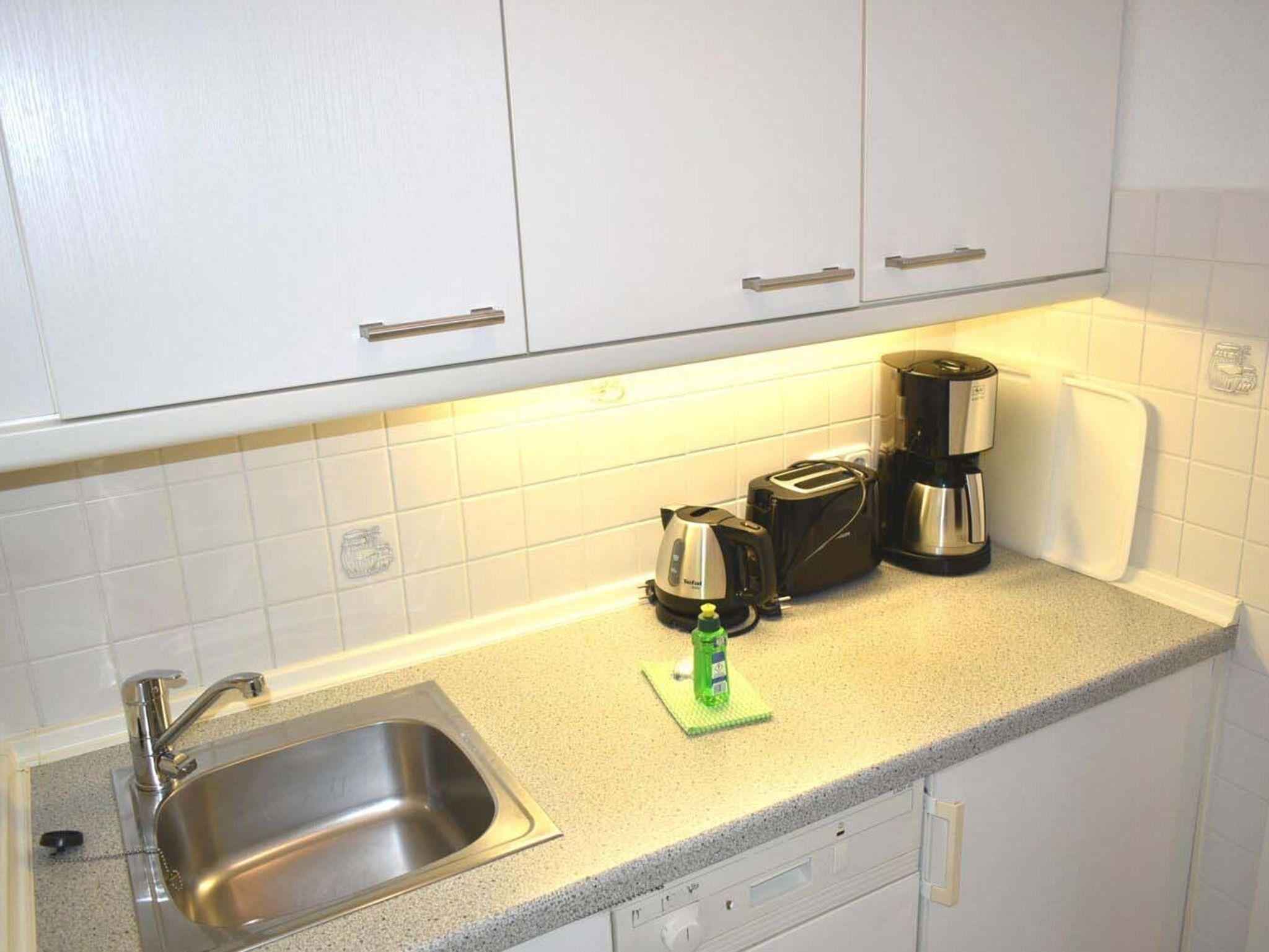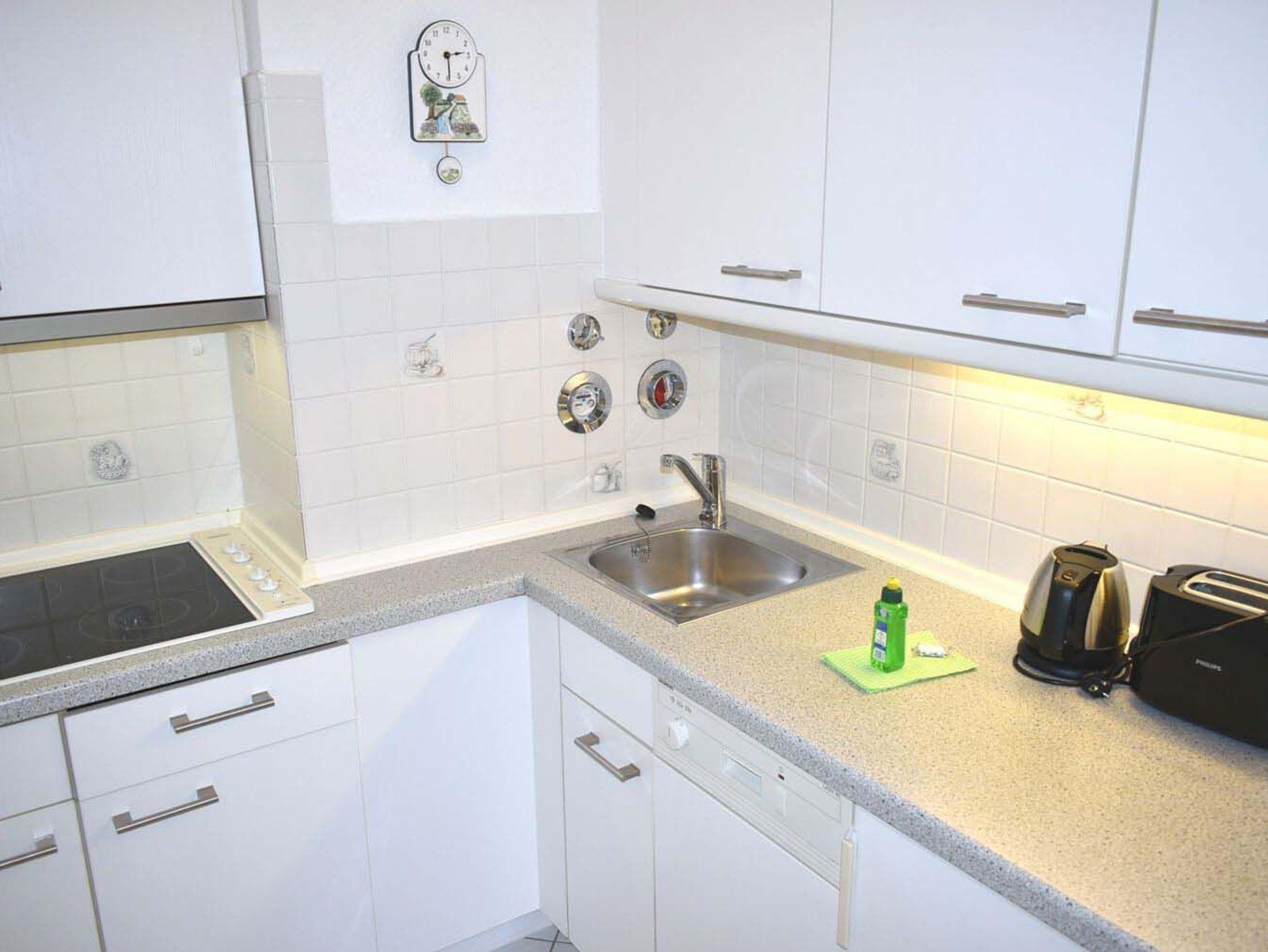 Küche: 4-Zonen-Cerankochfeld, Dunstabzugshaube, Einbauküche, Geschirr, Kaffeemaschine, Kochtöpfe, Kühlschrank mit Gefrierfach, Mikrowelle, Spülmaschine, Toaster, Wasserkocher