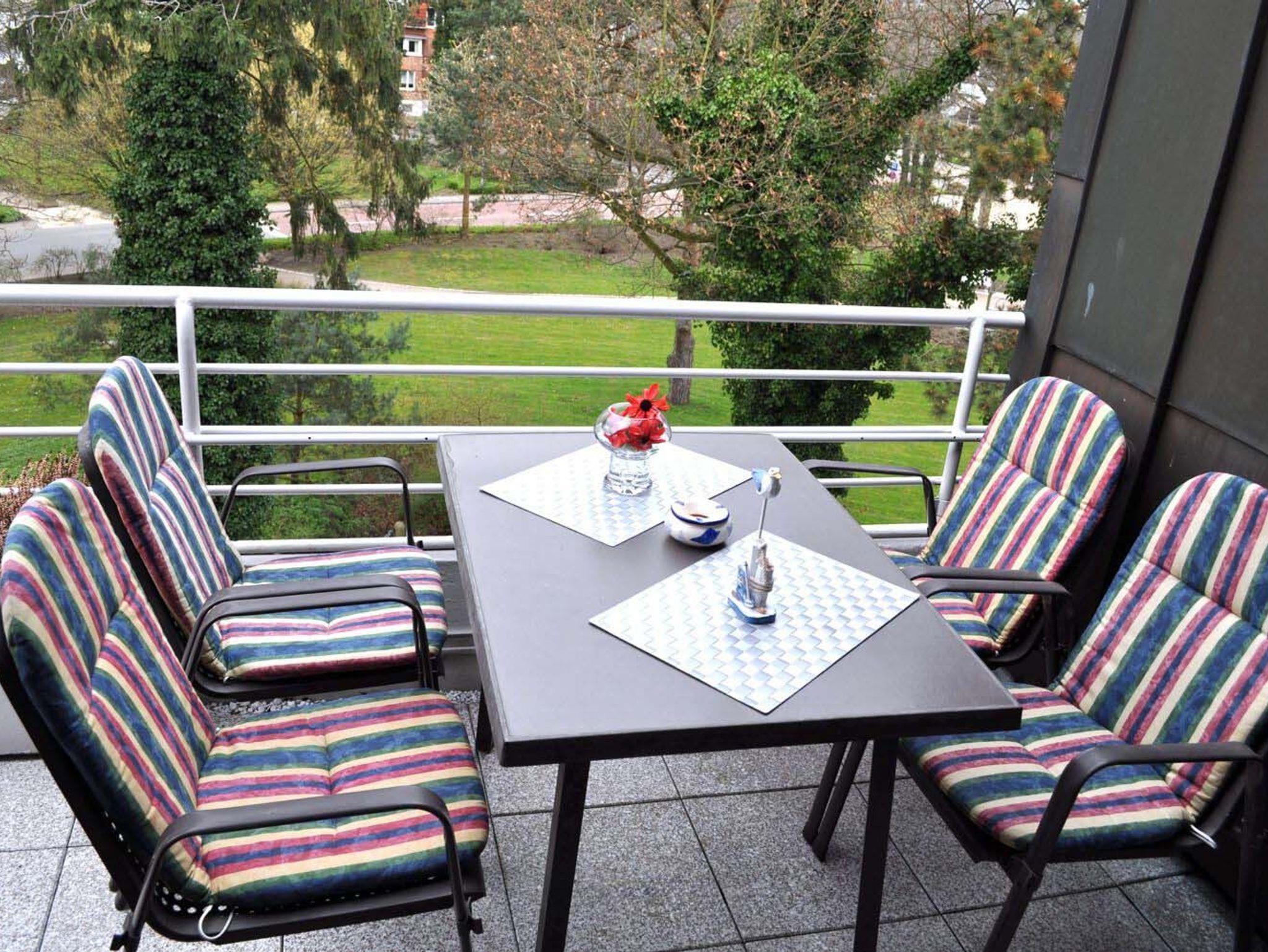 Balkon: 4 Stühle, halb überdacht, Markise, Nord- Westlage, Sichtmöglichkeit vom Balkongeländer seitlich auf die Ostsee, Tisch, Wäscheständer