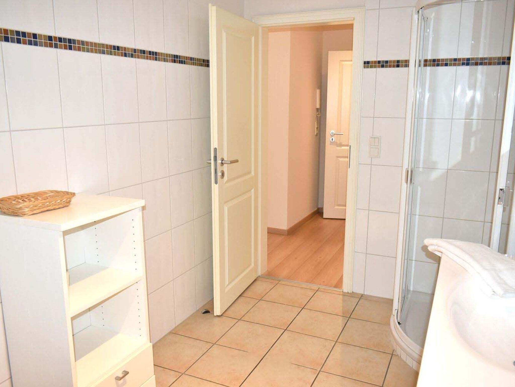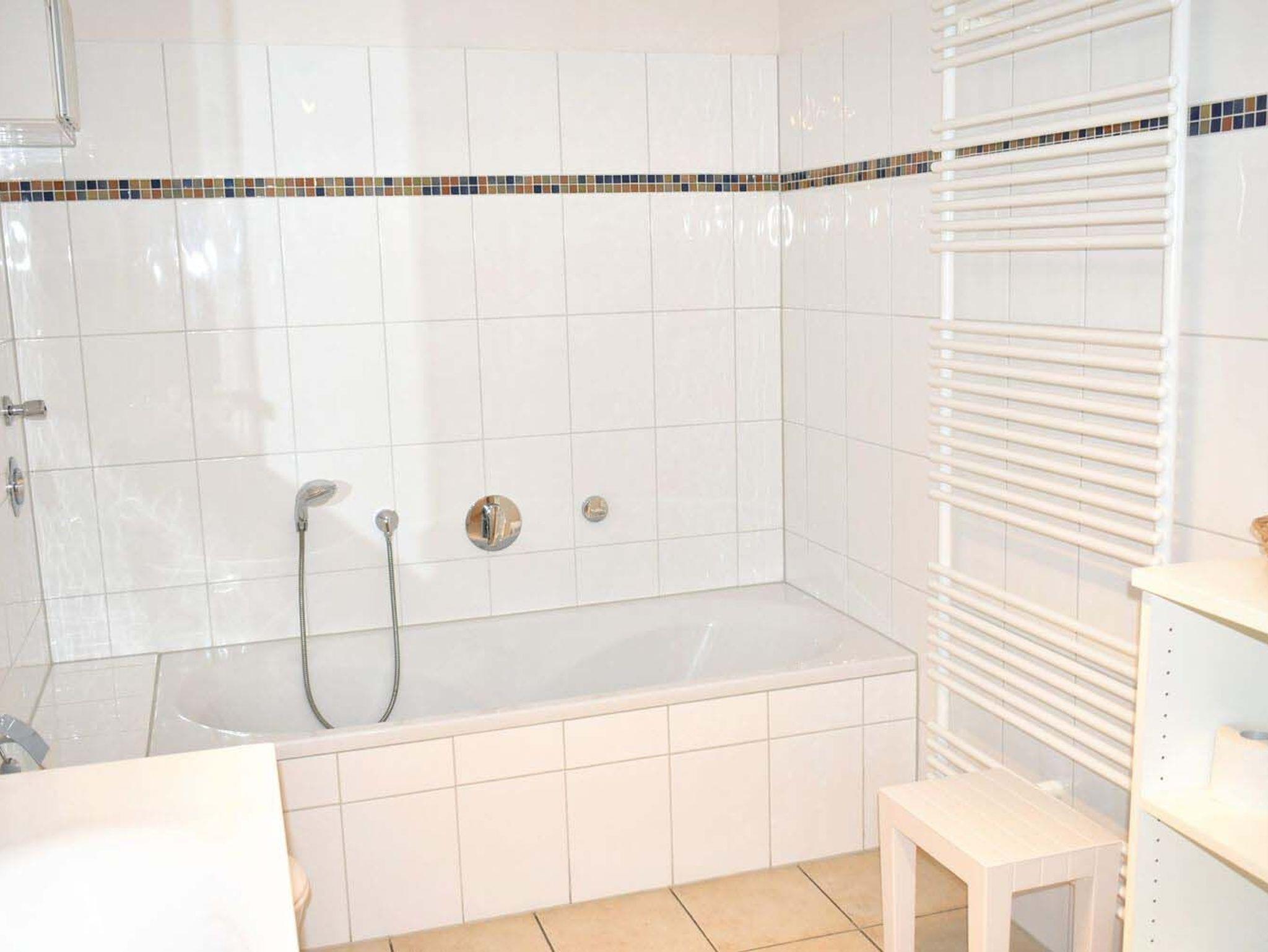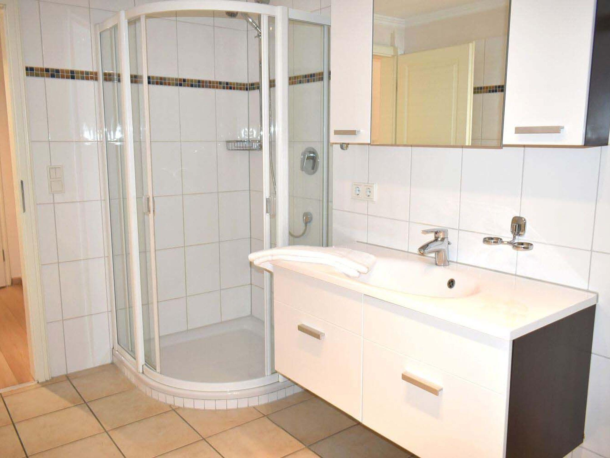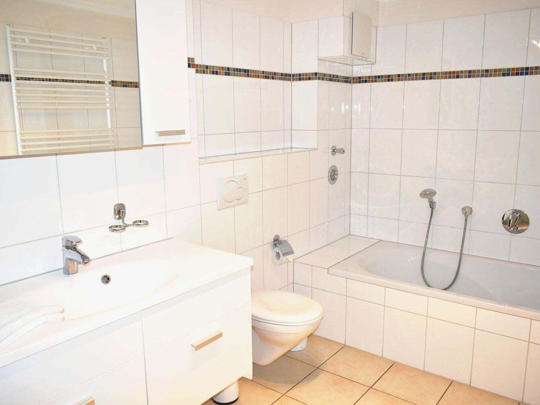 Bad 1: Badewanne, Dusche, Duschkabine, Fön, Hocker, Regal, Spiegelschrank, Waschtisch, WC