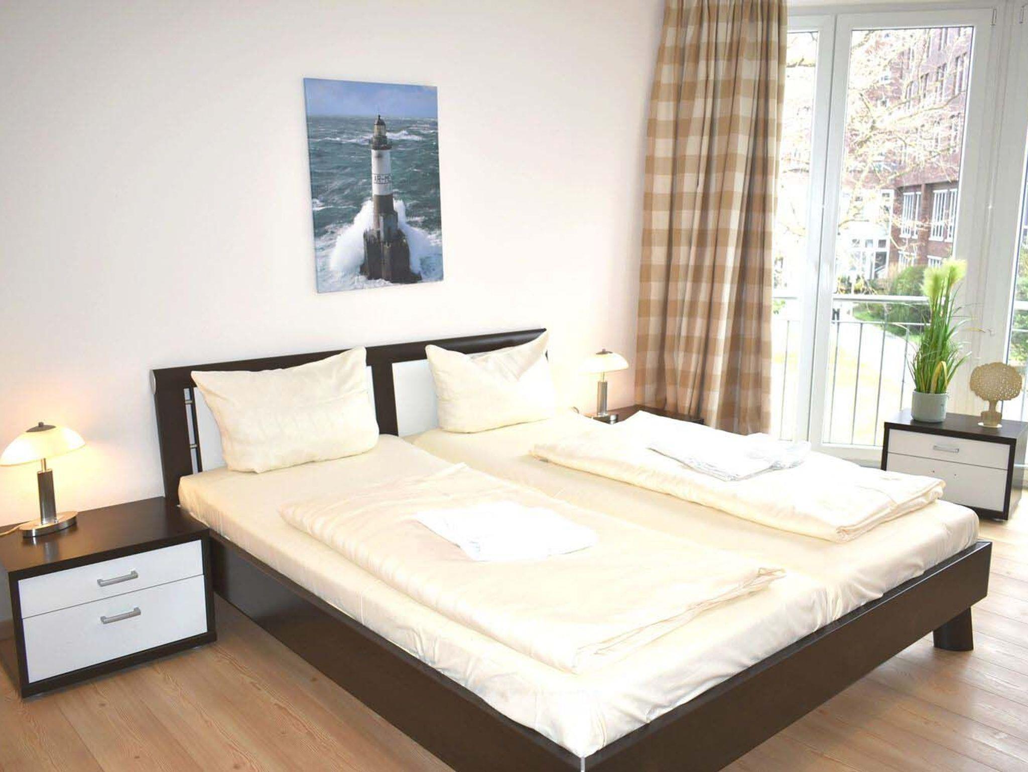 Schlafzimmer 1: 2 Matratzen, 2 Sessel, 2 Spiegel, 3 Nachttische, Anrichte, Doppelbett 2,00 x 1,80 m, Kleiderschrank, Radiowecker, Tischlampe, Verdunklungsstores