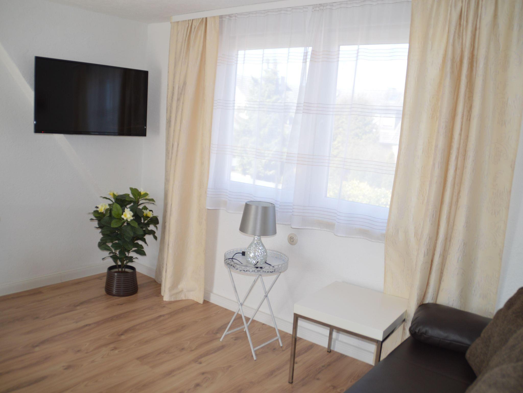 Die 55m² beherbergen ein gemütliches Bad mit Dusche und WC, eine kleine Kochnische und einen separaten Schlafraum und separaten Wohnraum mit Fernseher.