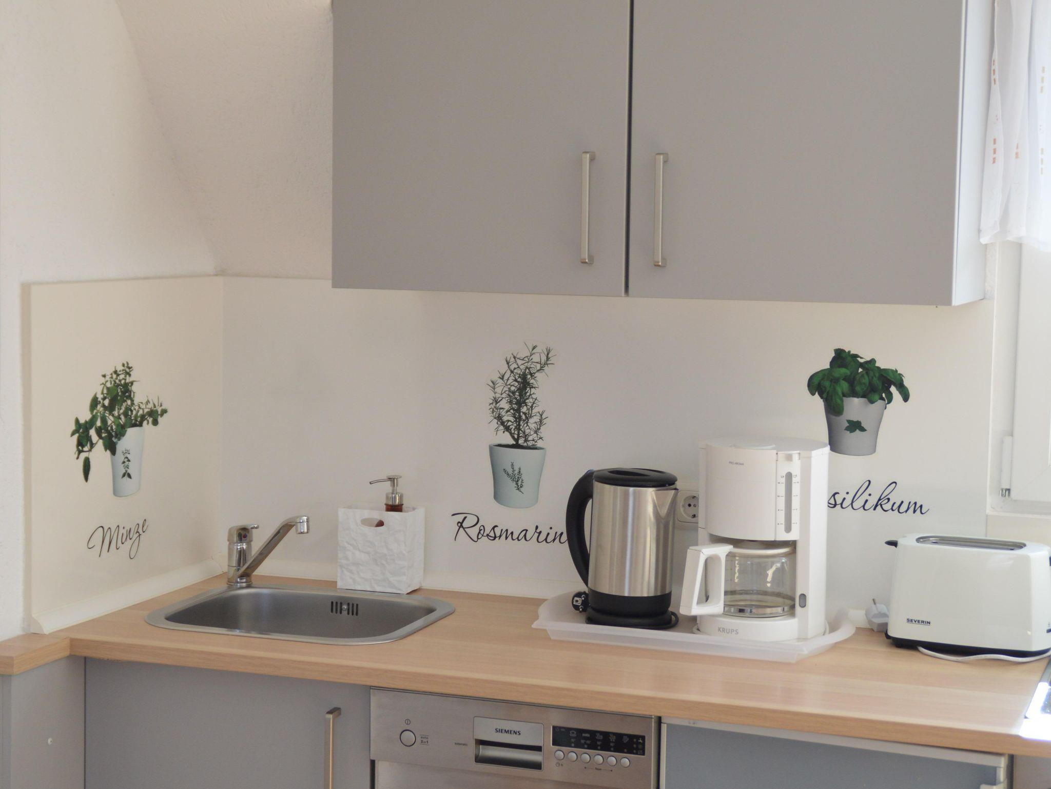 • Miniküche mit Kühlschrank, Backofen, Kaffemaschine, Wasserkocher usw