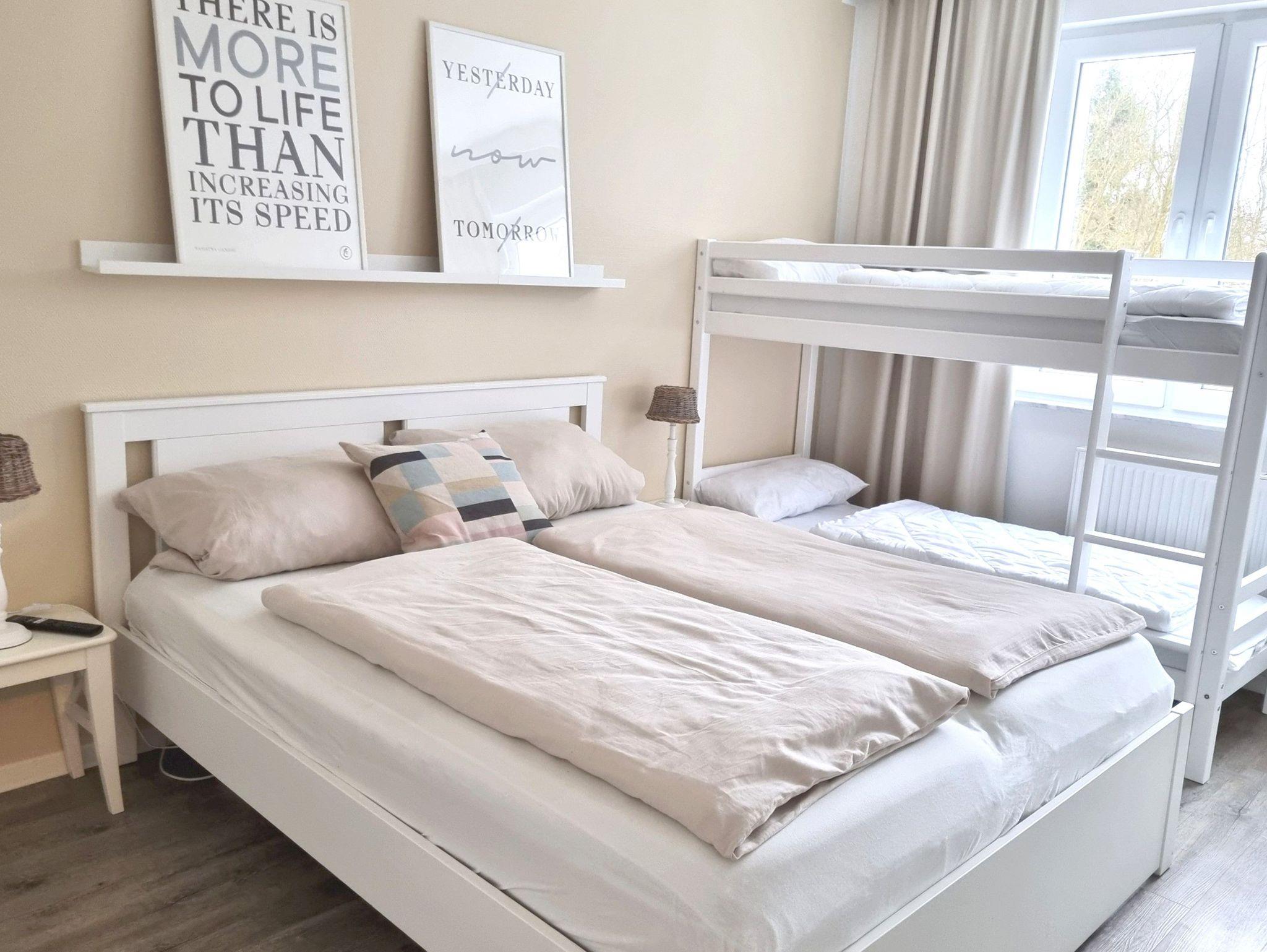Schlafzimmer 1: 2 Ablagen, 2 Matratzen, 2 Tischlampen, Babybett inkl. Matratze, Etagenbett 1,90 x 0,90 m, Doppelbett 2,00 x 1,80 m, Flachbildschirm, Hakenleiste, Kabel-TV, Kleiderschrank, Schlafsessel, Smart TV, Staubsauger, Verdunklungsgardinen, Wäscheständer, ein Kinderhochstuhl inkl.
