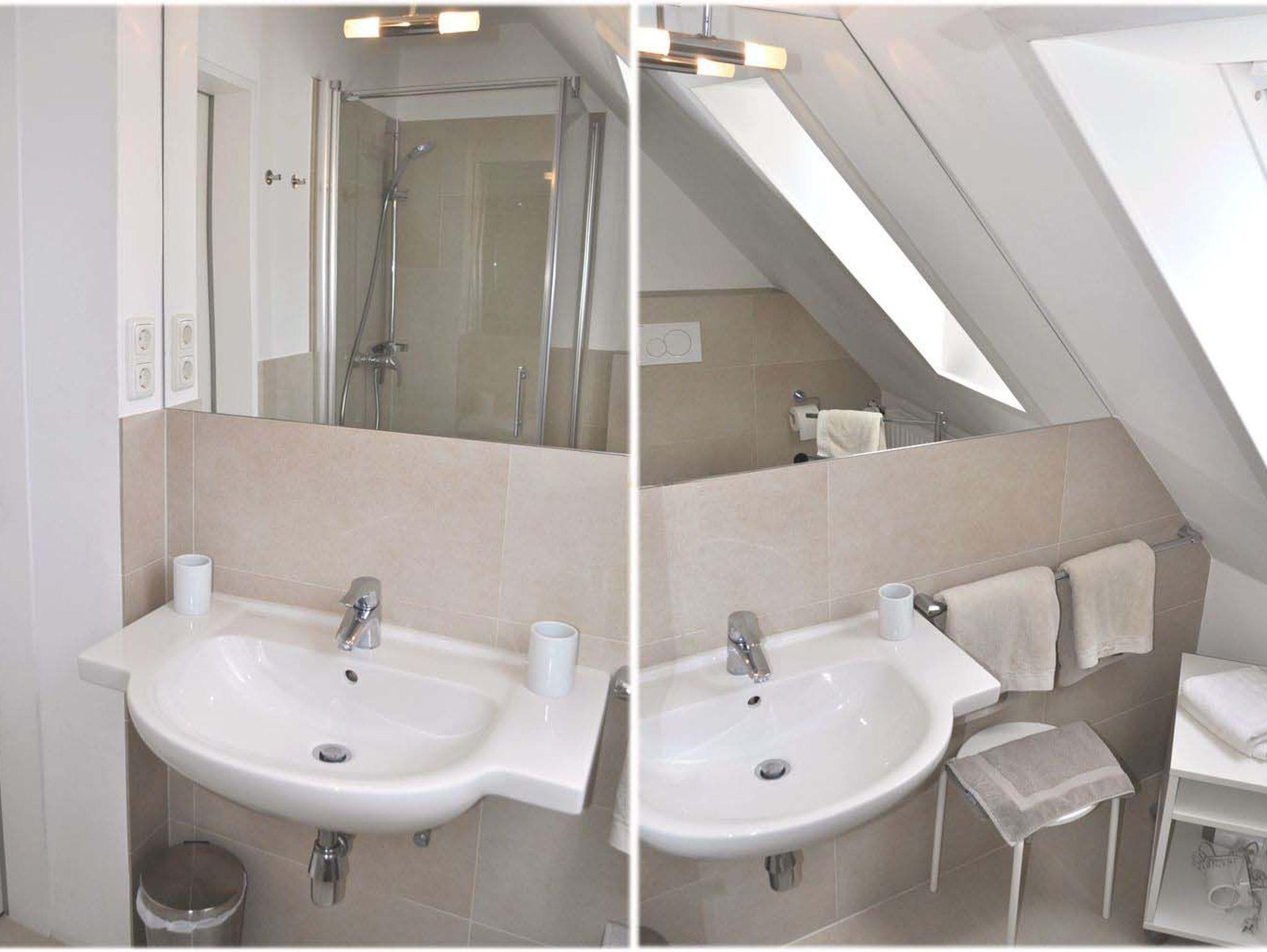 Bad 1: Dusche, Duschkabine, Fön, Handtuchständer, Hocker, Rollwagen, Spiegel, Waschbecken, WC