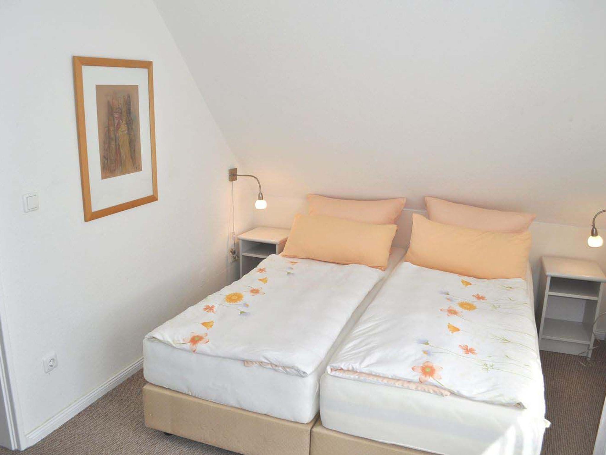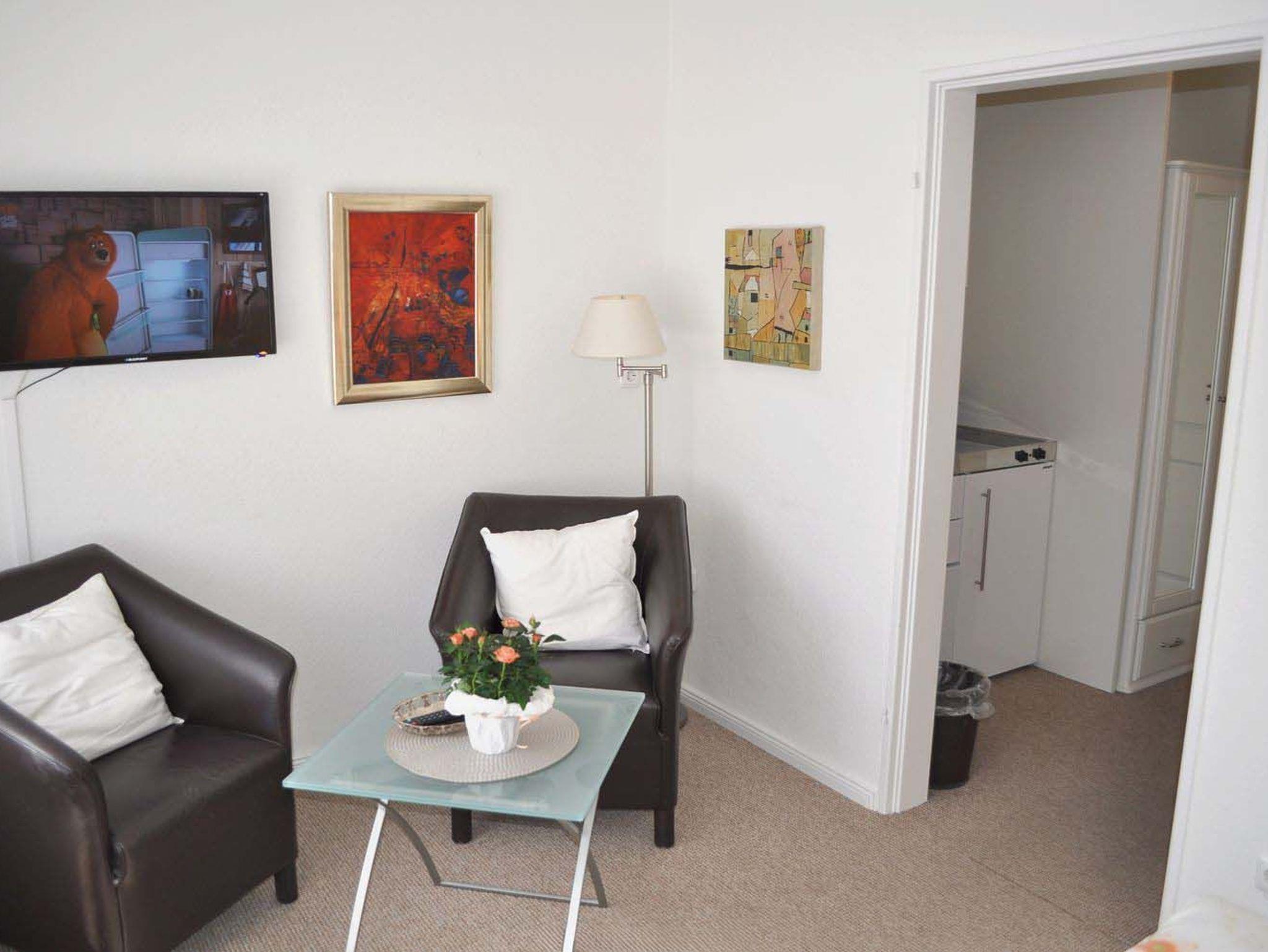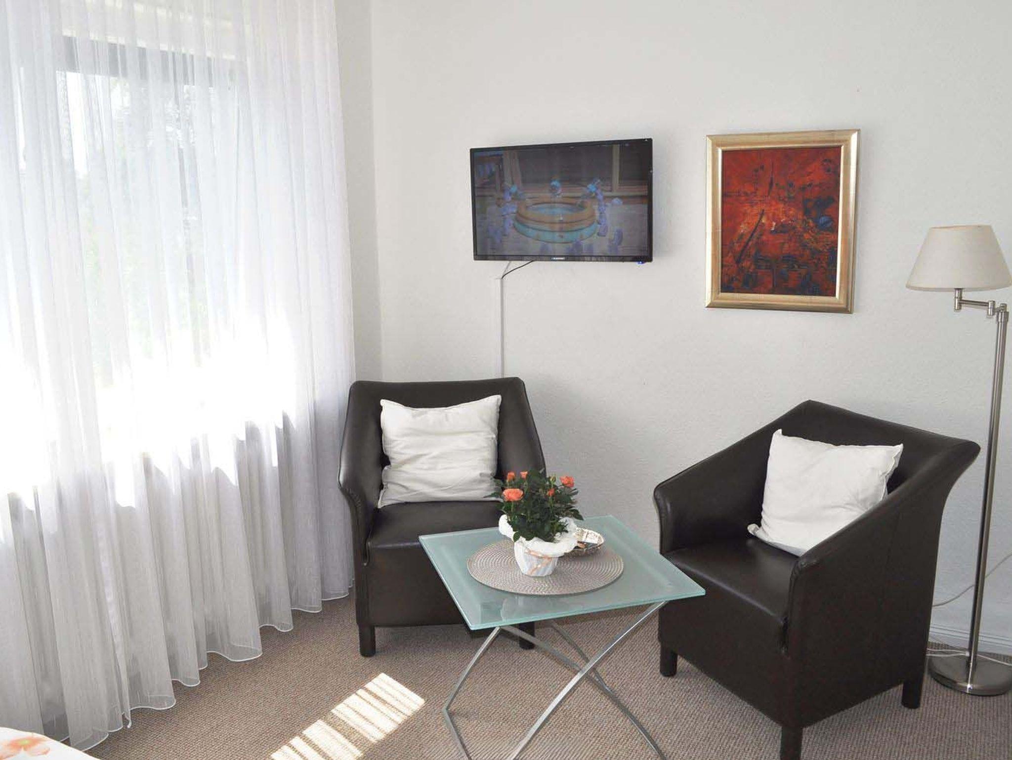 Wohnzimmer: 2 Nachttische, 2 Sessel, Doppelbett 2,00 x 1,60 m, elektrische Aussenrollladen, Flachbildschirm, Sat-TV, Stehlampe, Tisch