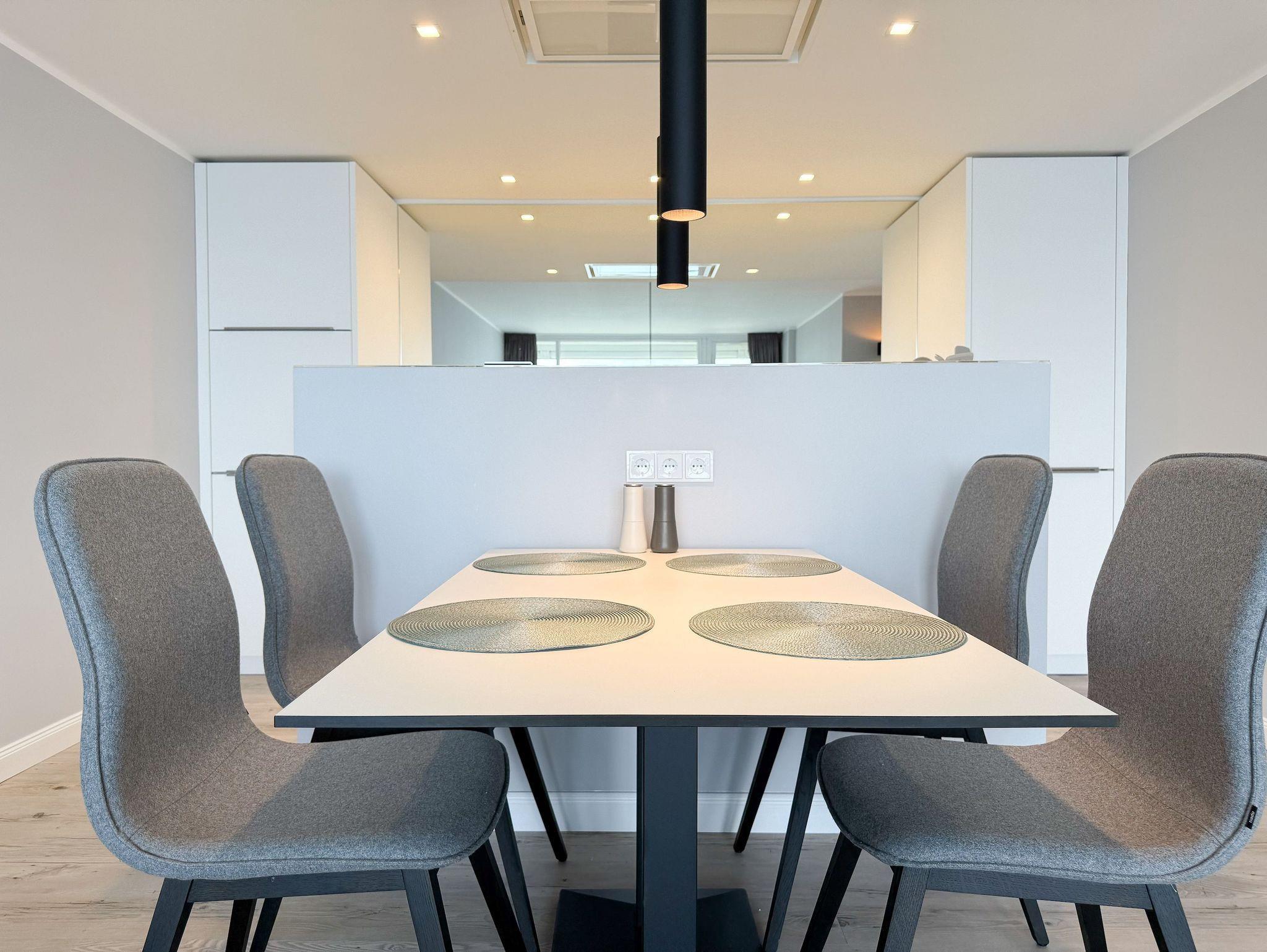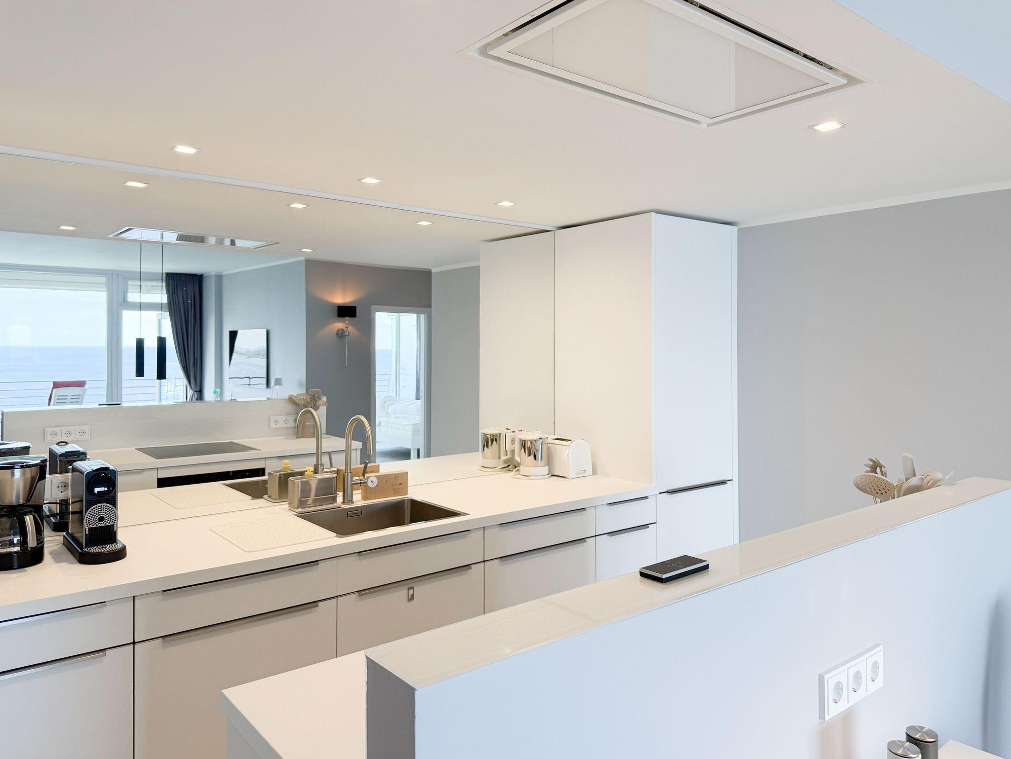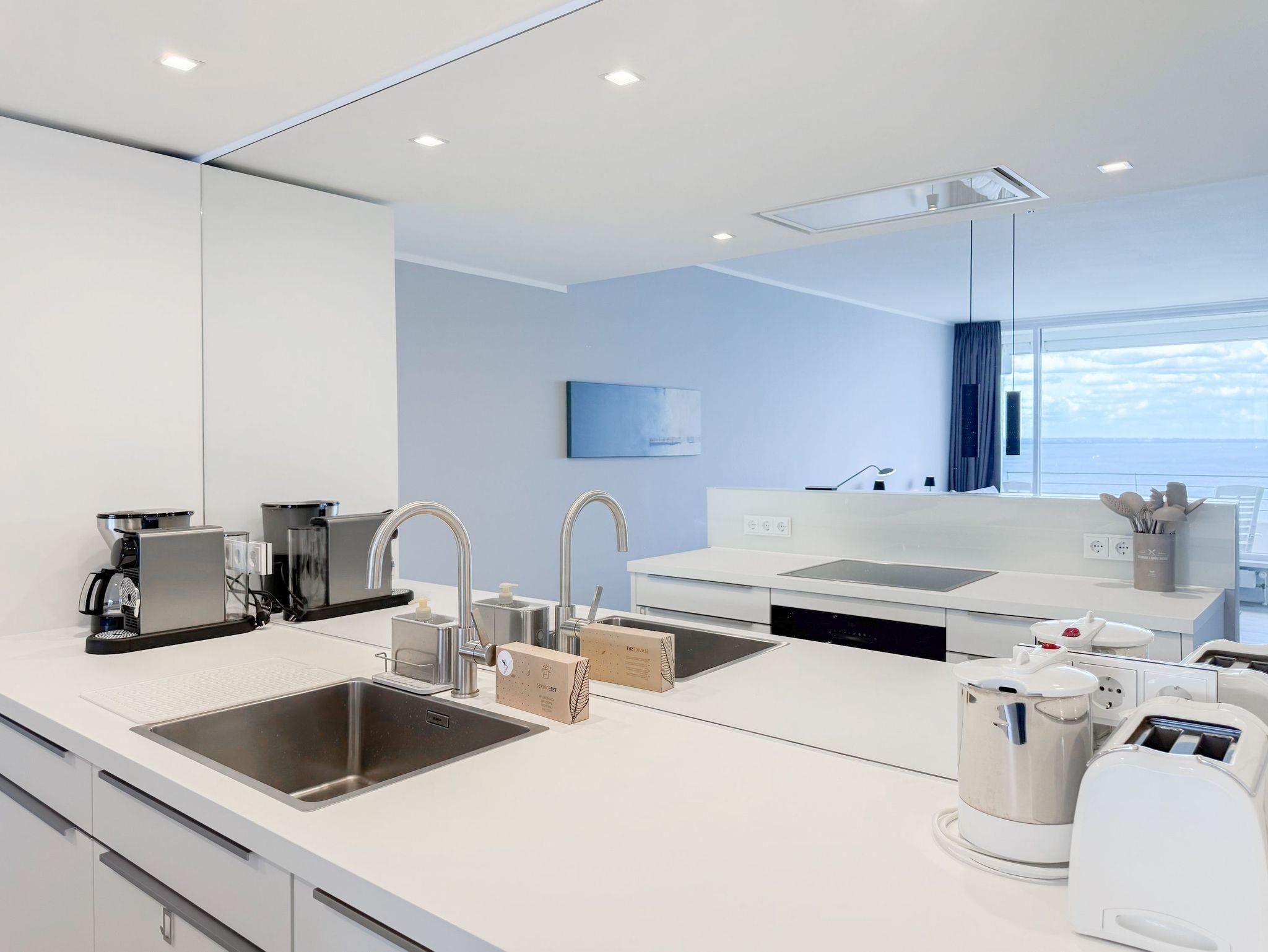Die traumhafte Ferienwohnung Bay Oase bietet auf 75 qm höchsten Wohnkomfort durch eine luxuriöse Ausstattung und ein stilvolles Interieur bis ins letzte Detail, gestaltet durch eine Innenarchitektin, die ihr Handwerk versteht. Der großzügige Sonnenbalkon ist mit Gartenmöbeln und einer elektrischen Markise ausgestattet und sowohl vom Wohnzimmer als auch vom Schlafzimmer zugänglich. Genießen Sie tagsüber das beeindruckende Meerblickpanorama aus fast jedem Raum und bei Nacht die besondere Atmosphäre der beleuchteten Lübecker Bucht. Der in warmen, hellen Farbtönen gestaltete Wohn- und Essbereich besticht durch eine hochwertige Einrichtung und einen herrlichen Meerblick. Hier finden Sie ein gemütliches Sofa mit Loungeteil, TV, Radio und WLAN. Der Essbereich bietet Platz für vier Personen, und die integrierte Design-Küche lässt keine Wünsche offen. Das große Meerblickschlafzimmer ist mit einem Doppelbett (180x200), einem geräumigen Kleiderschrank und TV ausgestattet. Das kleinere Kojenschlafzimmer (ohne Fenster) verfügt über zwei Einzelbetten (80x200) und eine Schiebetür mit Bullauge, die für Tageslicht sorgt. Das moderne Badezimmer ist mit einem Waschtisch, Dusche, Handtuchwärmer, viel Ablagefläche und einem integrierten Waschtrockner ausgestattet. Die Steckdosen verfügen über integrierte USB Anschlüsse. Ein abschließbarer Fahrradraum für 2 Fahrräder und ein fester PKW Stellplatz in der Hotelgarage (Einfahrtshöhe 1,90/kein Aufzug) sind inklusive. (Der Stellplatz ist für große Fahrzeuge ungeeignet). Bei Verlust der Parkkarte ist Ersatz zu leisten. Ein Fahrtstuhl im Gebäude ist vorhanden.
