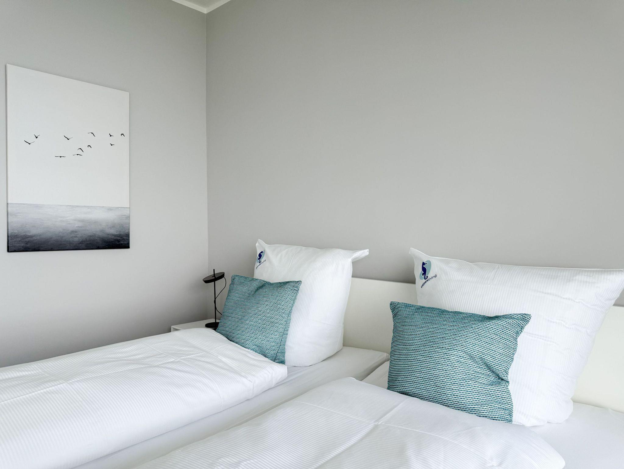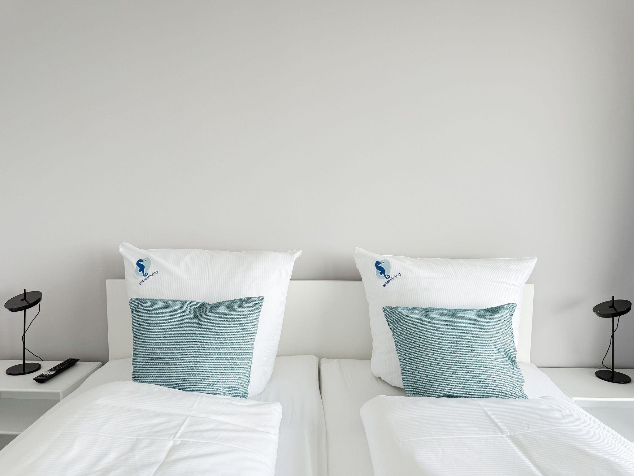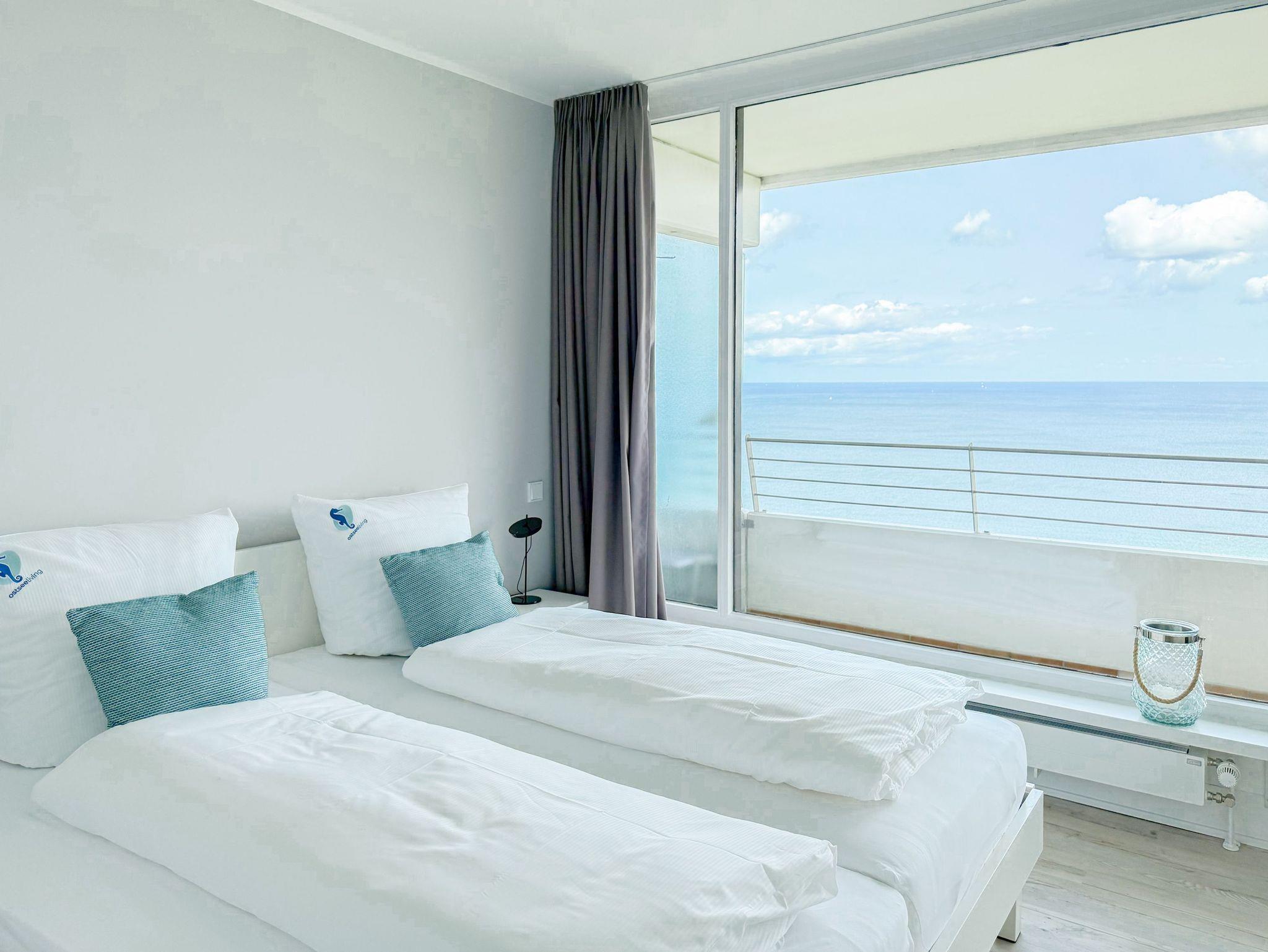 Die traumhafte Ferienwohnung „Bay Oase“ bietet auf 75 qm höchsten Wohnkomfort durch eine luxuriöse Ausstattung und ein stilvolles Interieur bis ins letzte Detail, gestaltet durch eine Innenarchitektin, die ihr Handwerk versteht. Der großzügige Sonnenbalkon ist mit Gartenmöbeln und einer elektrischen Markise ausgestattet und sowohl vom Wohnzimmer als auch vom Schlafzimmer zugänglich. Genießen Sie tagsüber das beeindruckende Meerblickpanorama aus fast jedem Raum und bei Nacht die besondere Atmosphäre der beleuchteten Lübecker Bucht. Der in warmen, hellen Farbtönen gestaltete Wohn- und Essbereich besticht durch eine hochwertige Einrichtung und einen herrlichen Meerblick. Hier finden Sie ein gemütliches Sofa mit Loungeteil, TV, Radio und WLAN. Der Essbereich bietet Platz für vier Personen, und die integrierte Design-Küche lässt keine Wünsche offen. Das große Meerblickschlafzimmer ist mit einem Doppelbett (180x200), einem geräumigen Kleiderschrank und TV ausgestattet. Das kleinere Kojenschlafzimmer (ohne Fenster) verfügt über zwei Einzelbetten (80x200) und eine Schiebetür mit Bullauge, die für Tageslicht sorgt. Das moderne Badezimmer ist mit einem Waschtisch, Dusche, Handtuchwärmer, viel Ablagefläche und einem integrierten Waschtrockner ausgestattet. Die Steckdosen verfügen über integrierte USB Anschlüsse. Ein abschließbarer Fahrradraum für 2 Fahrräder und ein fester PKW Stellplatz in der Hotelgarage (Einfahrtshöhe 1,90/kein Aufzug) sind inklusive. (Der Stellplatz ist für große Fahrzeuge ungeeignet). Bei Verlust der Parkkarte ist Ersatz zu leisten. Ein Fahrtstuhl im Gebäude ist vorhanden.
