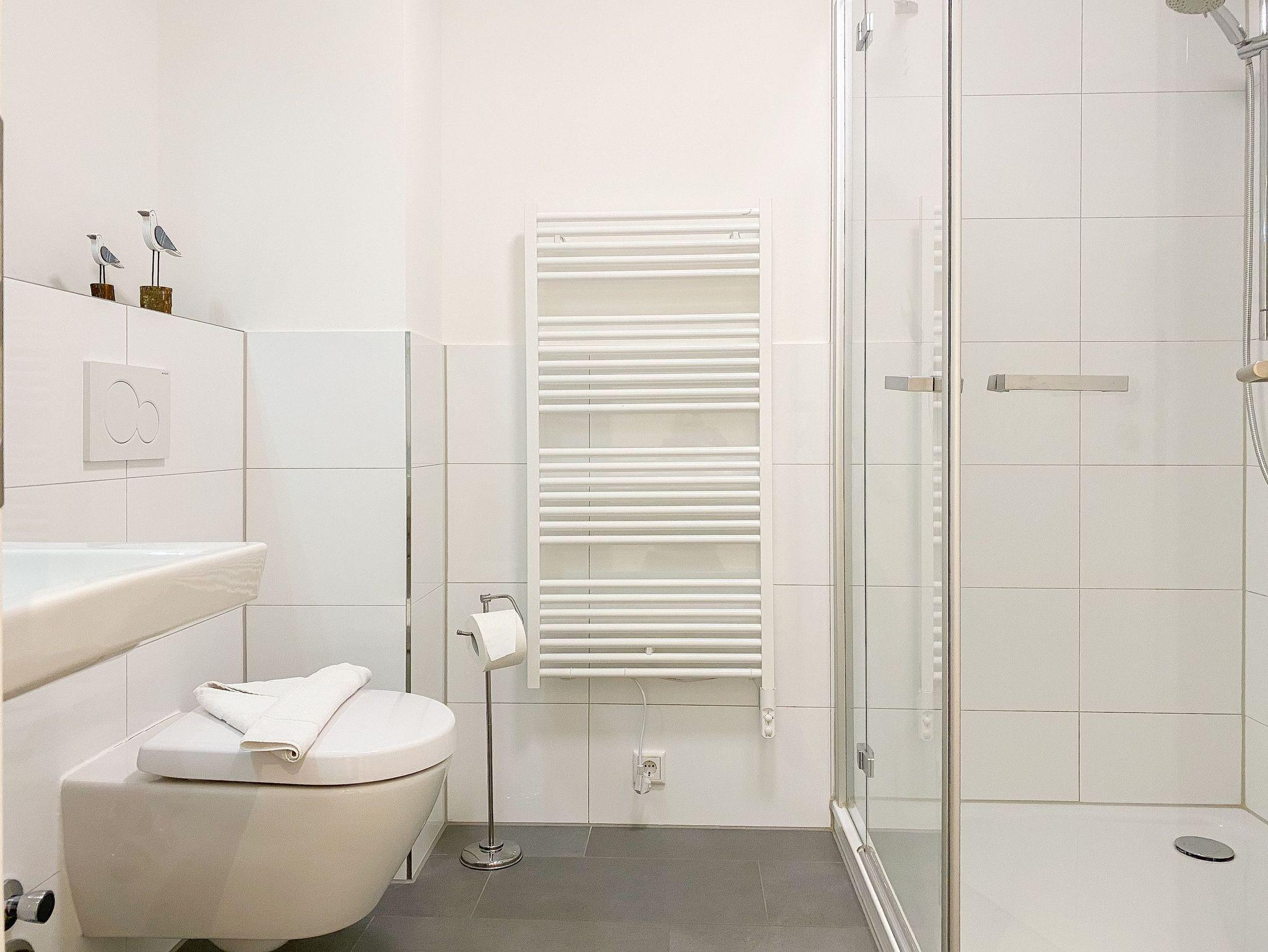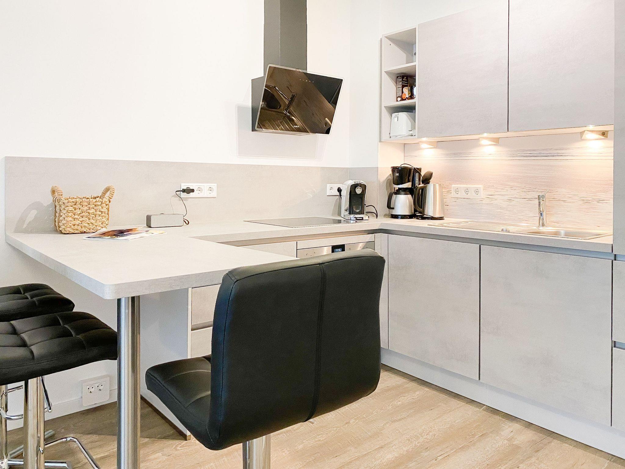 Die Ferienwohnung Lütte Krabbe bietet ausreichend Platz für 2-3 Personen. Große, bodentiefe Fensterelemente sorgen für einen hellen, freundlichen Wohnbereich, der mit einem Sofa mit Schlaffunktion, zwei Sesseln und TV ausgestattet ist. Auf der Sonnenterrasse in Südausrichtung, die sich über die gesamte Breite der Wohnung erstreckt, lässt es sich mit reichlich Sonnenschein vom Frühstück bis zum Abend herrlich entspannen. Die offene Küche mit integriertem Essbereich verfügt über alle technischen Geräte wie Backofen, Ceranfeld und Geschirrspüler sowie alle notwendigen Küchenutensilien. Das separate Schlafzimmer ist mit einem Doppelbett (180x200) und ausgestattet verfügt ebenfalls über einen Terrassenzugang.[nbsp] Alle Räume sind mit elektrischen Außenjalousien versehen und lassen sich vollständig verdunkeln. Das moderne Duschbad verfügt über Fußbodenheizung und einen Handtuchwärmer. WLAN steht selbstverständlich zur kostenlosen Nutzung zur Verfügung.