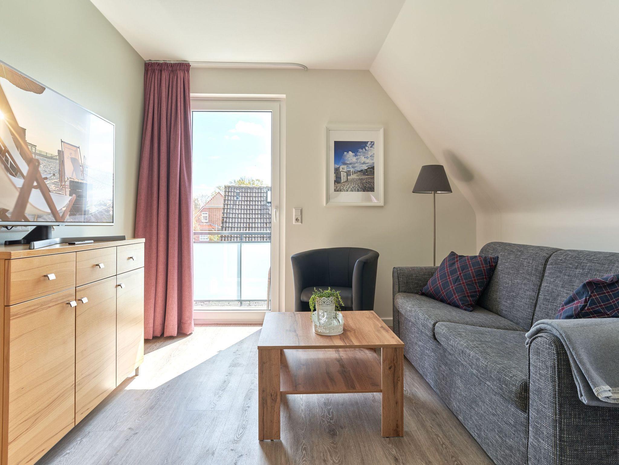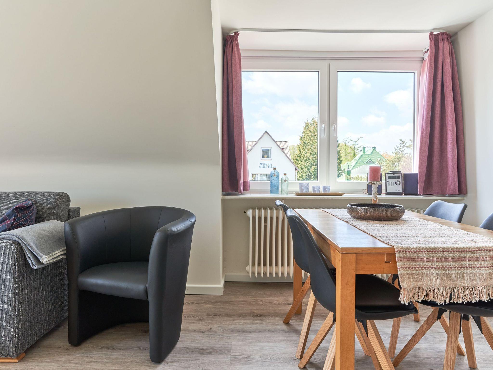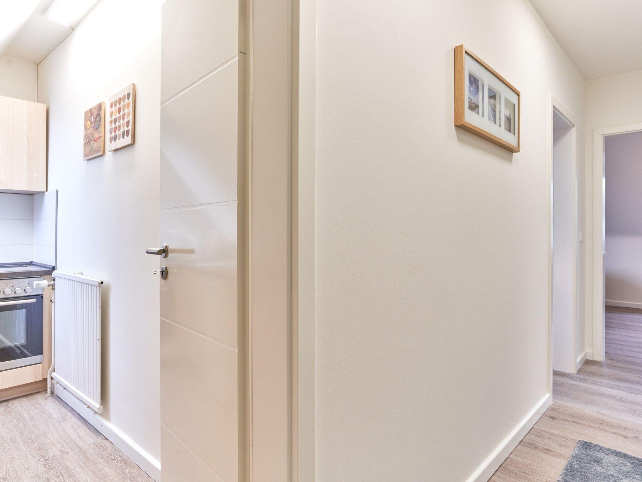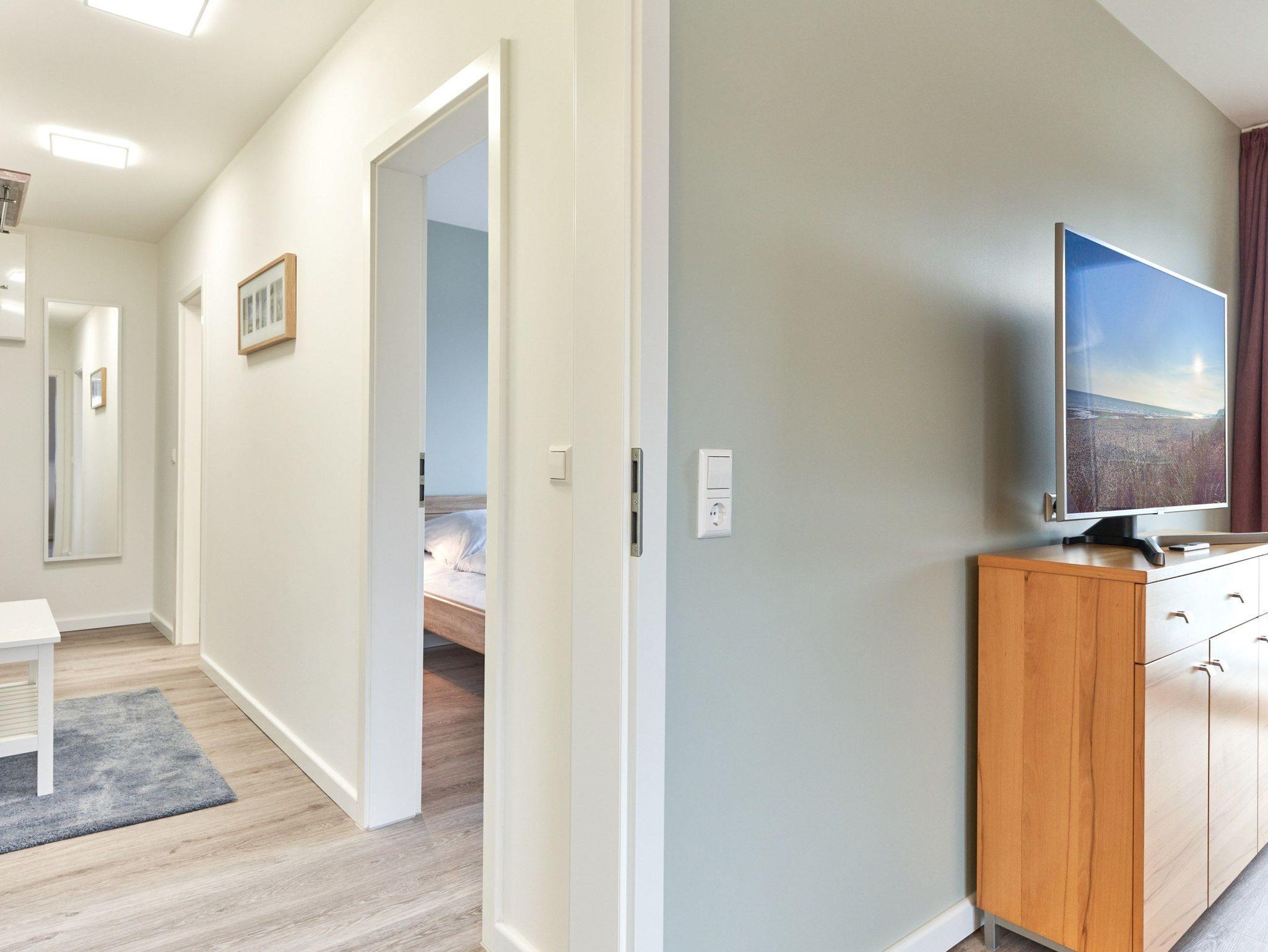 Dieses in 2022 umfassend renovierte Apartment teilt sich auf in Küche, Flur, Bad, Schlafzimmer, Wohnzimmer und Balkon Die Einbauküche ist komplett ausgestattet und im neu gestalteten, kleinen aber feinen Badezimmer finden Sie eine Echtglasdusche, neue Badobjekte sowie einen Badheizkörper für Handtücher. Der moderne Wohnbereich ist mit großzügigem Erkerfenster, Sofa (mit Schlafoption für eine dritte Person), Flachbildschirmfernseher, sowie einem Essplatz ausgestattet. Zusätzlichen Stauraum bieten eine Kommmode sowie ein Bücherregal. Im modern eingerichteten Schlafzimmer finden Sie ein Doppelbett, einen offenen Kleiderschrank und einen zweiten Fernseher. Verdunkelungsgardinen sorgen in Wohn- und Schlafzimmer für eine gemütliche Atmosphäre und ungestörten Schlaf.