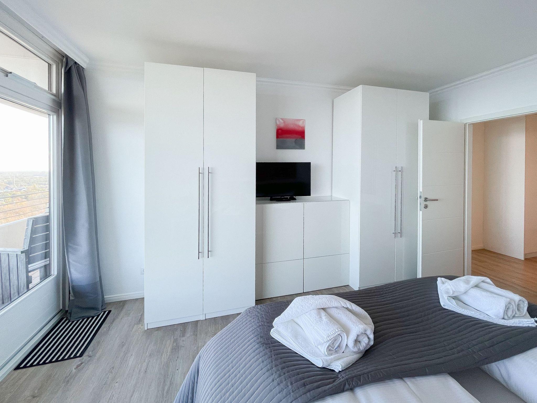Die großzügige Eckwohnung bietet[nbsp] mit 2 Schlafzimmern und 2 Bädern auf 120 qm höchsten Wohnkomfort für 4 Personen, um einen entspannten Urlaub zu verleben. Der umlaufende Sonnenbalkon ist sowohl vom Wohnbereich als auch von den [nbsp]beiden Schlafzimmern zugänglich. Genießen Sie tagsüber das sensationelle Meerblickpanorama aus nahezu jedem Raum und bei Dunkelheit die besondere Atmosphäre der beleuchteten Lübecker Bucht. Es steht ein großzügiges[nbsp] Wohnzimmer mit anschließendem Essbereich für 4 Personen zur Verfügung. In der offenen, bestens ausgestatteten Designküche mit Induktionskochfeld, Mikrowelle und Spülmaschine, ist ebenfalls eine Waschmaschine untergebracht. Die beiden Schlafzimmer sind jeweils mit einem Doppelbett (180x200 und 160x200) und TV ausgestattet. Die Fenster sind mit Verdunkelungsvorhängen versehen. Zwei neue, hochwertige Bäder, eines mit Dusche und eines mit Badewanne, runden das Angebot ab. Ein fester PKW Stellplatz in der Hotelgarage (Einfahrtshöhe 1,90/kein Aufzug) ist[nbsp] inklusive. Bei Verlust der Parkkarte ist Ersatz zu leisten.