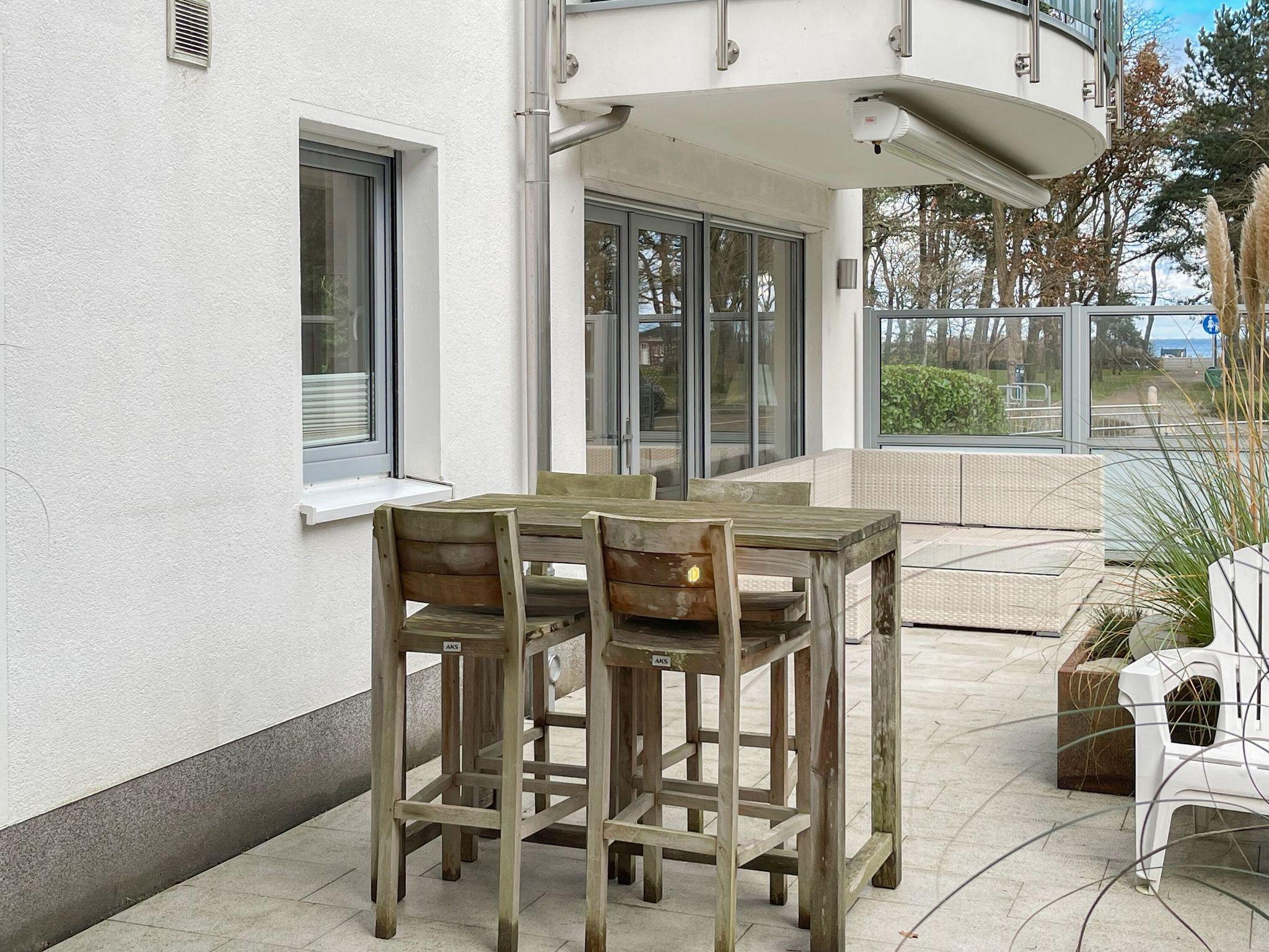 Ein absolutes Highlight dieser Wohnung ist die große Terrasse in Südost-Ausrichtung mit gemütlichen Loungemöbeln, Markise und Blick bis auf die Ostsee. Die Terrassentür lässt sich mit dem Hausschlüssel öffnen und dient als privater Eingangsbereich, sodass Sie direkt über die eigene Terrasse und durch den Garten mit wenigen Schritten am Strand sind. Die Ferienwohnung ist äußerst großzügig geschnitten, gut ausgestattet und geschmackvoll eingerichtet, sodass ein hoher Wohnstandard in einem schönen Ambiente gewährleistet ist. Bodentiefe Fenster sorgen für helle und sonnige Räumlichkeiten und ermöglichen einen schönen Blick bis auf die Ostsee. Alle Fenster sind mit elektrischen Außenjalousien versehen und die Fußbodenheizung sorgt für ein angenehmes Raumklima. Es erwartet Sie ein großzügiger Wohnbereich, eingerichtet mit einem gemütlichen Sofa, TV, WLAN und Sonos Anlage. Die offene Luxusküche mit Insel und angrenzendem Essbereich ist bestens ausgestattet und macht Lust auf gemeinsames Kochen.[nbsp] Es stehen zwei separate Schlafzimmer mit Doppelbetten (180x200) und TV zur Verfügung.[nbsp] Das Bad ist sehr hochwertig mit Walk IN Dusche und integrierter Waschmaschine und Trockner. Ein separates Gäste WC ist ebenfalls vorhanden. Das Haus am Meer verfügt über einen Fahrstuhl und eine Tiefgarage (Einfahrtshöhe 2 m), in der ein fester Stellplatz reserviert ist. Ein Fahrradkeller ist vorhanden.