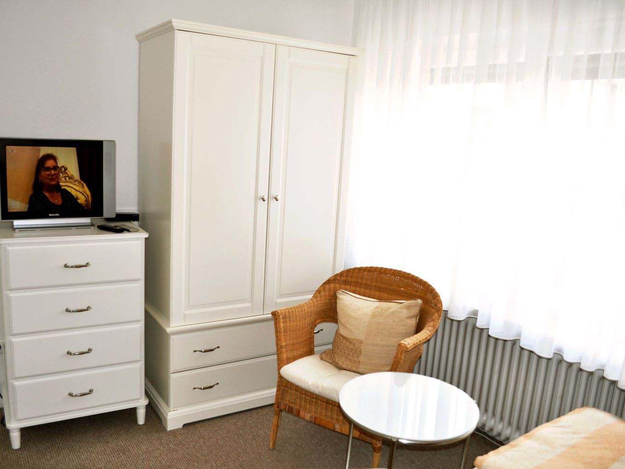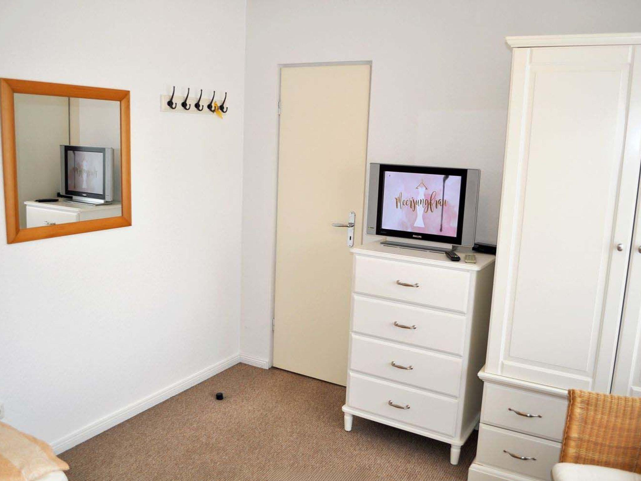 Schlafzimmer 1: 2 Kommoden, 2 Tischlampen, Einzelbett 2,00 x 0,80 m, elektrische Aussenrollladen, Flachbildschirm, Garderobe, Korbsessel, Sat-TV, Spiegel, Tisch