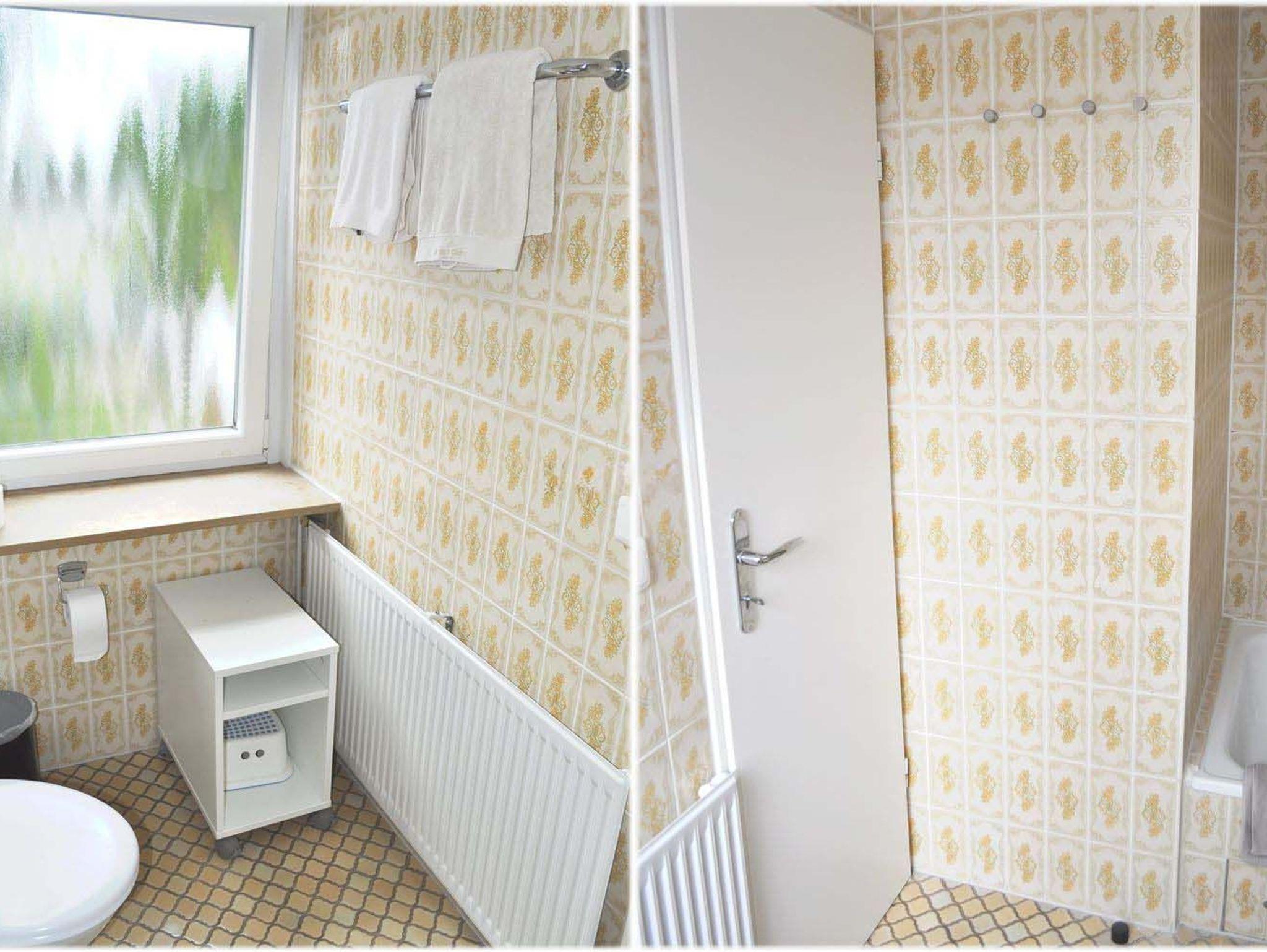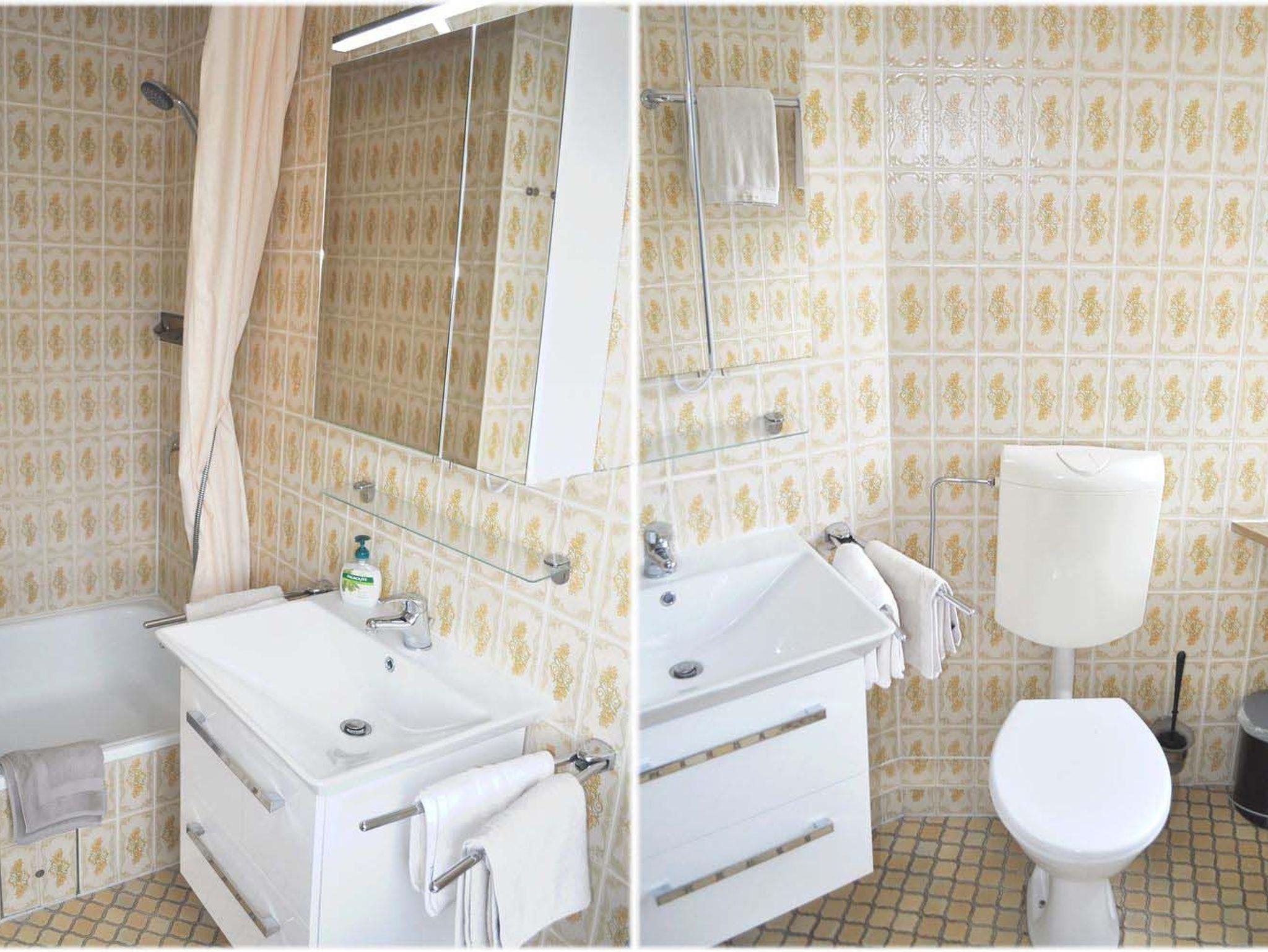 Bad 1: Dusche, Rollwagen, Spiegelschrank, Unterschrank, Waschbecken, WC