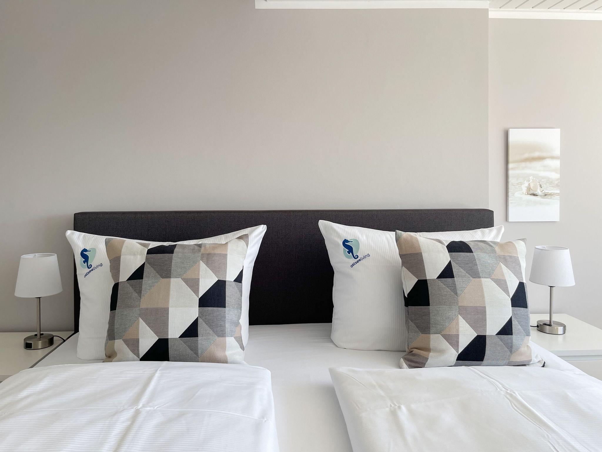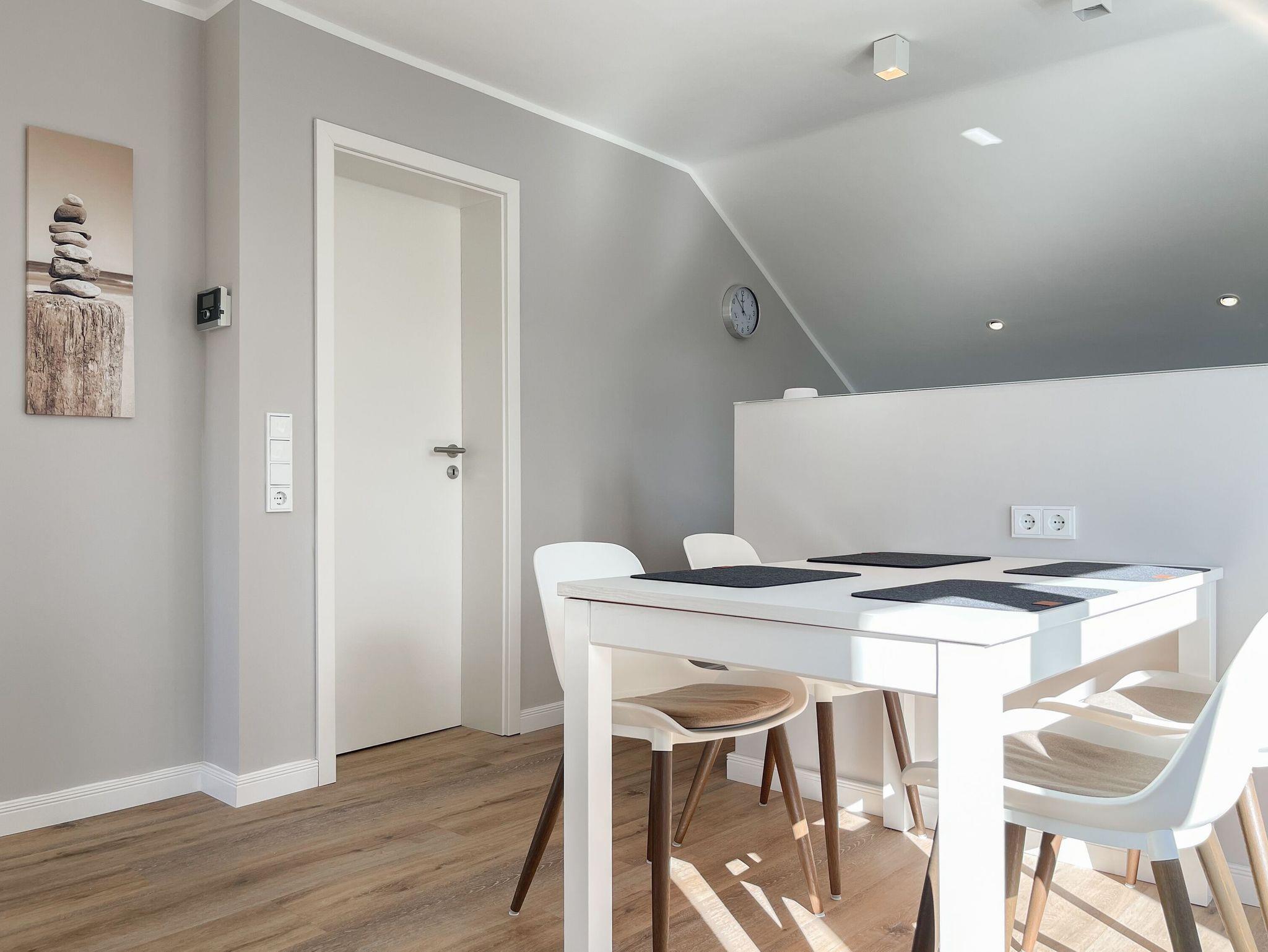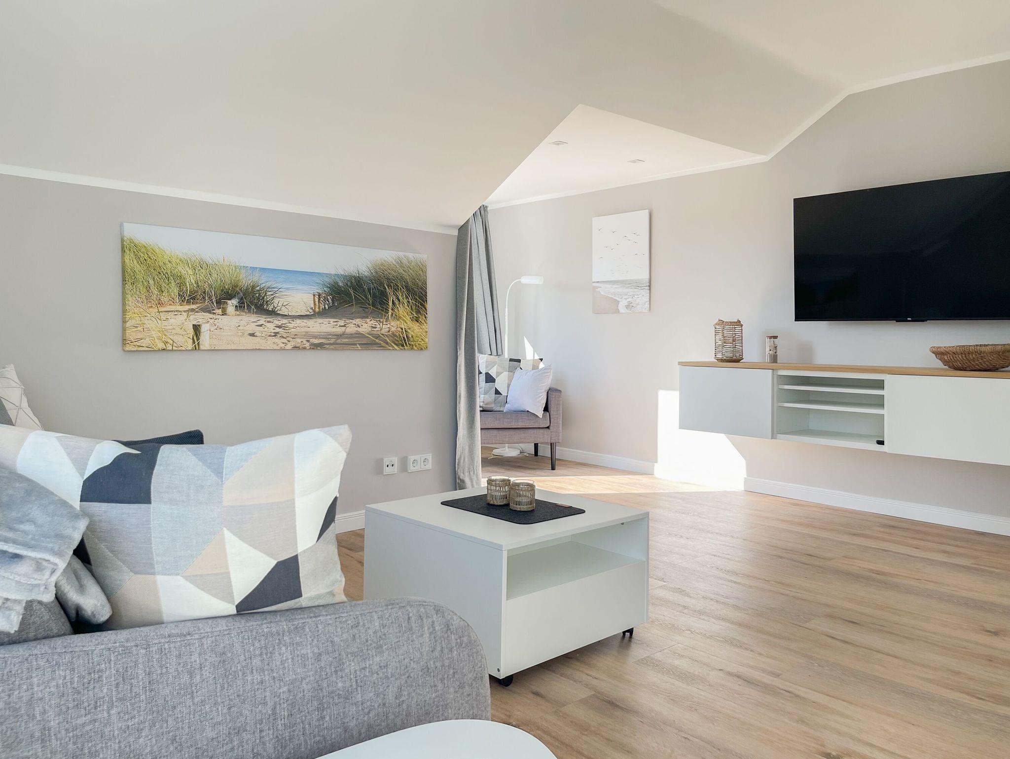 Im Jahr 2024 frisch und aufwendig renoviert, erwartet Sie in der Endetage (2. Stock) eine lichtdurchflutete Wohlfühloase für Ihren wohlverdienten Ostseeurlaub. Großzügige Räumlichkeiten, warme Farben und eine hochwertige Ausstattung sorgen für einen hohen Wohnstandard in einem schönem Ambiente. Der sonnige Wohnbereich ist mit einem komfortablen Schlafsofa und einer gemütlichen Leseecke eingerichtet. Der anschließende Essbereich für 4 Personen ist geschickt mit einem Einbauteil vom Kochbereich abgetrennt. Die hochwertige Einbauküche in perfekter Ausstattung, wie Spülmaschine, Backofen, Mikrowelle, Induktionskochfeld, Radio und vielem mehr, lässt keine Wünsche offen und fügt sich wunderbar in den Wohnraum ein. Die Süd-Loggia mit schönem Weitblick und vielen Sonnenstunden ist mit Tisch und 2 Stühlen ausgestattet. Das großzügige Schlafzimmer verfügt über ein Boxspringbett (180x200), einen Kleiderschrank mit reichlich Stauraum, TV und einen Schreibtisch für das Homeoffice. Koffer können im anschließenden Abstellraum untergebracht werden. Die Wohnung verfügt neben einem modernen Duschbad mit Waschtisch, WC und Fenster über ein separates Gäste WC mit integriertem Waschtrockner. WLAN (Glasfaser) steht selbstverständlich zur Verfügung.
