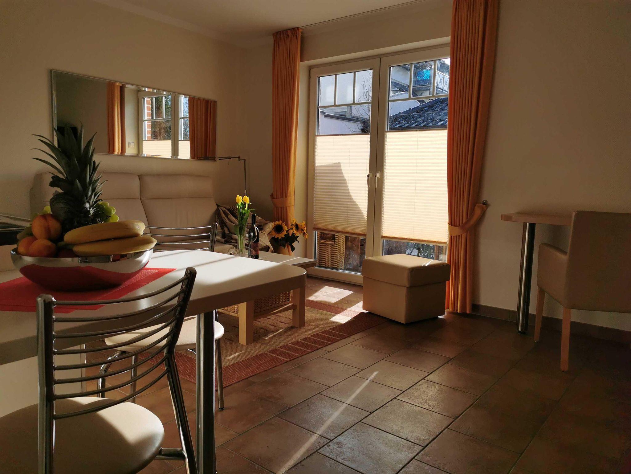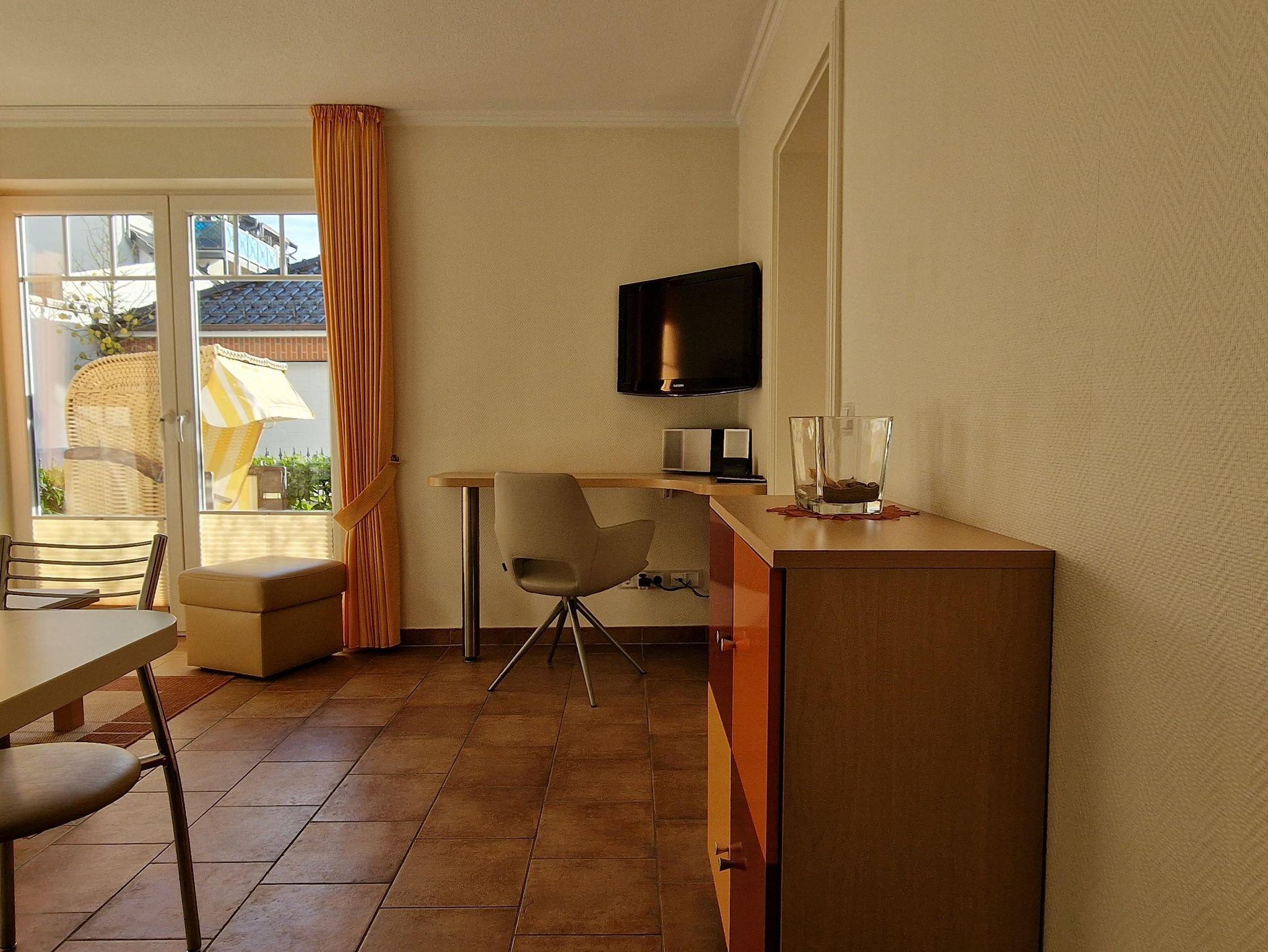 Die Wohnung befindet sich im Erdgeschoss am Kurpark, Kurparkstr. 7, optimale Appartment-Aufteilung ca.44m². Sie ist neuwertig, voll möbliert und mit allem Komfort wie zwei Fernseher mit Radio u. Musiksender versehen. Wohn- und Essbereich mit Ausgang auf die abgeschlossene möblierte Süd-West Sonnenterrasse mit Strandkorb u. Markiese, Schlafzimmer, Flur, Duschbad, Einbauküche im Wohnbereich (Geschirrspüler, Backofen, Ceranfeld, Gefrierfach, Mikrowelle usw.) Alle Räume Terrakottafliesen, moderne Einrichtung, TV-Überwachung, Kabel-TV, Wlan, Aufzug, Fahrradabstellplatz. Im Haus befindet sich ein Sauna-Wellnessbereich, sowie Waschmaschine und Trockner. Unsere Preise variieren, je nach Saison, zzgl. Endreinigung, zubuchbar Wäschepaket Parkplatz Hund. Diese Ferienwohnung ist für 2 Personen, modern und mediterran, eingerichtet.