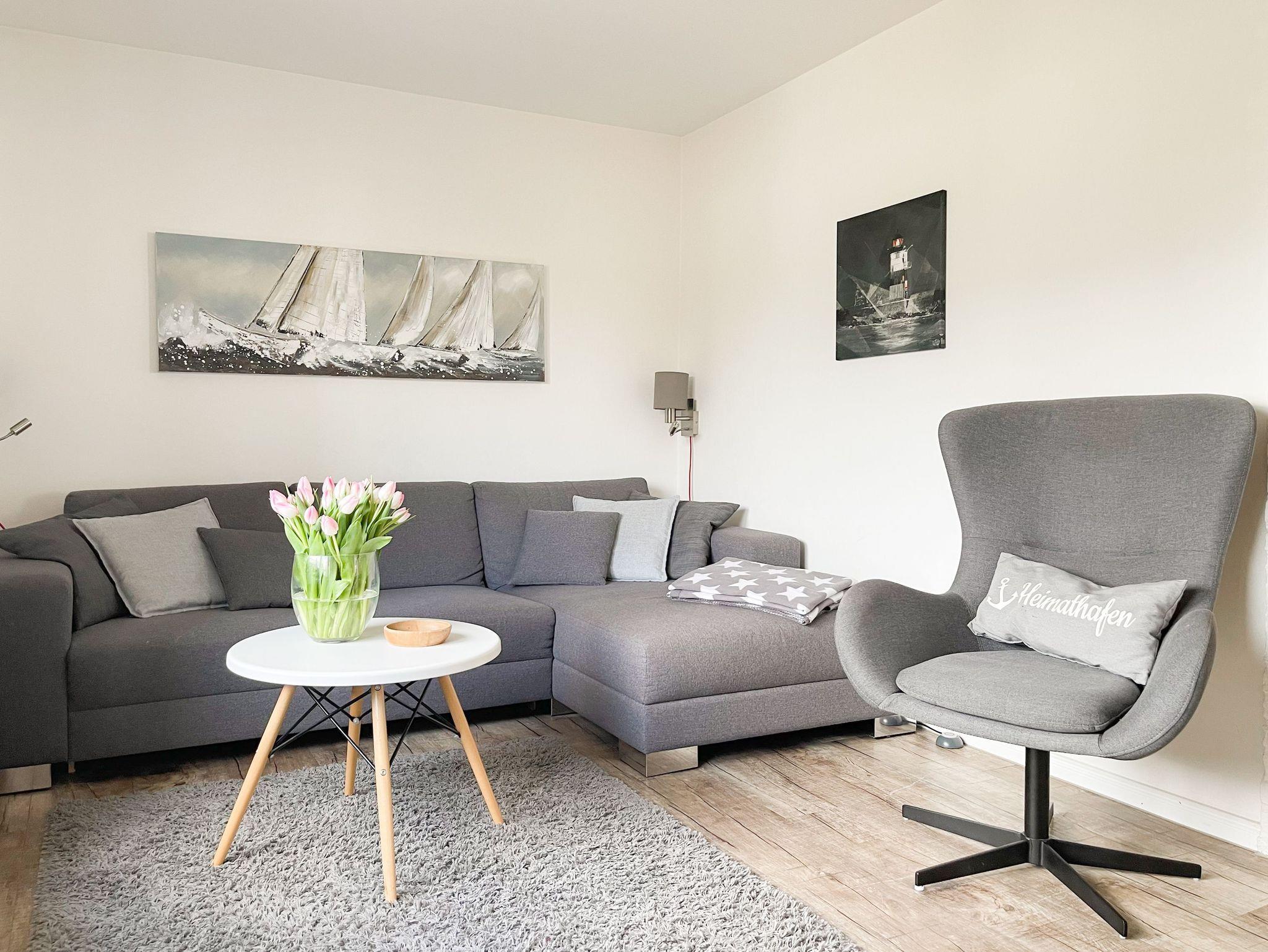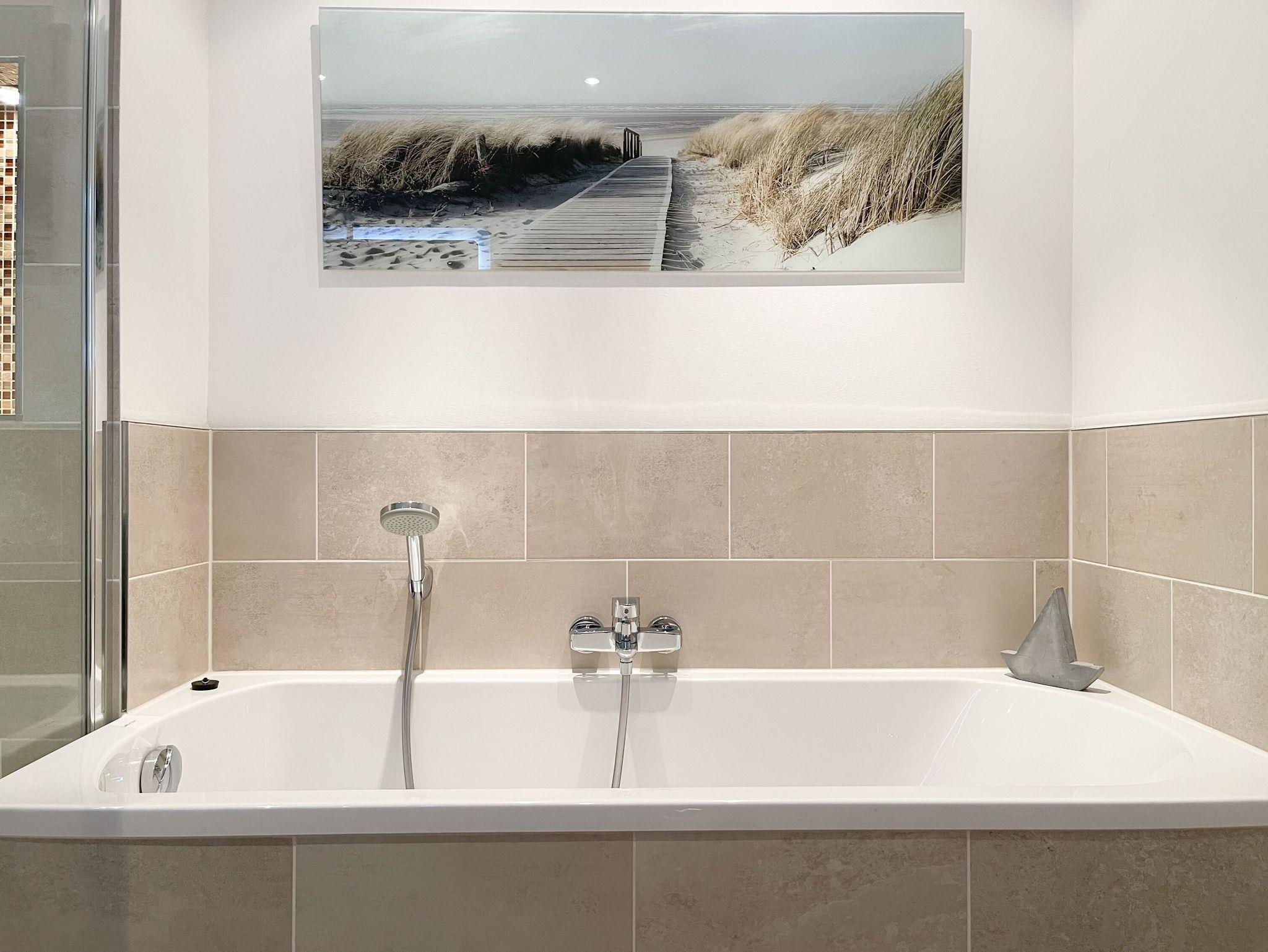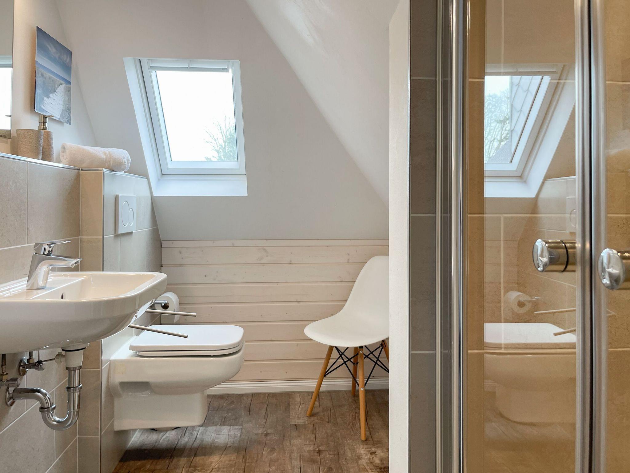 Mittelpunkt des Hauses bildet ein großzügig angelegter, heller Wohnbereich, hochwertig und geschmackvoll eingerichtet (TV, Hifi Anlage, WLAN) mit einem angrenzenden Essbereich, der ausreichend Platz für 6 Personen bietet. Die abgeschlossene Küche [nbsp]ist bestens ausgestattet. Der Bartresen mit zwei Barhockern ist als kleiner Frühstücksbereich oder Treffpunkt für gemeinsames Kochen gedacht. Ein hochwertiges Bad mit Dusche und Badewanne ist ebenfalls im Erdgeschoss untergebracht. Im Obergeschoss befindet sich ein Schlafzimmer mit zwei Einzelbetten (80x200) und ein modernes Duschbad en-suite sowie ein äußerst großzügiges Schlafzimmer mit einem Doppelbett (180x200), TV und Einbauschrank. Ein weiteres kleines Schlafzimmer ist mit einem Einzelbett, Sessel und Kommode eingerichtet.