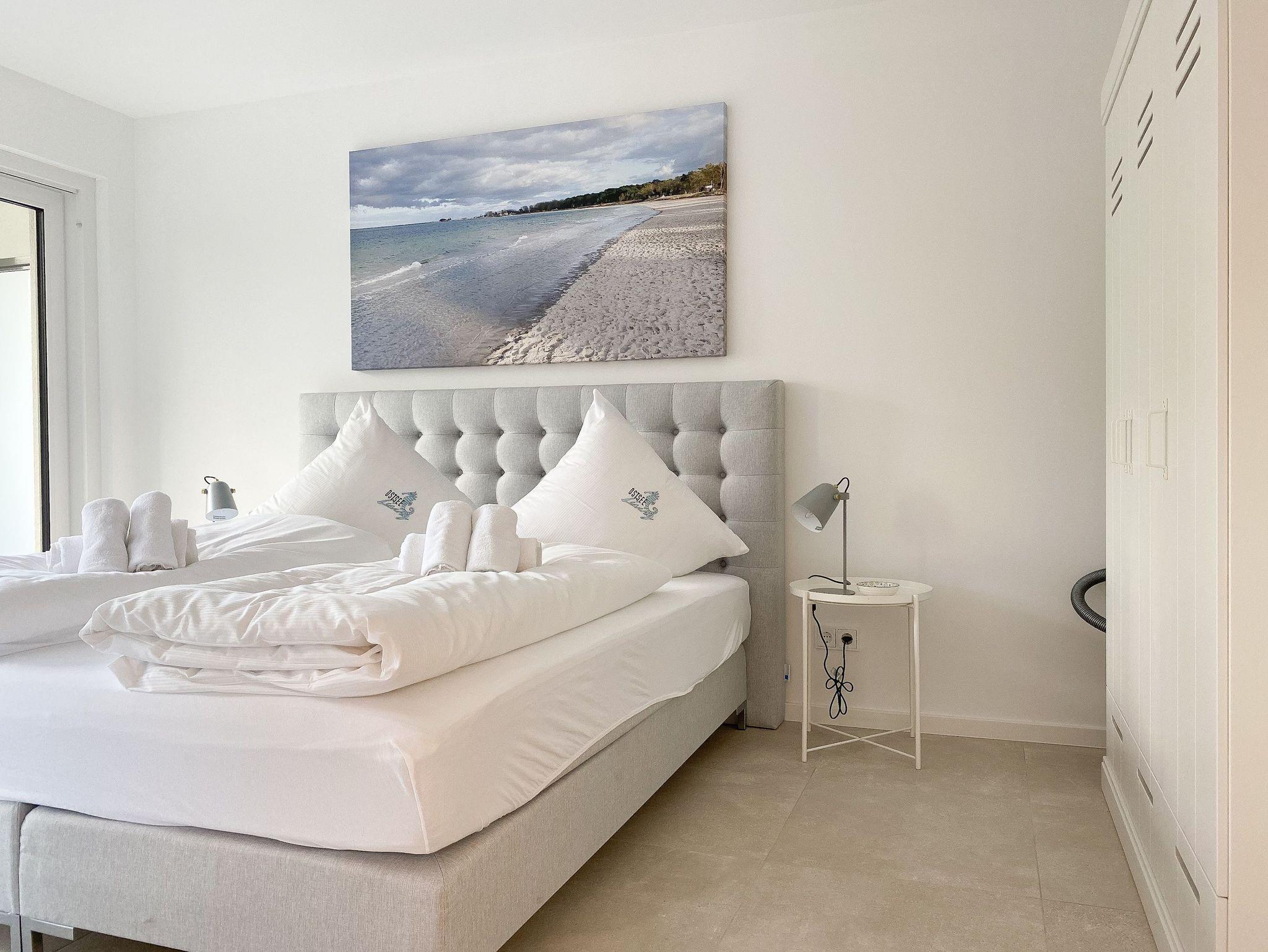 Die Ferienwohnung Wohnen am Strand 8 befindet sich im zweiten Obergeschoss und bietet mit einem Schlafzimmer, ausgestattet mit einem Boxspringbett (180x200 )[nbsp][nbsp]und TV sowie einem bequemen Schlafsofa im Wohnbereich (140x185), [nbsp]jeglichen Komfort für 3 bis 4 [nbsp]Personen, um einen entspannten Urlaub zu verleben. Der hochwertig eingerichtete Wohn- Essbereich bietet einen herrlichen Ausblick bis auf die Ostsee. Entspannen Sie auf Ihrem Balkon, der sich über die gesamte Breite der Wohnung erstreckt, Teilmeerblick, Brandungsrauschen und frische Ostseeluft inklusive.[nbsp] Es stehen insgesamt 2 TV, Radio und WLAN zur Verfügung. Die Wohnung ist mit Fußbodenheizung ausgestattet und alle Fenster sind mit elektrischen Außenjalousien versehen, die gleichermaßen für Verdunkelung oder Tageslicht mit Privatsphäre sorgen. Zur Wohnung gehört ein fester Tiefgaragenstellplatz (Einfahrtshöhe 1,90 m). Das Haus verfügt über einen Fahrstuhl und einen Fahrradkeller. Waschmaschine und Trockner stehen kostenlos zur gemeinschaftlichen Nutzung[nbsp] zur Verfügung.