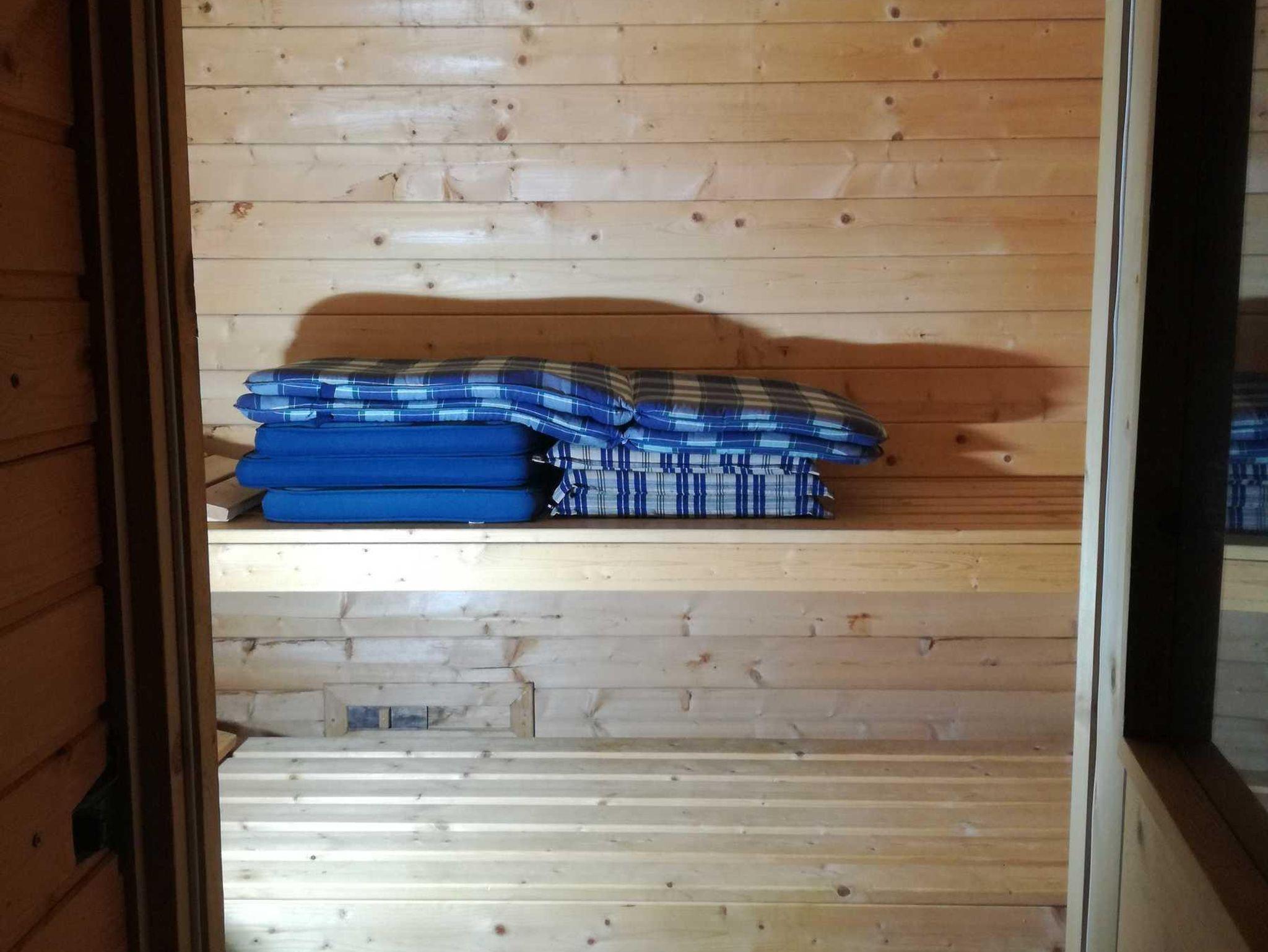 Eine Sauna mit großzügiger Nasszelle ( Duschbad ) im unteren Bereich.
