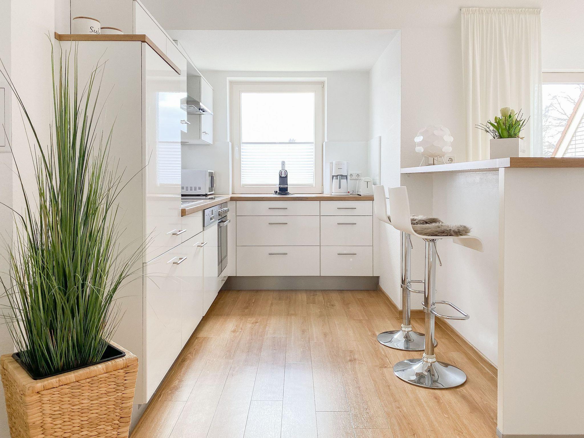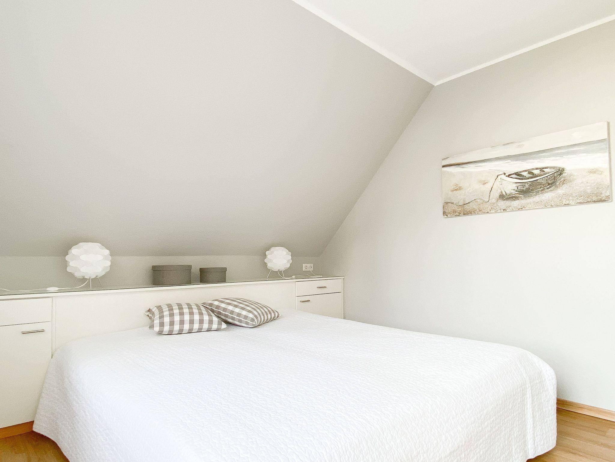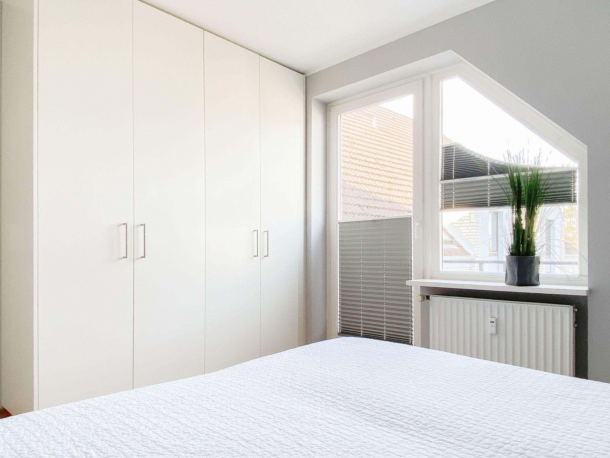 Die großzügige, liebevoll renovierte und geschmackvoll gestaltete Ferienwohnung im 2. Obergeschoss mit 2 Balkonen bietet auf ca. 83 qm ausreichend Platz für 5 Personen. Sie verfügt über ein Schlafzimmer mit Doppelbett (180x200) und vorgelagertem Balkon, ein weiteres Schlafzimmer auf der 2. Ebene ebenfalls mit einem Doppelbett (180x200) und TV sowie einen zusätzlichen Schlafbereich im Durchgangszimmer, ausgestattet mit einem Einzelbett (90x200). Alle Schlafzimmer sind mit Verdunkelungsplissees ausgestattet. Mittelpunkt der Wohnung ist der helle, freundliche Wohnraum mit abgrenzendem Essbereich. Die moderne, offene Einbauküche ist bestens ausgestattet mit Geschirrspüler, Mikrowelle, Backofen, Cerankochfeld sowie einer Frühstückstheke mit Barhockern. Vom Wohnbereich gelangt man auf den sonnigen Süd Balkon. Der Nord-West Balkon ist sowohl vom Flur als auch vom Schlafzimmer zu betreten. Das helle Duschbad verfügt über einen Handtuchwärmer und dank eines Fensters über Tageslicht.