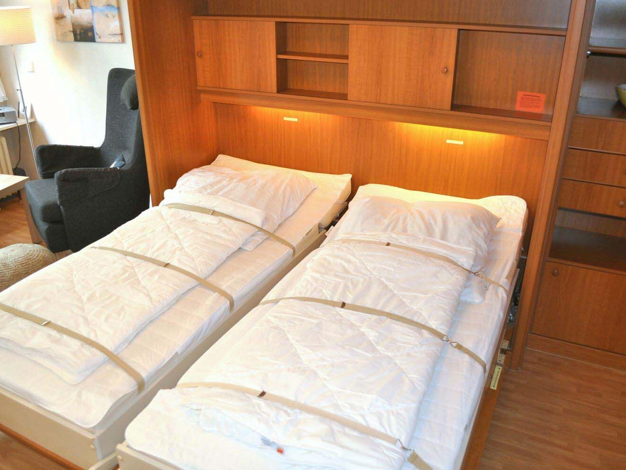 Für die Nacht lässt sich ganz einfach das Bett (2 Betten 90x200) ausklappen und am Tag klappen Sie es wieder zu, um den kompletten Raum zu nutzen.