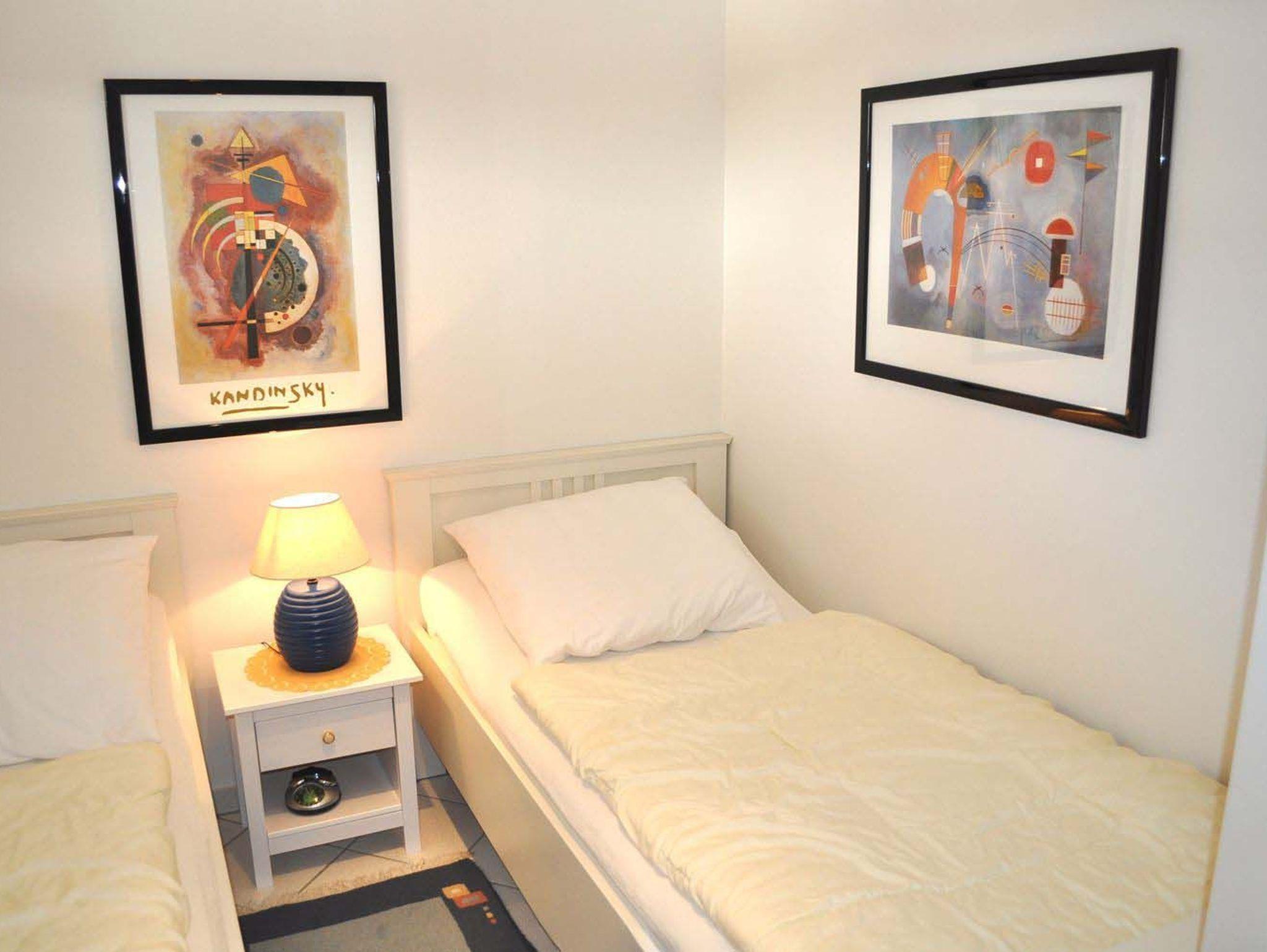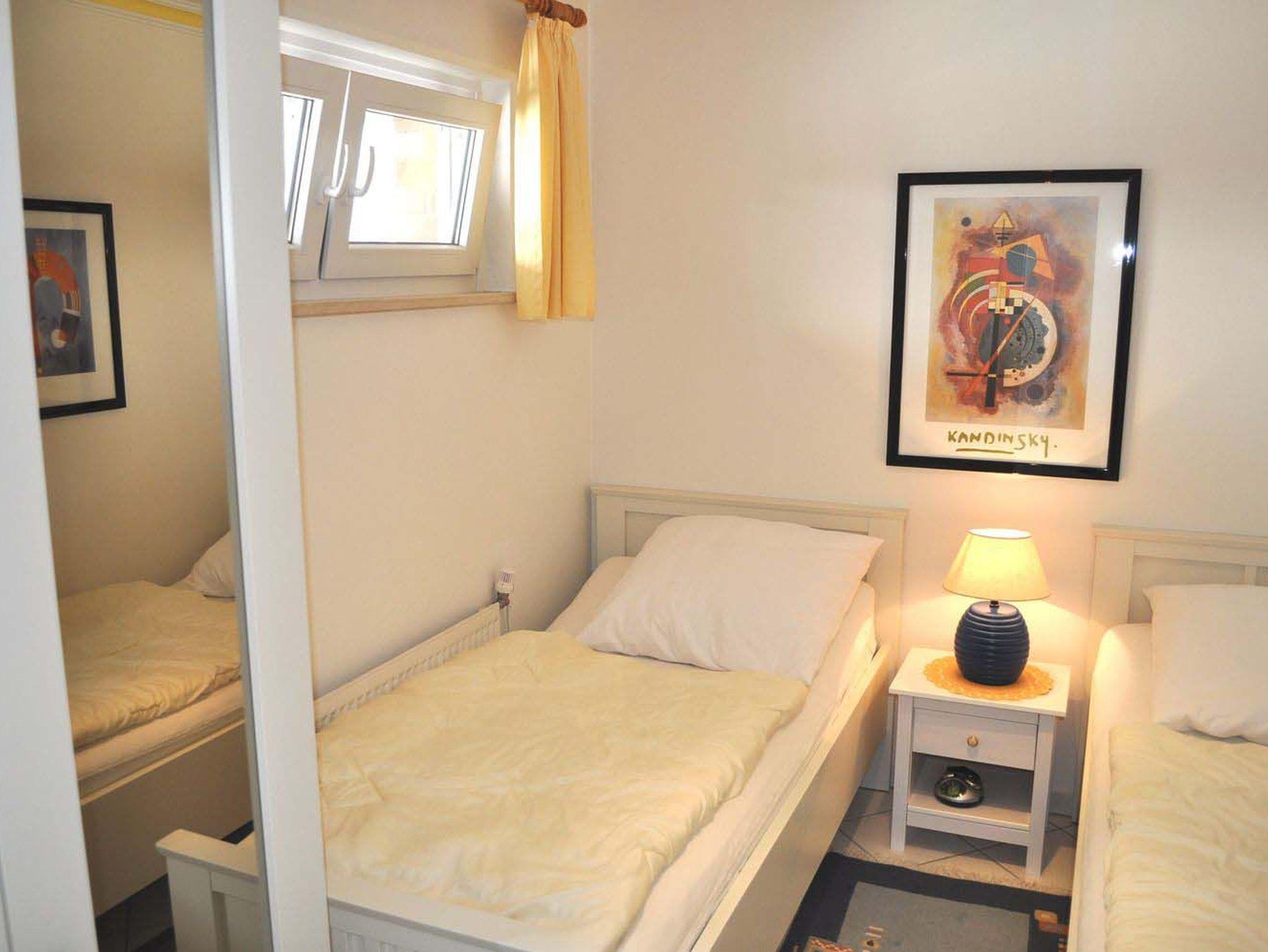 Schlafzimmer 1: 2 Einzelbetten 2,00 x 0,80 m, Kleiderschrank mit Spiegel, Nachttisch, Tischlampe, Wecker