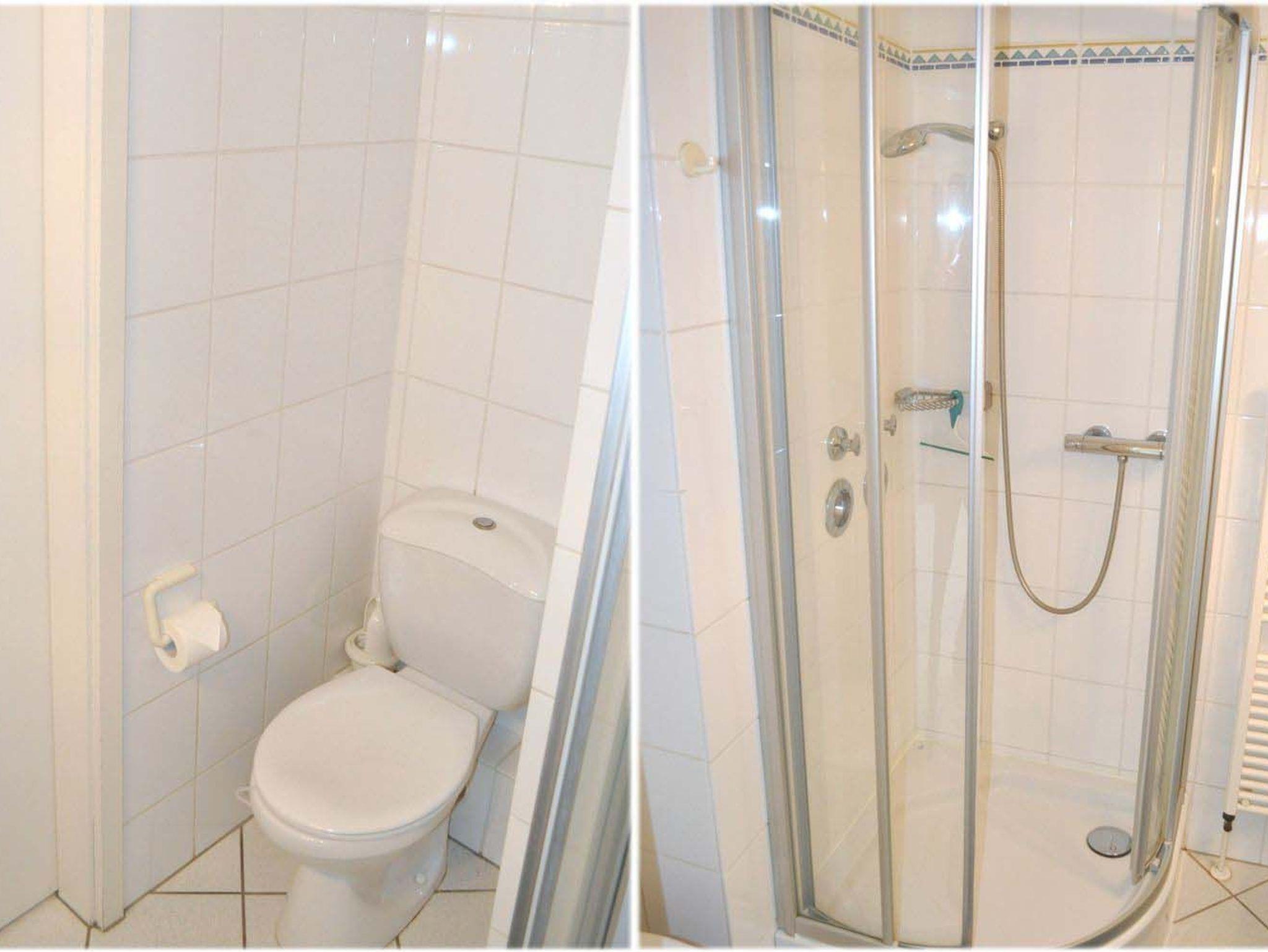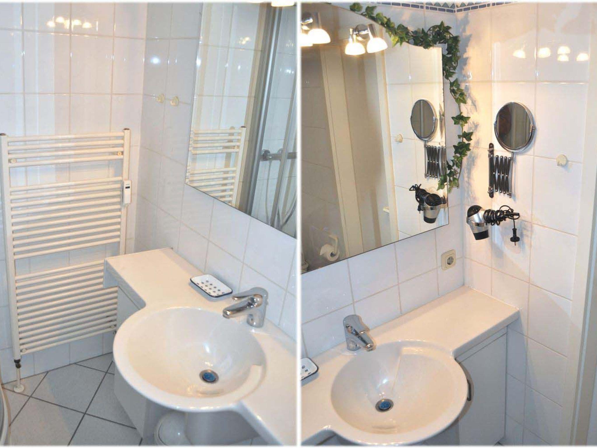 Bad 1: Dusche, Fön, Kosmetikspiegel, Spiegel, Waschbecken, Waschtisch mit Unterschrank, WC
