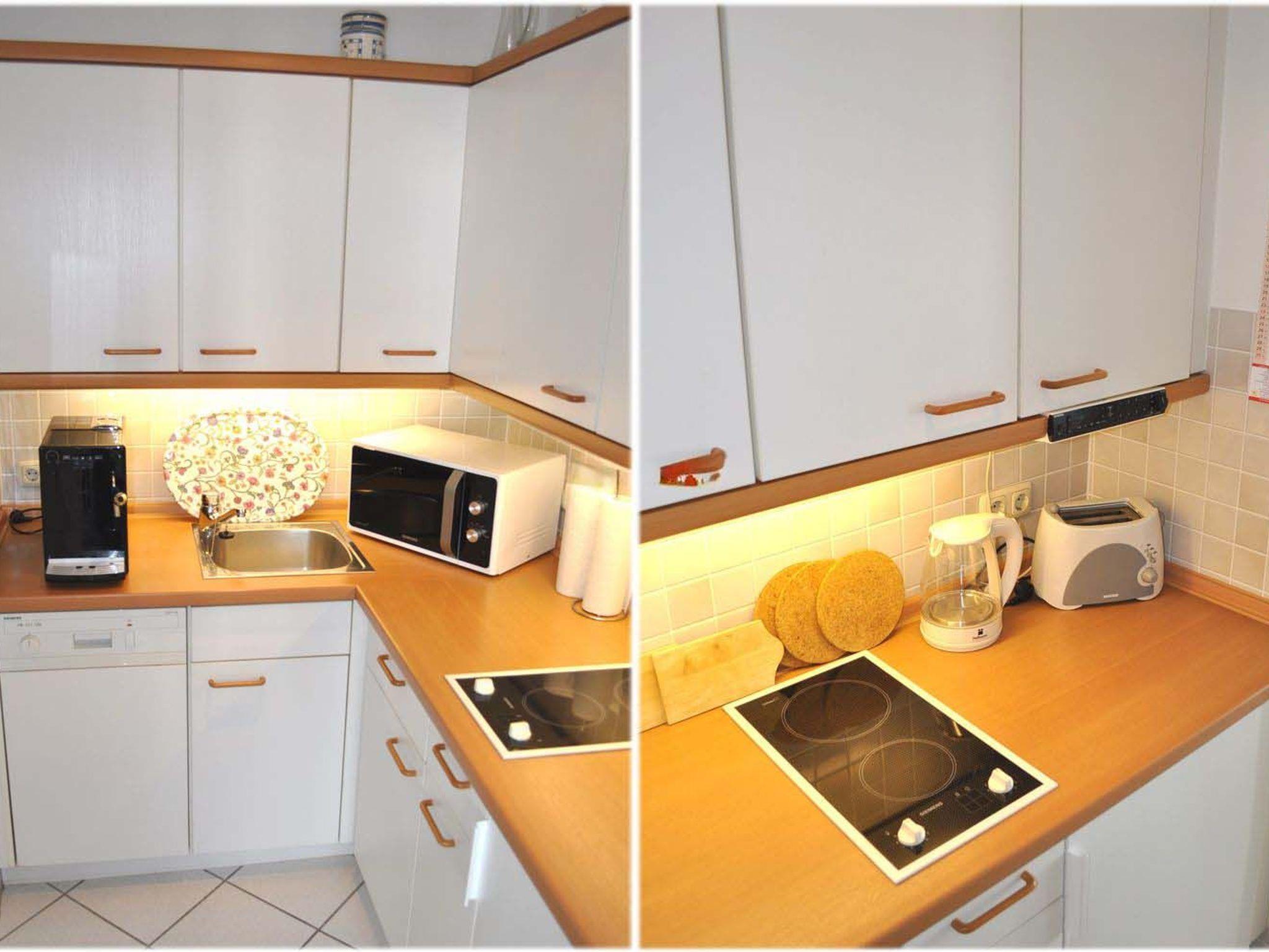 Küche: 2 Plattenherd mit Ceranfeld, Eierkocher, Einbauküche, elektrische Saftpresse, Geschirr, Handmixer, Kaffeemaschine, Kochtöpfe, Kühlschrank mit 3* Gefrierfach, Mikrowelle, Radio, Spülmaschine, Toaster, Wasserkocher
