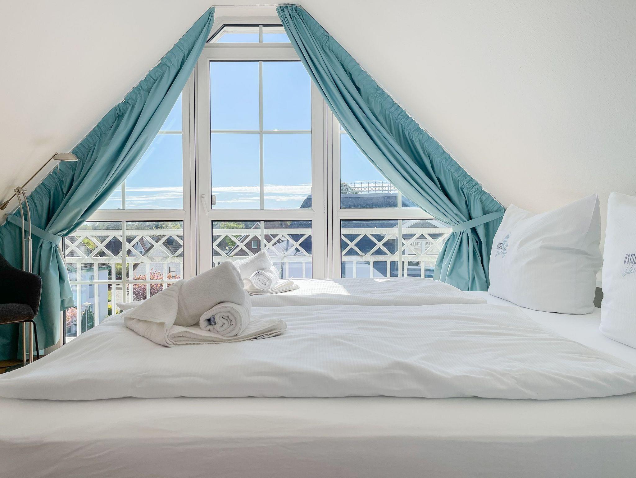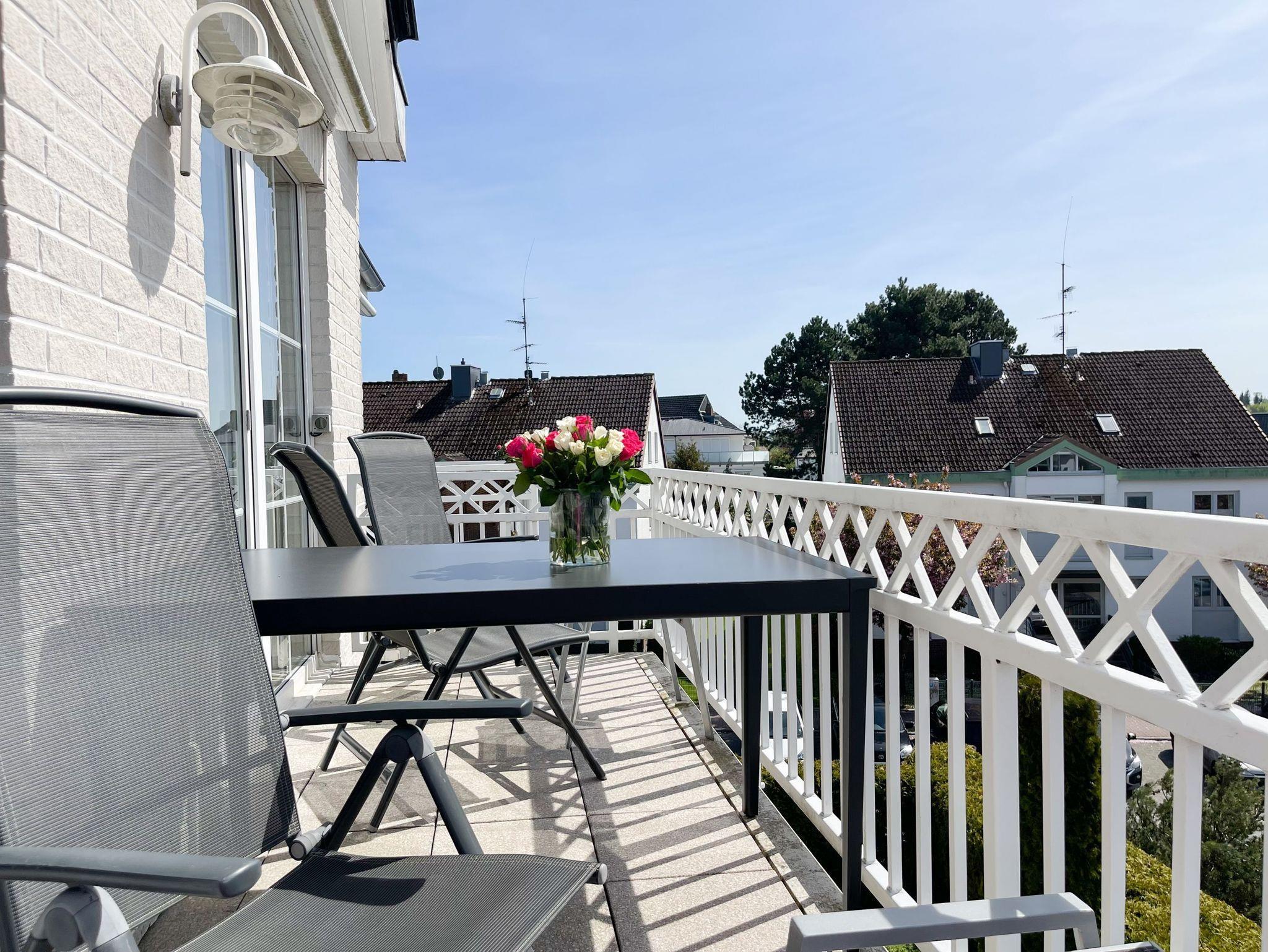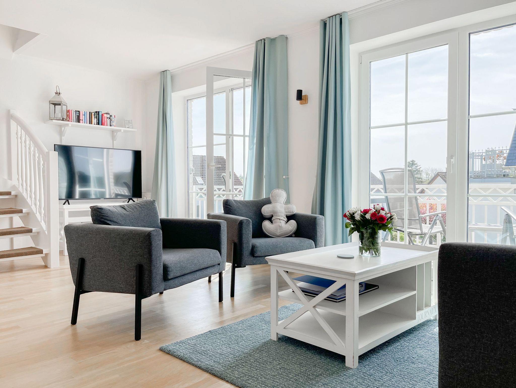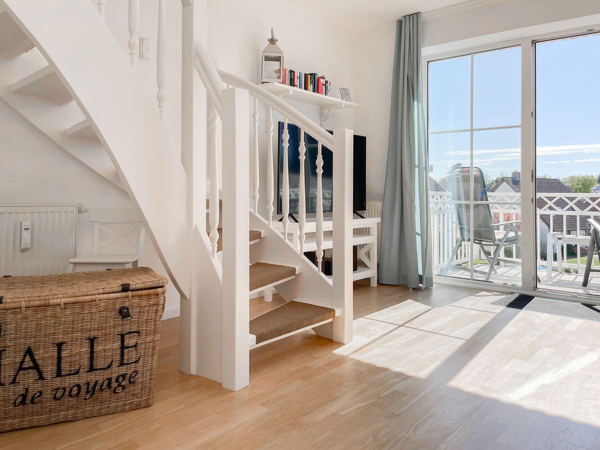 Die Ferienwohnung Ankerplatz[nbsp] liegt[nbsp] in der 2. Etage im Haus Sonnenpark und erstreckt sich über 2 Wohnebenen bis ins Dachgeschoss. Ein herrlicher Sonnenbalkon, ausgestattet mit Gartenmöbeln und einer elektrischen Markise, verläuft über den[nbsp] gesamten Wohnbereich und bietet einen tollen Rückzugsort bis zum letzten Sonnenstrahl. Die frisch renovierte Wohnung verfügt über ein gelungenes Raumkonzept mit neuer Küche, neuem Duschbad und Gäste WC. Die Ausstattung ist hochwertig und bietet 4 Personen ausreichend Raum zum Wohlfühlen in Strandnähe. Es erwartet Sie ein heller, großzügiger Wohnraum mit bodentiefen Fensterflächen, geschmackvoll gestaltet und mit einem komfortablen Sofa und zwei Sesseln eingerichtet, TV, Hifi-Anlage und ein Essbereich mit ausreichend Platz für 4 Personen. WLAN steht selbstverständlich zur kostenlosen Nutzung zur Verfügung. Die integrierte Küche ist bestens ausgestattet, unter anderem mit Spülmaschine, Backofen, Nespressomaschine und vielem mehr. Im Eingangsbereich befindet sich eine Garderobe und ein separates Gäste WC. Auf der oberen Ebene, die über eine Treppe vom Wohnbereich zu erreichen ist, bietet die Wohnung zwei separate Schlafzimmer mit Doppelbetten (180x200), Kleiderschränken und Verdunkelungsvorhängen sowie ein äußerst großzügiges, modernes Duschbad mit einem Doppelwaschtisch und viel Tageslicht. Schlafzimmer 1 verfügt zusätzlich über einen TV und Schlafzimmer 2 über einen Schreibtisch und das Bett besteht aus 2 Einzelbetten, die beliebig zusammengeschoben oder getrennt genutzt werden können.