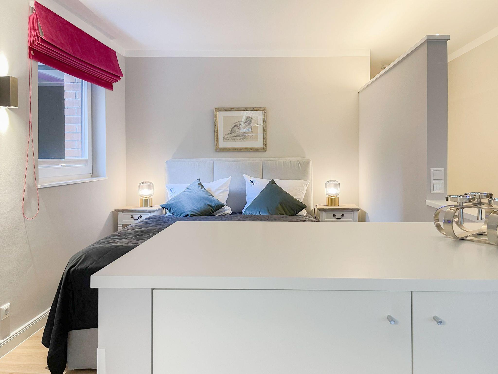 Es erwartet Sie eine hochwertig eingerichtete und bestens ausgestattete Ferienwohnung im Hochpaterre, die höchsten Wohnkomfort in einem schönen Ambiente zum Wohlfühlen bietet. Durch die Öffnung des Schlafzimmers zum Wohnbereich, optisch getrennt durch halbhohe Einbauten, sind großzügige, lichte Räumlichkeiten entstanden, eingerichtet mit einem hochwertigen Boxspringbett (160x200) und einen bequemen Sofa mit Schlaffunktion (160x200). Die Fenster sind mit Verdunkelungsplissees versehen und ausreichend Stauraum bietet ein Einbauschrank. Der überdachte Balkon gen Süden, ausgestattet mit einem Strandkorb und Gartenmöbeln, bietet einen schönen Blick ins Grüne. Die großzügige, offene Wohnküche in bester Ausstattung lädt zum gemeinsamen Kochen ein und der anschließende Essbereich bietet ausreichend Platz für 3 Personen. Das neue Bad mit großformatigen Fliesen ist modern mit Walk In Dusche, Waschtisch, WC und Handtuchtrockner. WLAN steht selbstverständlich zur kostenlosen Nutzung zur Verfügung.