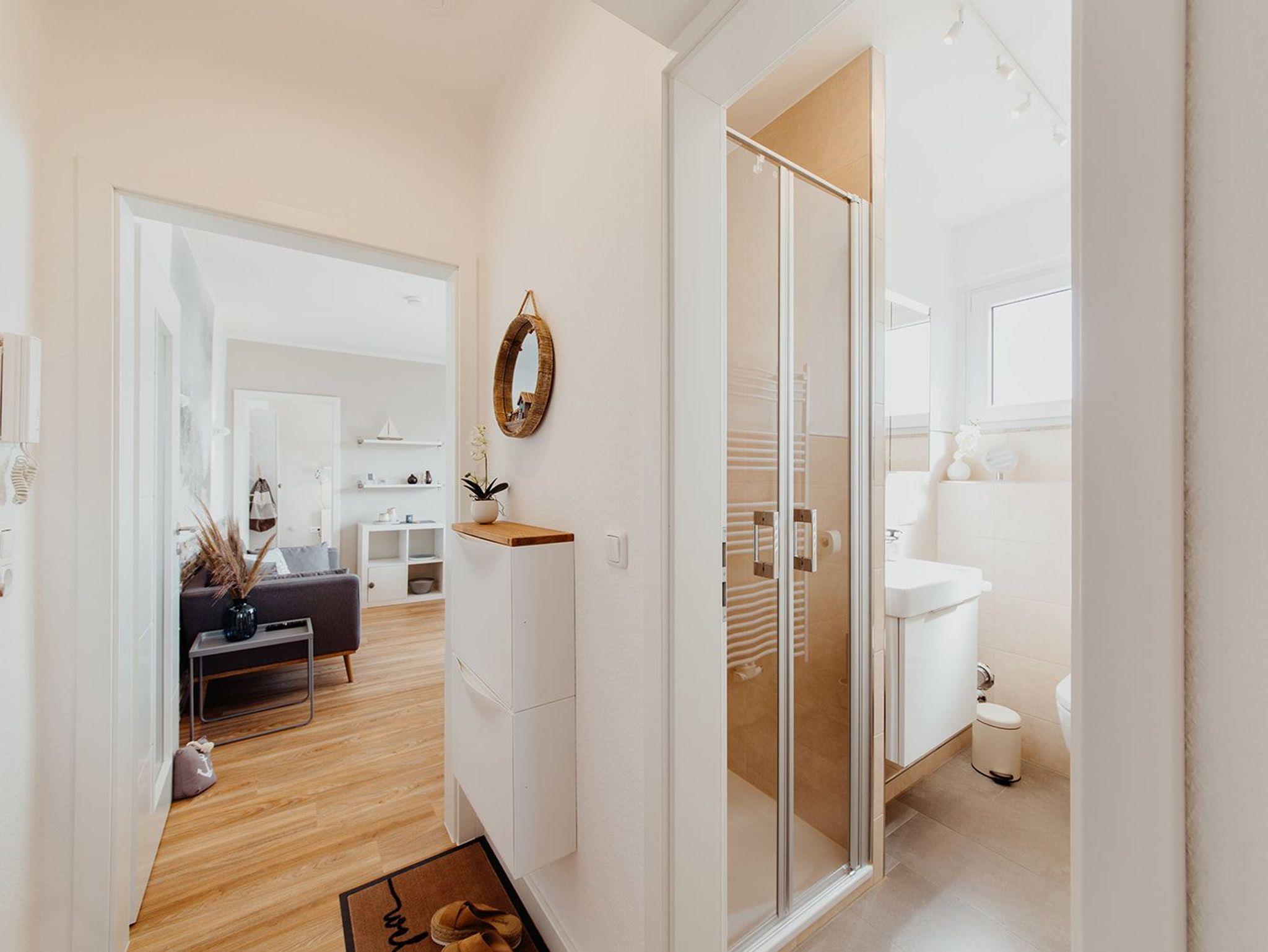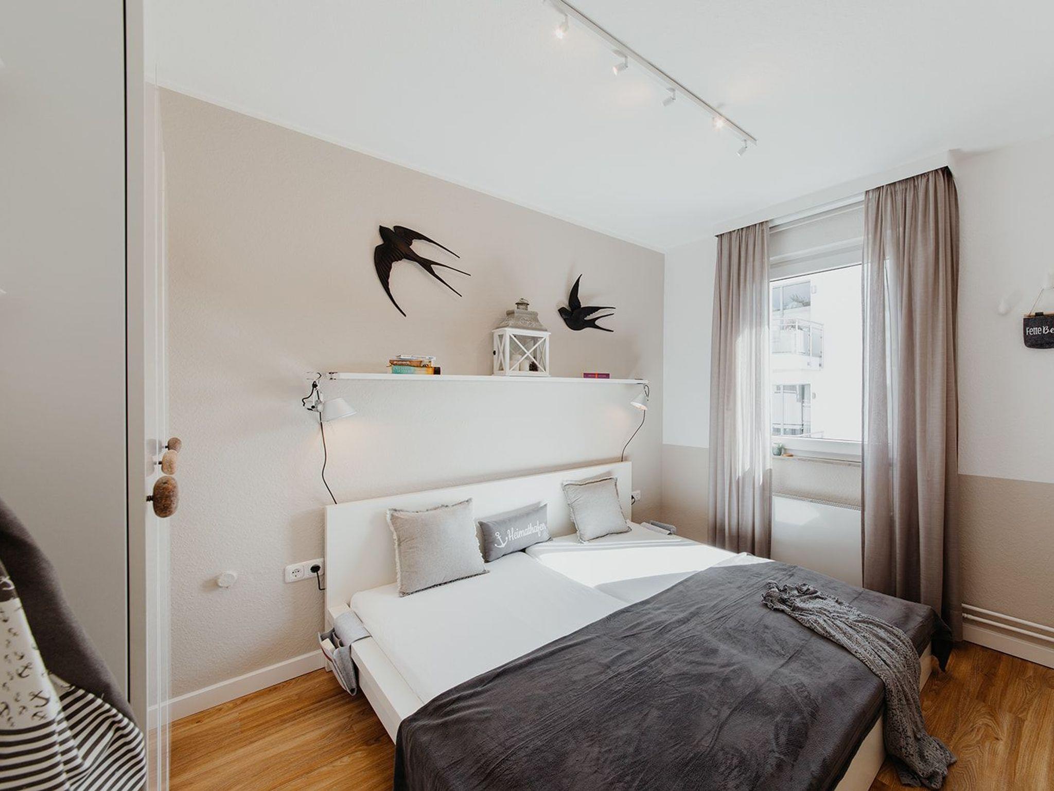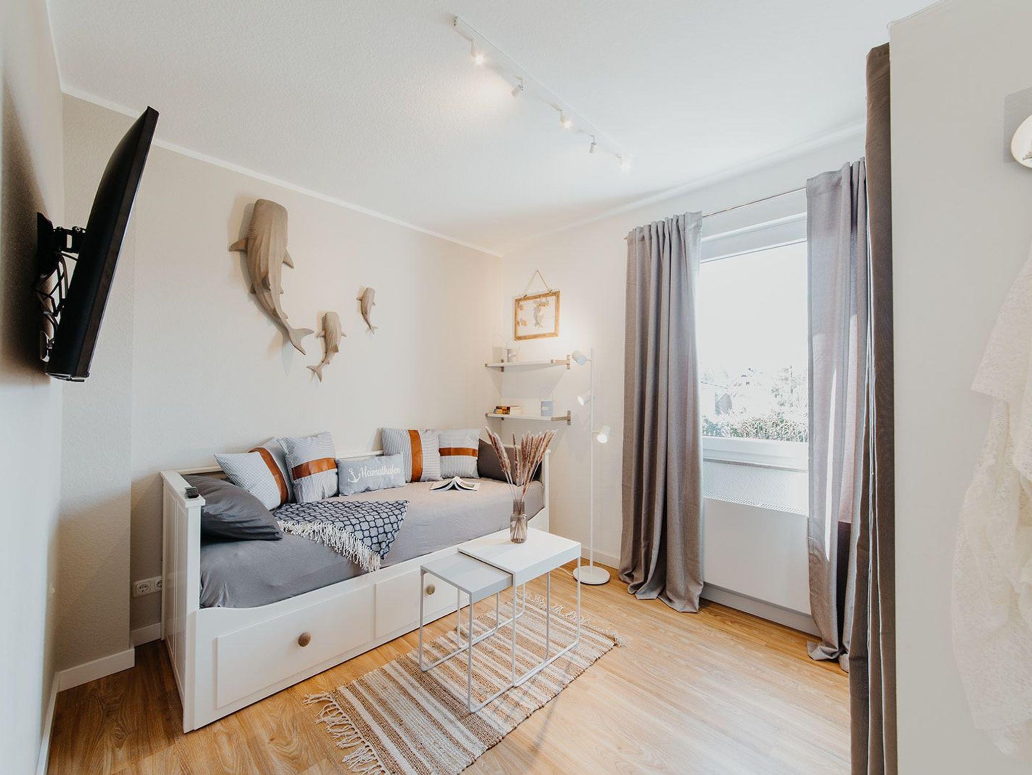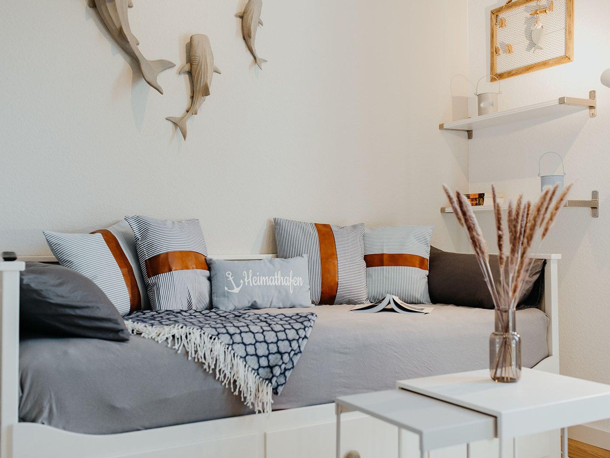 Klein aber fein, hell und freundlich und gespickt mit vielen liebevollen Details präsentiert sich die Ferienwohnung No. 188. Jeder qm ist optimal genutzt und mit ausreichend Ablageflächen, Stauraum und Haken versehen. Es gibt zwei separate Schlafzimmer, ausgestattet mit Doppelbett (180x200), Einzelbett mit Auszug (160x200), Verdunkelungsvorhängen und TV. Strandflair pur ist im Wohnbereich zu finden, der mit einem Sofa und einem Essbereich für 4 Personen ausgestattet ist. Die integrierte kleine Einbauküche fügt sich wunderbar ein und ist bestens ausgestattet. Vom vorgelagerten Sonnenbalkon mit elektrischer Markise und Gartenmöbeln kann man die Ostsee nicht nur hören sondern auch blitzen sehen.