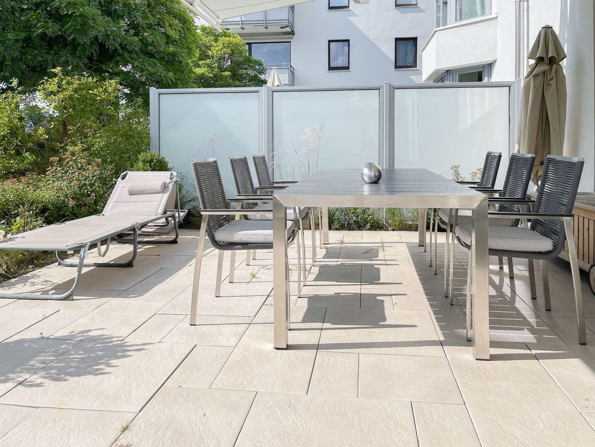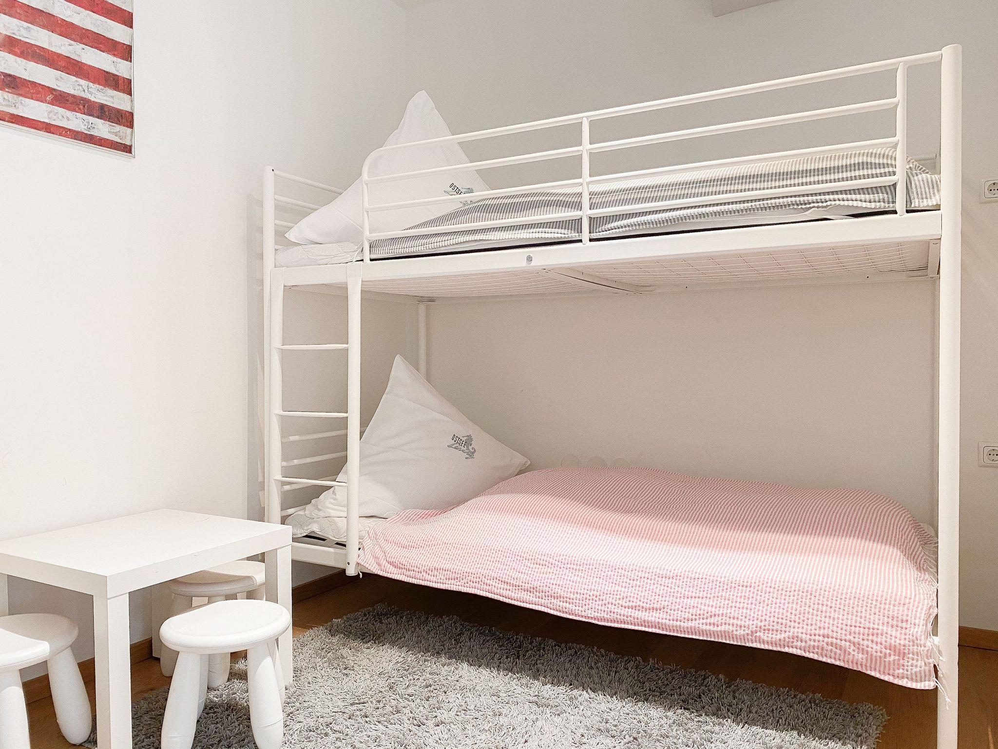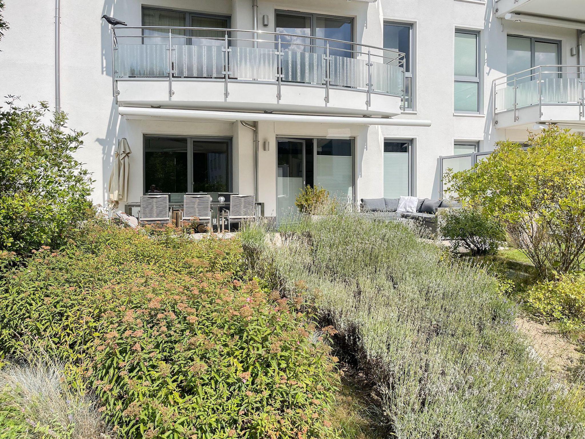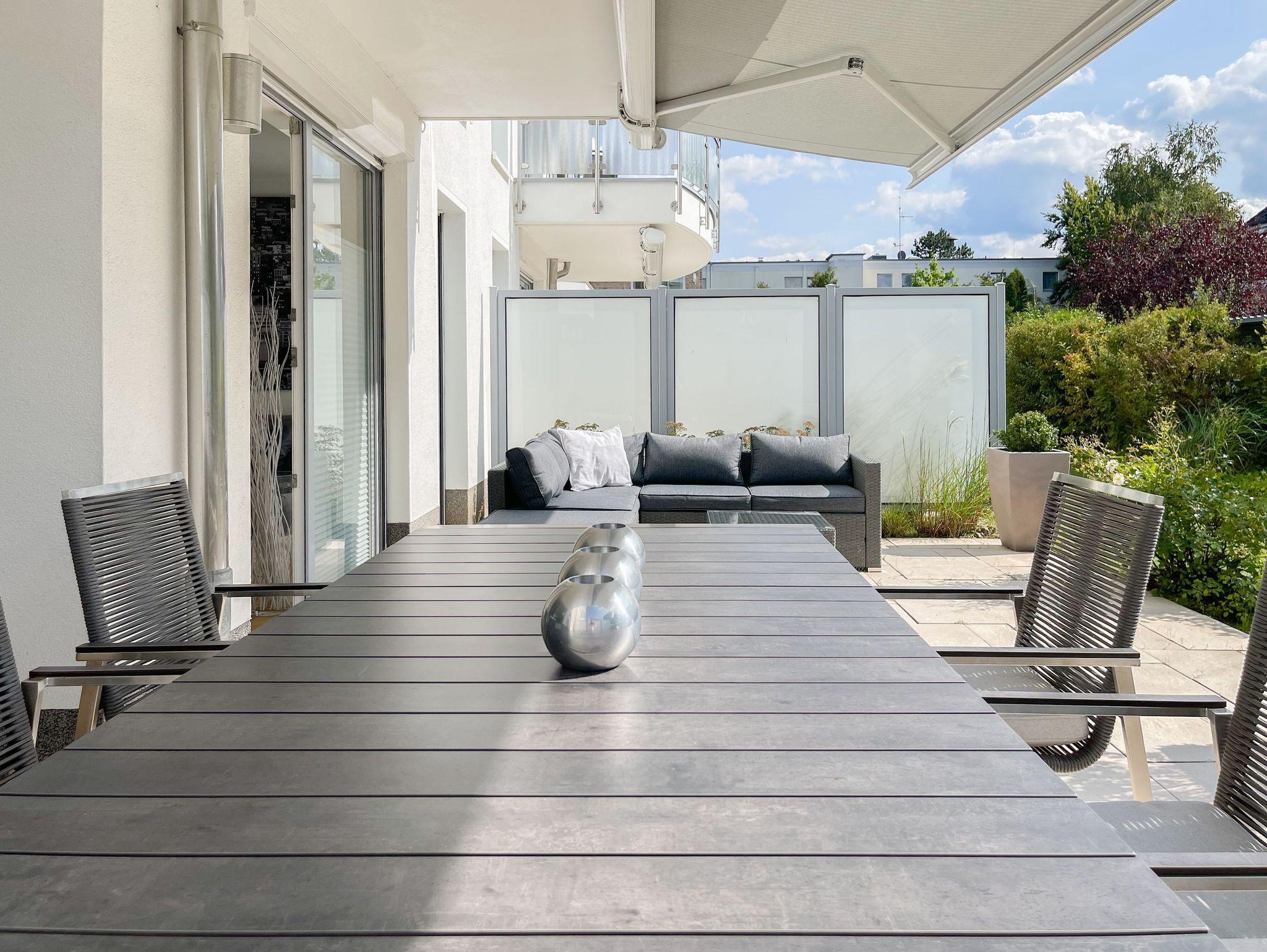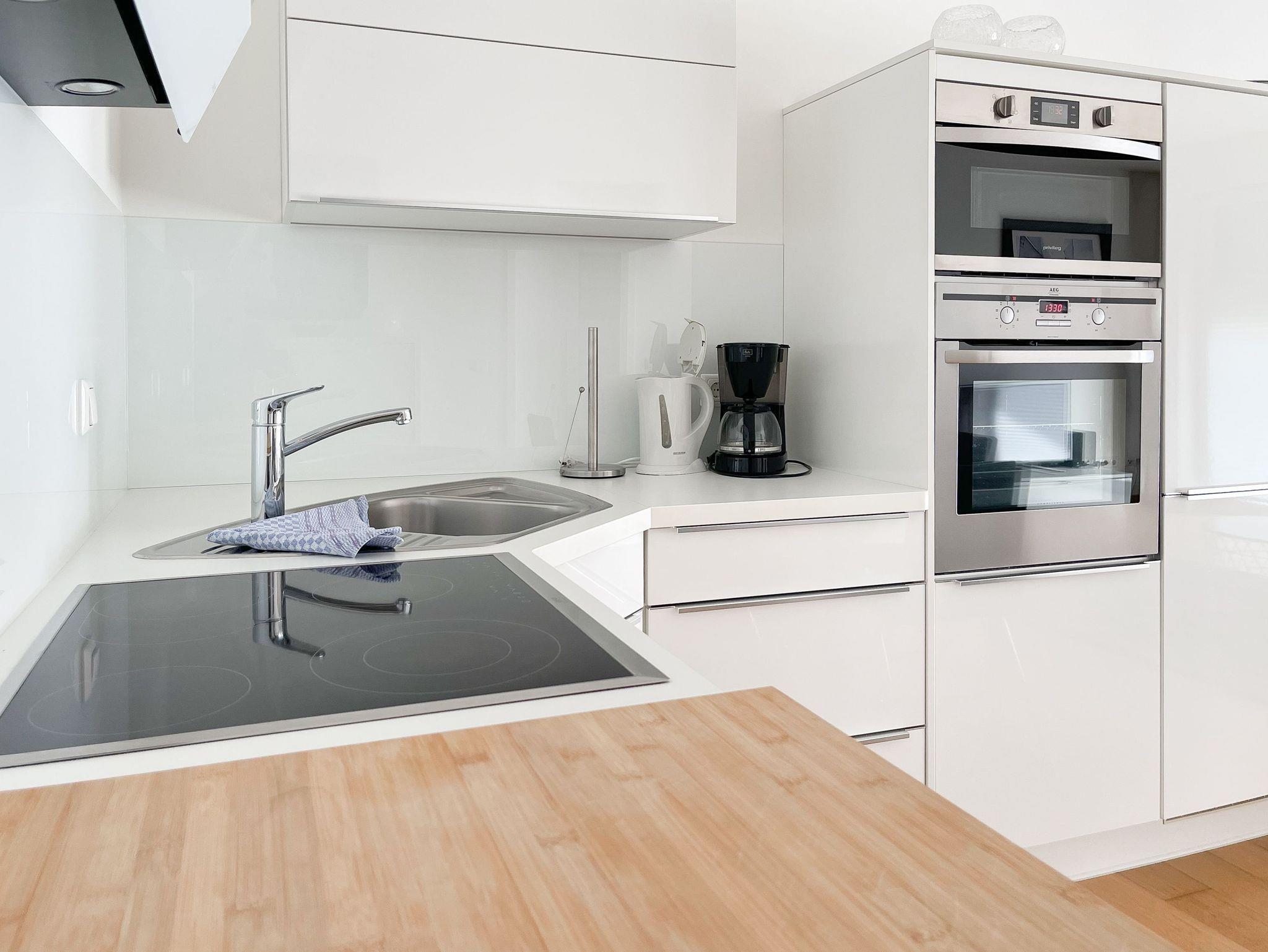 Die Wohnung ist komplett mit Echtholzparkett und Fußbodenheizung ausgestattet. Sie verfügt über einen hellen, freundlichen Wohnraum mit gemütlicher Sitzecke, TV, Radio und WLAN sowie einer offenen, gut ausgestatteten Küche mit angrenzendem Essbereich. Ein Schlafzimmer mit Doppelbett sowie ein weiteres, kleines, innenliegendes Schlafzimmer mit Etagenbett stehen zur Verfügung. Das Bad ist modern und luxuriös. Die 30 qm große Terrasse ist zum Süden ausgerichtet und mit gemütlichen Lounge Möbeln und Essbereich ausgestattet und verfügt über eine elektrische Markise. Sämtliche Fenster sind bodentief und mit elektrischen Außenjalousien versehen. Ein PKW Stellplatz befindet sich in der hauseigenen Tiefgarage.