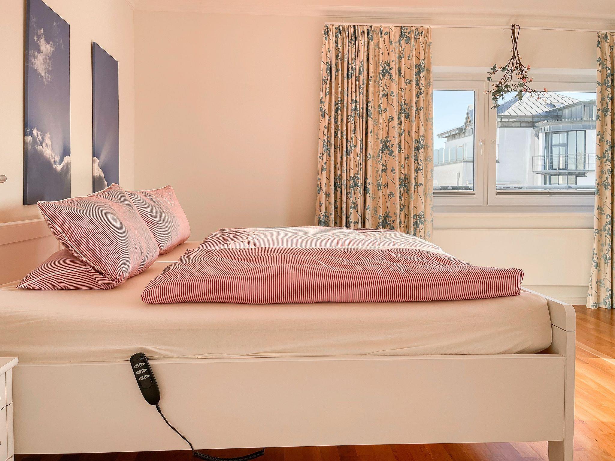 Mittelpunkt der Wohnung bildet die gemütliche Wohnküche mit integriertem Essbereich und Zugang auf die kleine Dachterrasse in westlicher Ausrichtung. Genießen Sie hier die letzten Sonnenstunden bei einem Glas Wein mit herrlichem Blick auf den Kurpark. Der anschließende Wohnbereich ist mit zwei Sofas, TV und einem bequemen Relaxsessel ausgestattet. Es gibt 2 separate Schlafzimmer, die beide mit Doppelbetten (200x200 und 180x200), Kleiderschränken mit ausreichend Stauraum sowie Verdunkelungsplissees und zusätzlichen Verdunkelungsvorhängen ausgestattet sind.[nbsp] Schlafzimmer 1 verfügt zusätzlich über elektromotorisch verstellbare Lattenroste (200x200) und Zugang auf die große Dachterrasse 2 in südlicher Ausrichtung mit Gartenmöbeln, Strandkorb (für 1 Person) und kleinem Meerblick. Schlafzimmer 2 mit einem weiteren TV bietet den Zugang zu Dachterrasse 2 in nordwestlicher Ausrichtung, ebenfalls mit kleinem Meerblick. Das großzügig angelegte Bad verfügt über Badewanne, Dusche, Waschtisch und einen kombinierten Waschtrockner. Ein separates Gäste WC ist ebenfalls vorhanden. WLAN steht selbstverständlich zur kostenlosen Nutzung zur Verfügung.