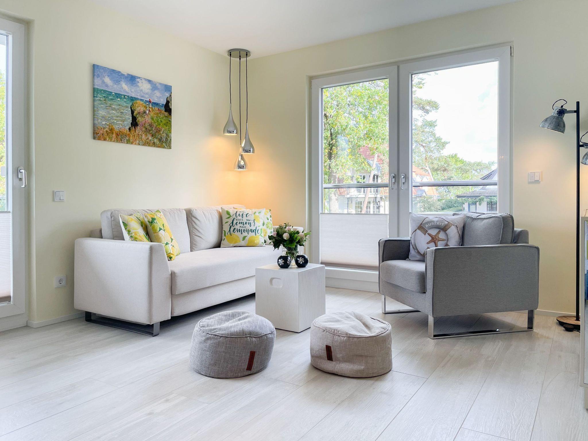 Es erwartet Sie ein heller Wohnbereich zur Seeseite, der mit einem bequemen Boxspring-Sofa mit Schlaffunktion, Smart TV und einem gemütlichen Cocktail-Sessel eingerichtet ist. Genießen Sie den schönen Ausblick bis auf die Ostsee, die durch die Bäume blitzt. Die hochwertige Küche in perfekter Ausstattung läßt definitiv keine Wünsche offen. Das Bora-Kochfeld sorgt für geruchs- und dunstfreies Kochvergnügen und die Kühl-Gefrierkombination bietet ausreichend Platz für Ihre Leckereien. Umluftbackofen und Geschirrspüler befinden sich angenehm auf Armhöhe. Der anschließende Essbereich mit gemütlichen Sesseln bietet ausreichend Raum für gemeinsame Mahlzeiten. Ein Highlight ist der 14 qm große Balkon mit windgeschützter Loggia in Nordwestausrichtung, der sowohl vom Wohnbereich als auch von der Küche zu betreten ist. Ein Strandkorb und Gartenmöbel laden nach einem ereignisreichen Urlaubstag zum Entspannen ein. Genießen Sie die Nachmittagssonne bis zum Sonnenuntergang mit schönem Blick teilweise bis zur Ostsee. Das Schlafzimmer verfügt über ein Boxspringbett (180x200), einen Kleiderschrank mit reichlich Stauraum und Smart TV. Das neue Luxusbad bietet Ihnen eine Waschtischanlage mit 2 Waschplätzen und die großzügige Dusche verfügt über einen Regen- und eine verstellbare Funktions-Handbrause. Direkt am Eingang der Dusche ist ein Handtuchwärmer angebracht, der für kuschelig warme Badetücher sorgt. Eine Waschmaschine ist ebenfalls im Bad untergebracht.