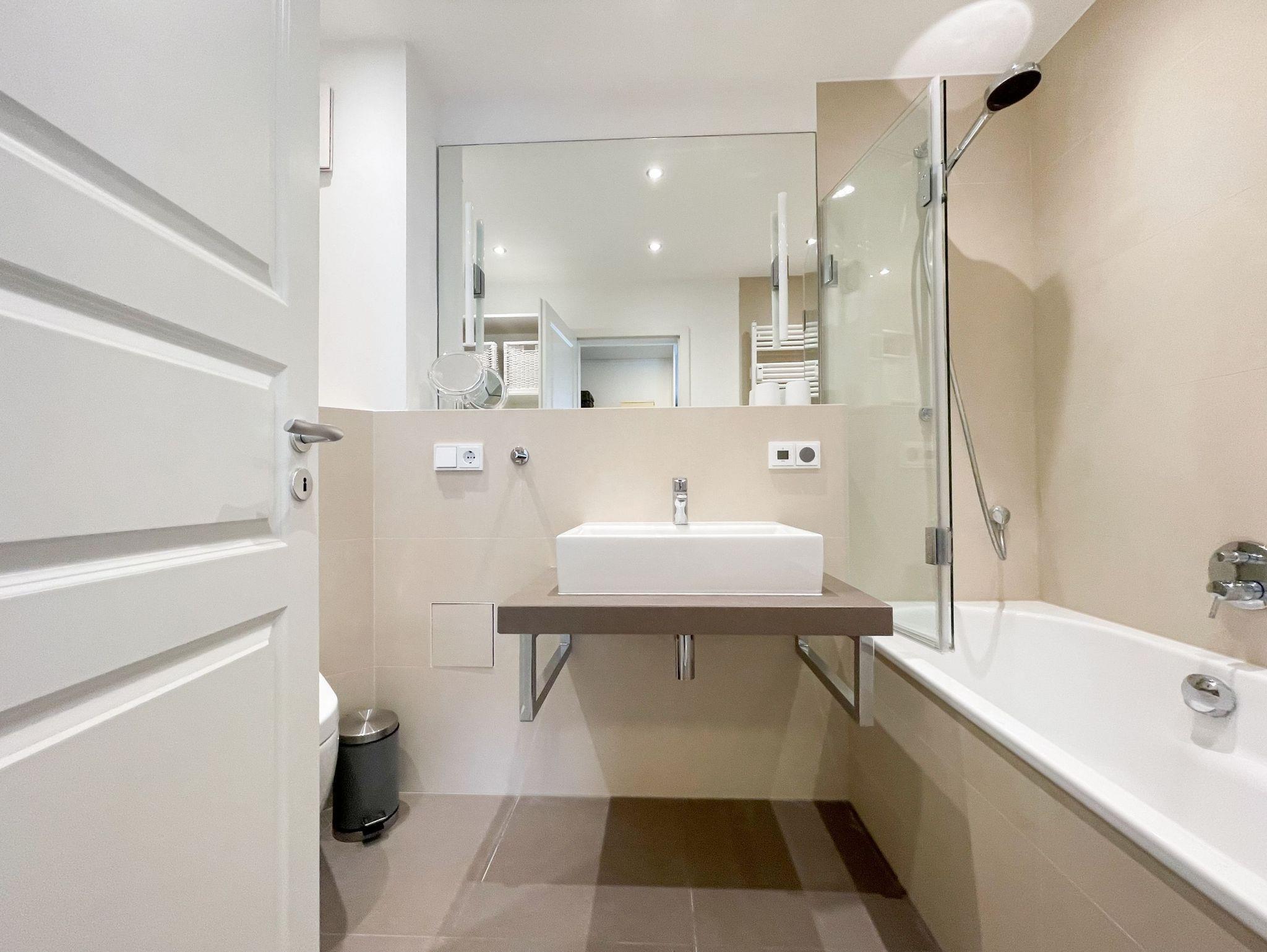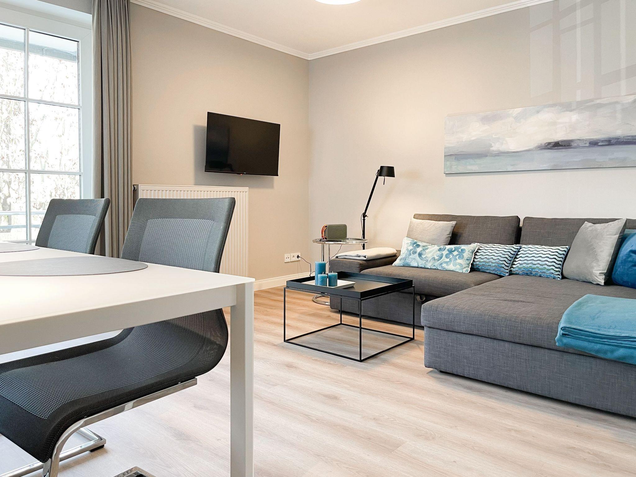 Frisch und aufwendig renoviert und äußerst geschmackvoll eingerichtet in 2024, erwartet Sie der Küstenschatz, um den wohlverdienten Urlaub in großartigem Ambiente zu verbringen. Der Innenarchitektin ist es gelungen, unter Verwendung warmer Farben, hochwertigem Mobiliar und passgenauen Einbauten einen hohen Wohnstandard zu schaffen, der höchsten Ansprüchen genügt. Ein Highlight ist der großzügige, umlaufende Eckbalkon in Nordwestausrichtung mit herrlichem Blick in den Kurpark, mit Sonnenschein vom Nachmittag bis zum Sonnenuntergang. Der stilvolle Wohnbereich ist mit einem Schlafsofa, TV und Bluetooth-Lautsprecher ausgestattet und der anschließende Essbereich bietet ausreichend Raum für 4 Personen. Die äußerst hochwertige Designküche in perfekter Ausstattung fügt sich wunderbar in den Wohnraum ein und verfügt unter anderem über Spülmaschine, Backofen, Mikrowelle, Cerankochfeld, Radio und vieles mehr. Das Schlafzimmer ist mit einem Doppelbett (160x200) sowie einem passgenauen Einbauschrank mit integriertem TV eingerichtet. Das Fenster lässt sich mittels Rollo verdunkeln. Das moderne Bad ist mit Waschtisch, WC und Duschwanne ausgestattet. WLAN steht selbstverständlich zur Verfügung.