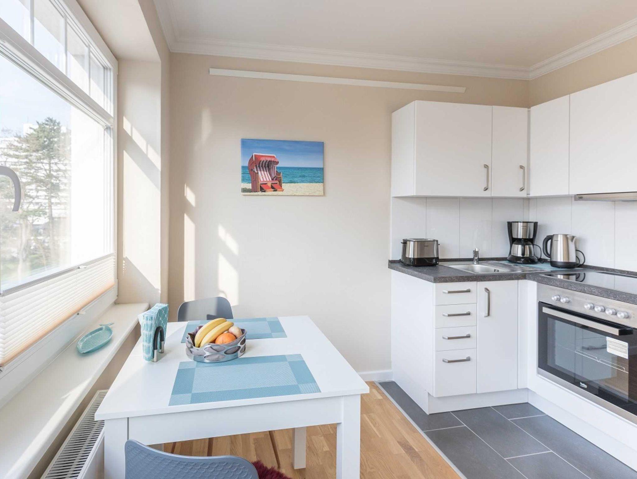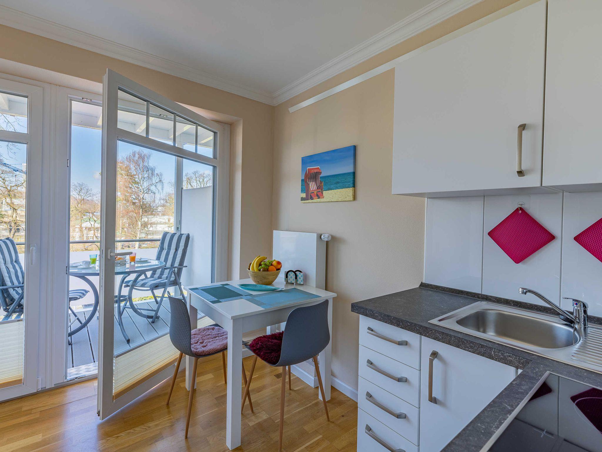 Unser ca. 26 qm großes Apartment Seepferdchen befindet sich im 2. Obergeschoss. Die Küche ist voll ausgestattet und im Bad liegt der Fön bereit – natürlich mit direktem Zugang zum Balkon.